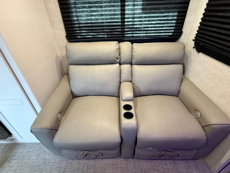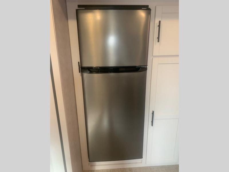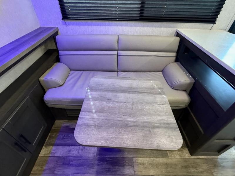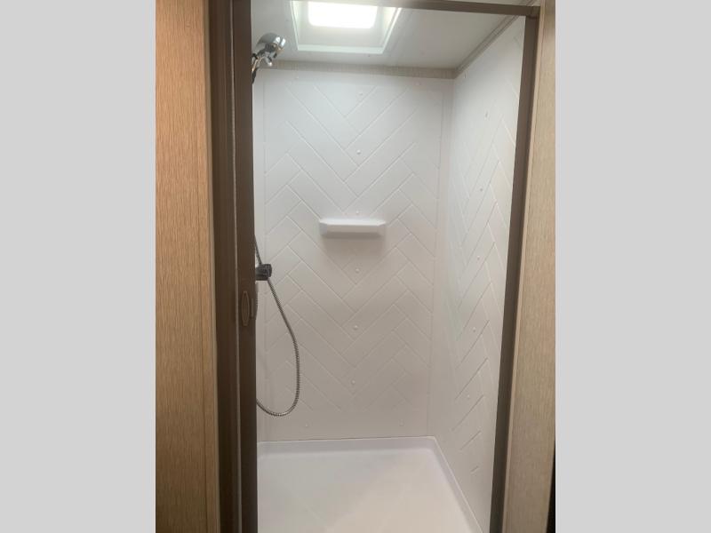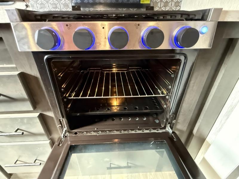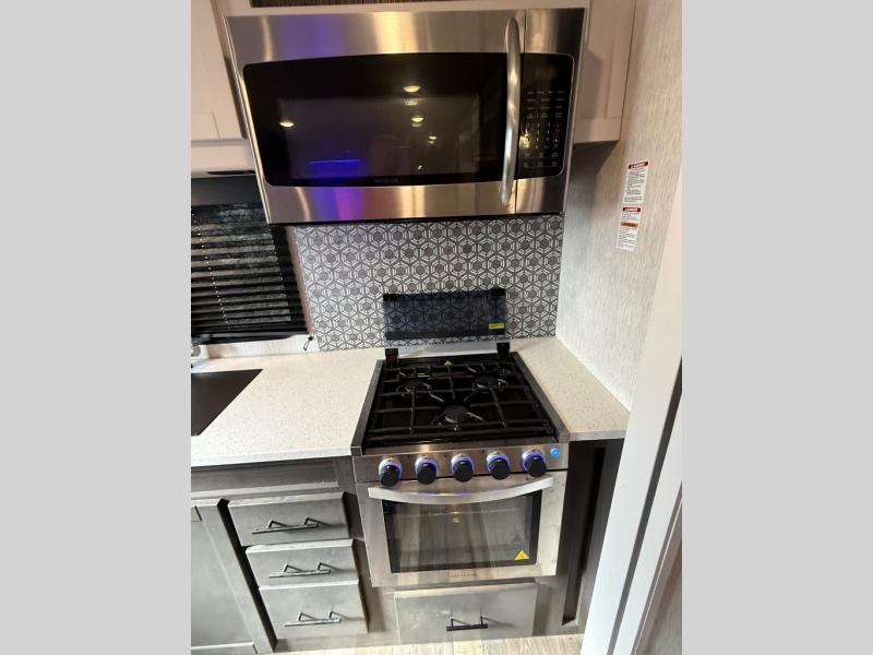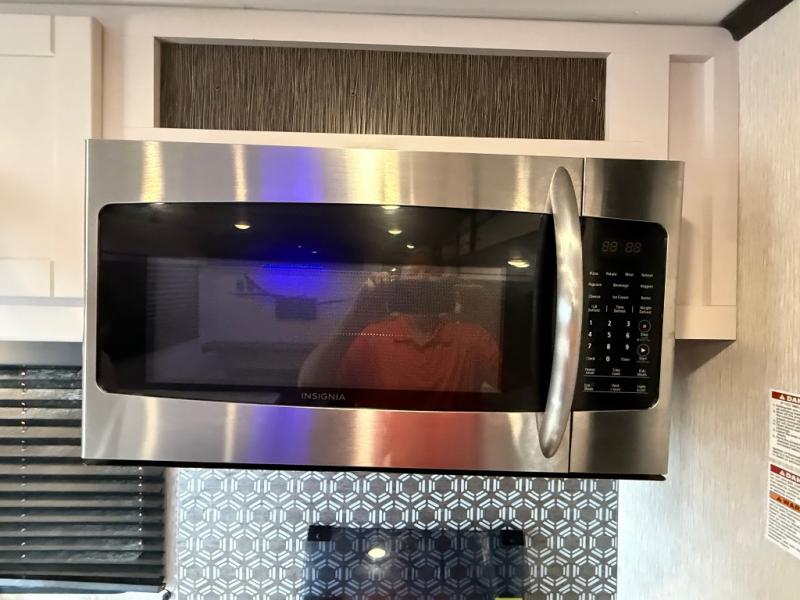 This travel trailer is full of great features, but it's the kitchen that really stands out. With unique features like a built-in spice rack and a breakfast bar for seating, you'll love this layout. There's plenty of room to move around, and the appliances are almost as good as those you have at home, with an 11 cu. ft. refrigerator, 21" gas oven with glass cover, and a 30" over the range microwave. After dinner you can enjoy the entertainment features like the 50" TV and the AM/FM/Bluetooth stereo system. A jack knife sofa and a trifold sofa are standard, but you can choose to swap the tri-fold for a pair of theater seats. A full bath with 30" x 36" shower and a private front bedroom with king bed complete this model.