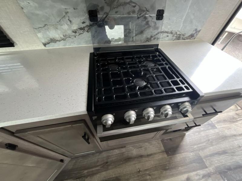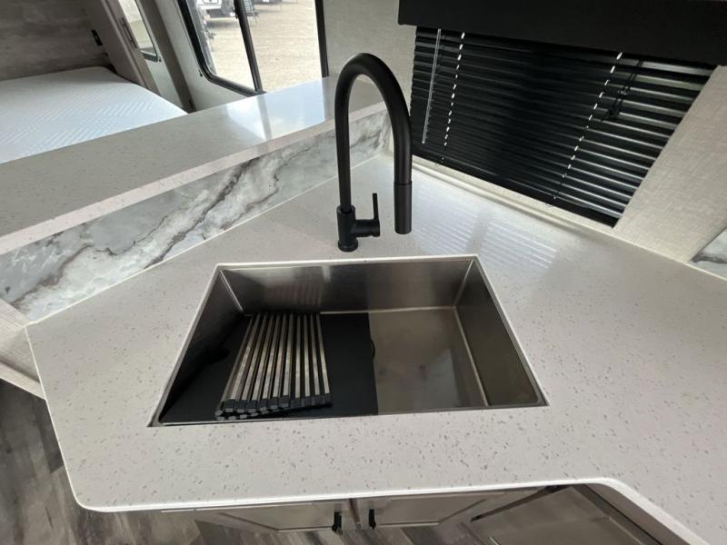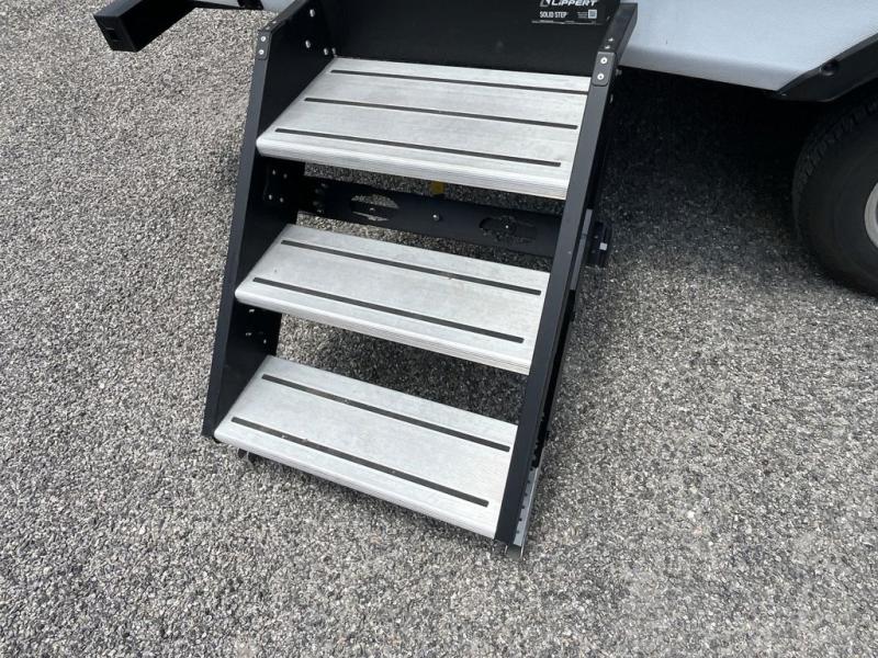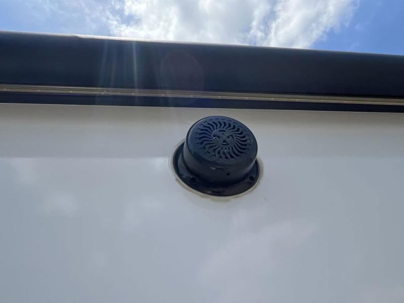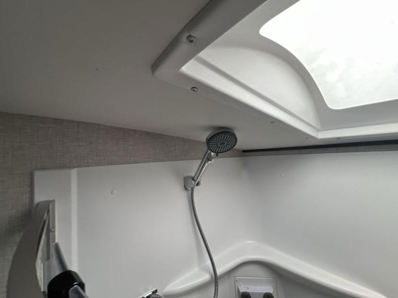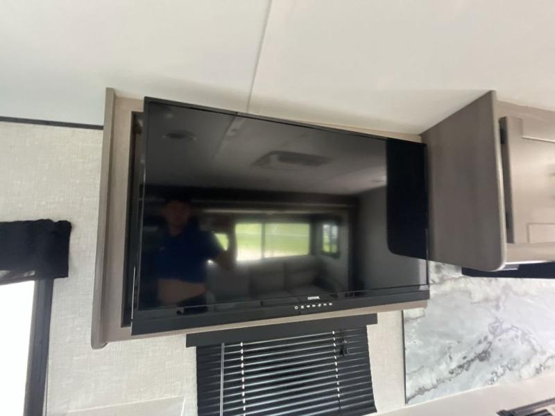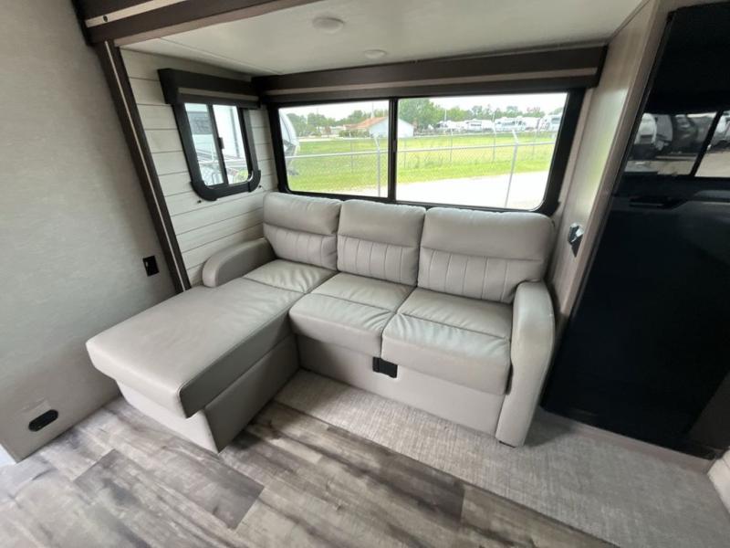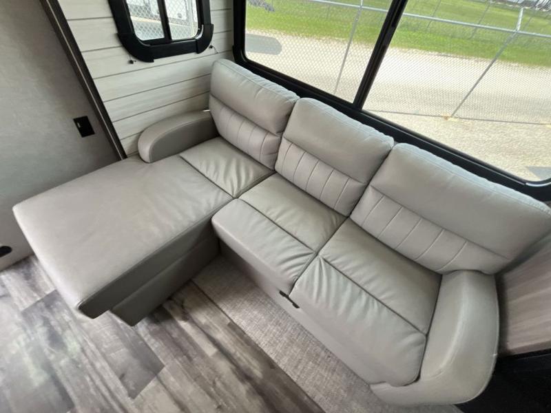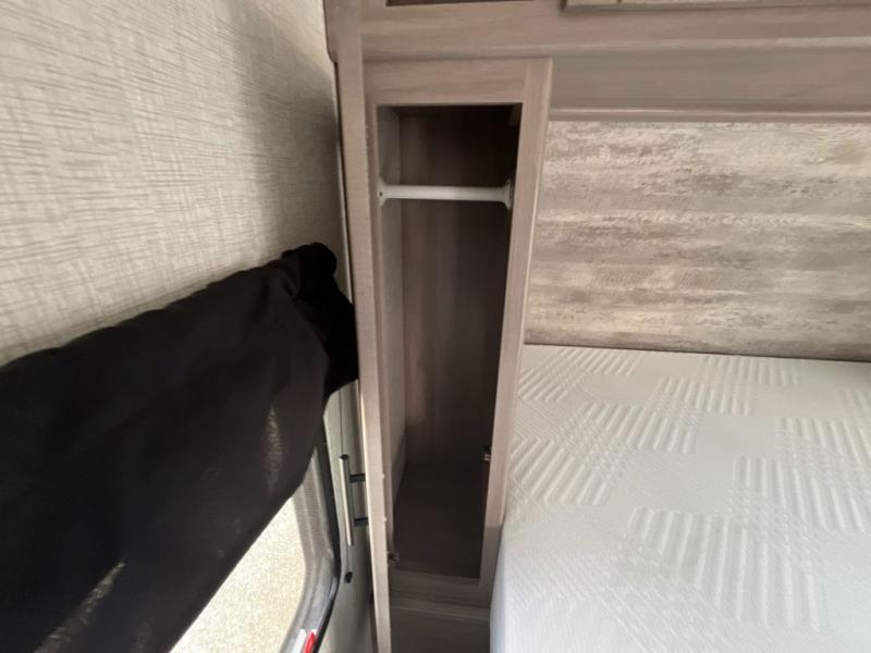 Nothing says luxury like a king bed in the front bedroom, plus a slide out for added interior space. Your crew can relax on the tri-fold sofa and chaise lounge before heading off to find a trail or two. There is a convenient shoe storage and pet station for your furry friends, and the dual wardrobes can store all your clothes for the week. Freshen up in the full bath that includes a shower skylight, then head to the kitchen to prepare a meal on the glass top range or use the handy stainless steel microwave. This model also includes a pantry just as you enter the unit, plus plenty of overhead compartments for all your belongings!