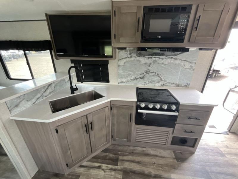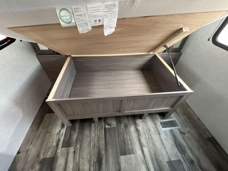 With any Sunset Trail travel trailer by CrossRoads RV, the interior offers a stainless steel farmhouse sink with a cover, solid surface kitchen countertops, and a docking station with 12 Volt, USB Port, and 110 Outlets. Also included is a 13,500 BTU air conditioner plus upgraded insulation with roof and floor reflective foil for added comfort, plus sturdy construction elements like a plywood bed board with strut assist, residential wood window trim, and hardwood cabinet doors. Make your lightweight and comfortable RV decision today!