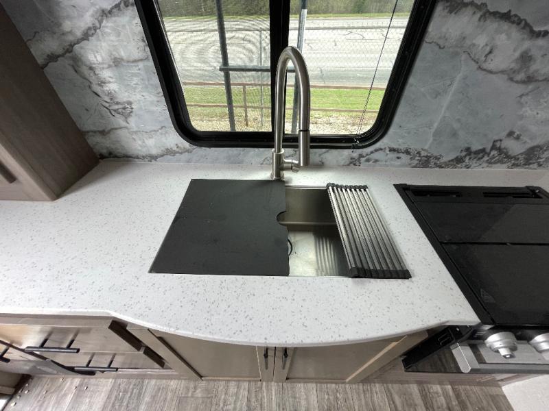 With any Sunset Trail travel trailer by CrossRoads RV, the interior offers a stainless steel farmhouse sink with a cover, solid surface kitchen countertops, and a docking station with 12 Volt, USB Port, and 110 Outlets. Also included is a 13,500 BTU air conditioner plus upgraded insulation with roof and floor reflective foil for added comfort, plus sturdy construction elements like a plywood bed board with strut assist, residential wood window trim, and hardwood cabinet doors. Make your lightweight and comfortable RV decision today!