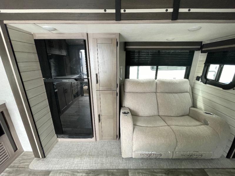 You will love this Sunset Trail rear kitchen layout with a large window over the sink. You can cook just like home with a three-burner cooktop and microwave oven, and dine at the 38" booth dinette inside. The dinette can also transform into added sleeping space if needed along with the 60" sofa found opposite within the single slide. A private bedroom up front features a second entry/exit door for convenience and a king size bed. There are wardrobes on either side of the bed, plus a third wardrobe near the entry door. A full bath features a 30" x 36" shower, toilet, and vanity with sink plus medicine cabinet above. When you are outside, your refreshments are just steps away under the powered awning in the exterior refrigerator.