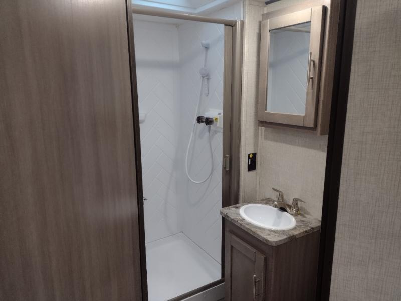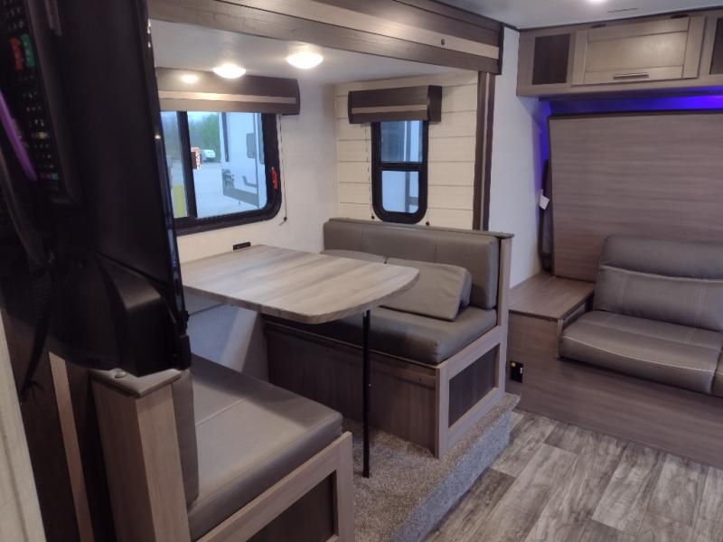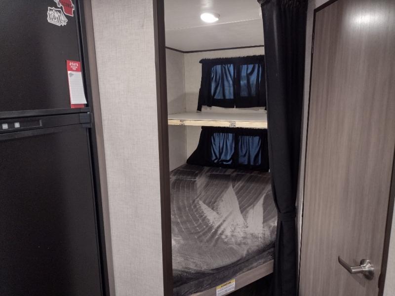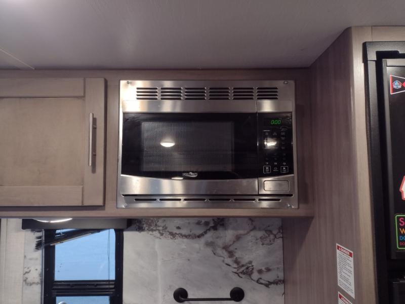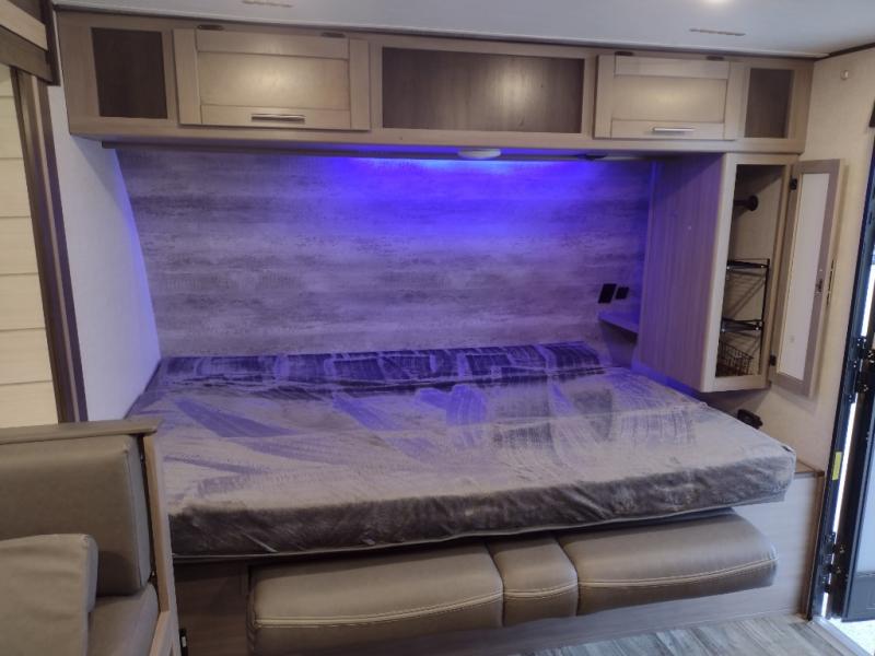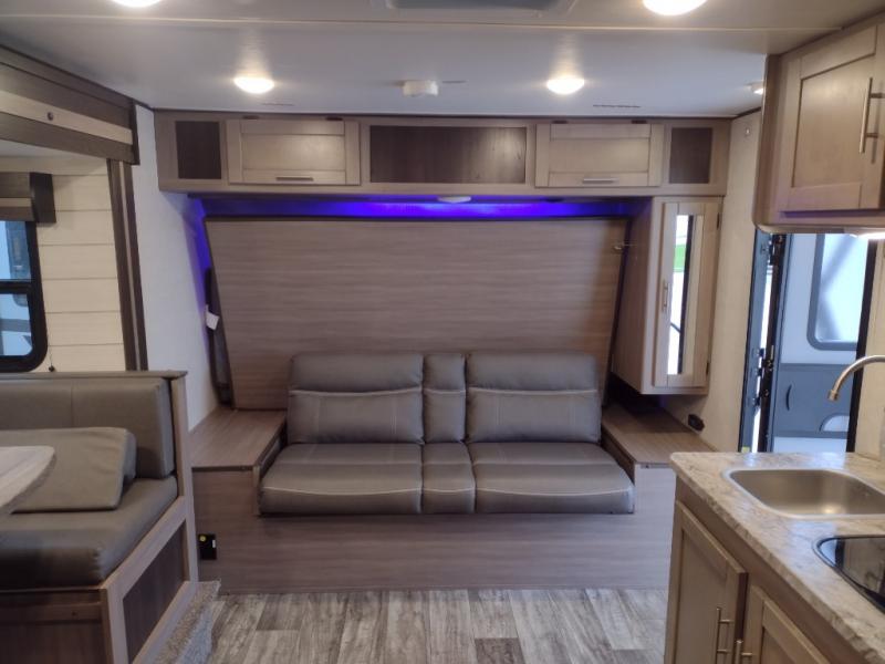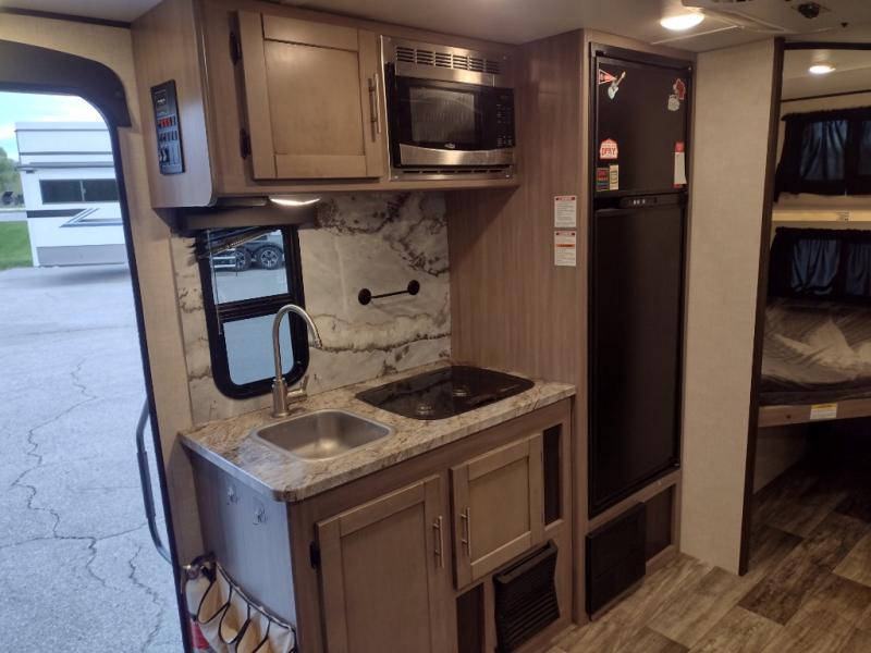 This travel trailer is easy-to-tow and can sleep seven people comfortably each night. You will love the versatile queen-size Murphy bed that can fold away to relax on the jackknife sofa during the day. The kids will love the 50" x 74" double-size bunk beds, and any other overnight guests can sleep on the slide out booth dinette. You can easily store your clothes in the wardrobe beside the Murphy bed, and the overhead cabinet in the kitchen will be perfect for snacks. This model also includes an outside kitchen refrigerator so you can grab a cold drink as you sit under the power awning with LED lights!