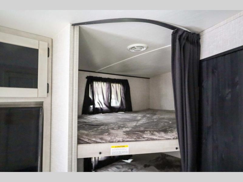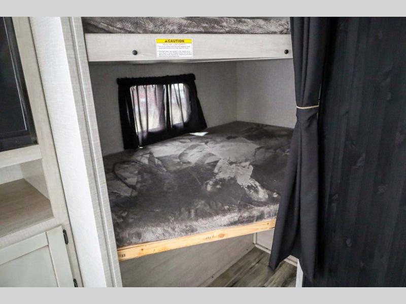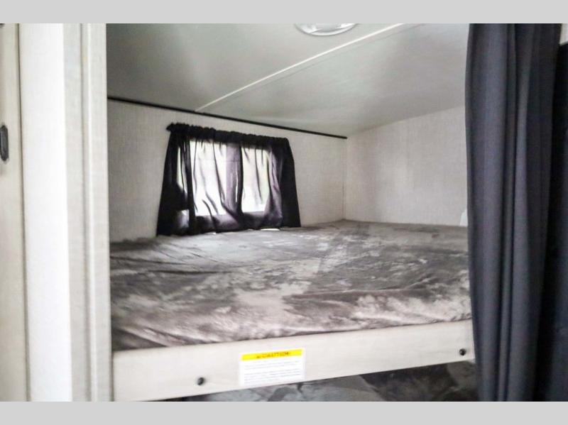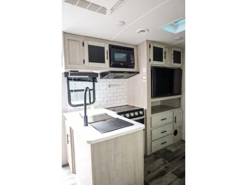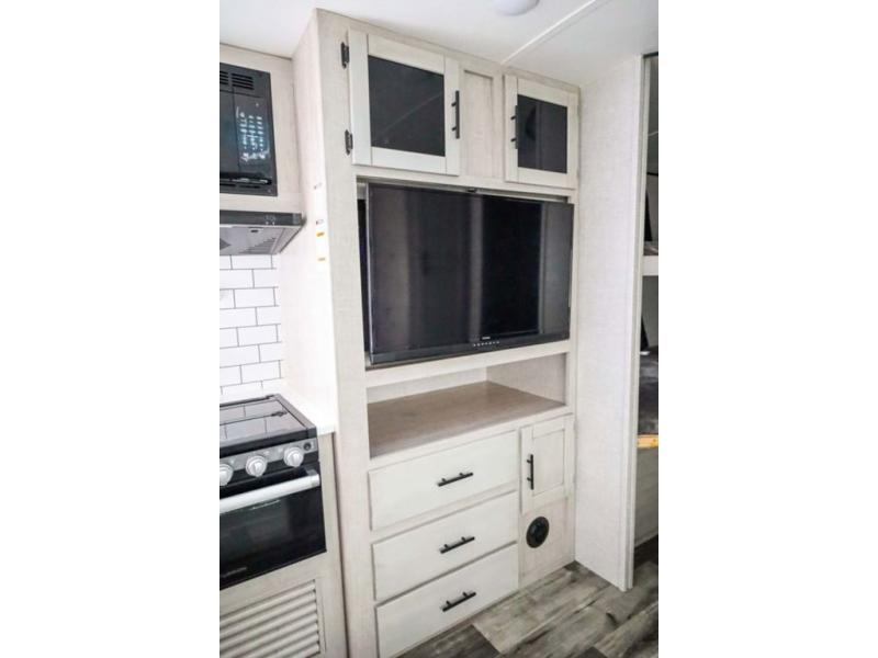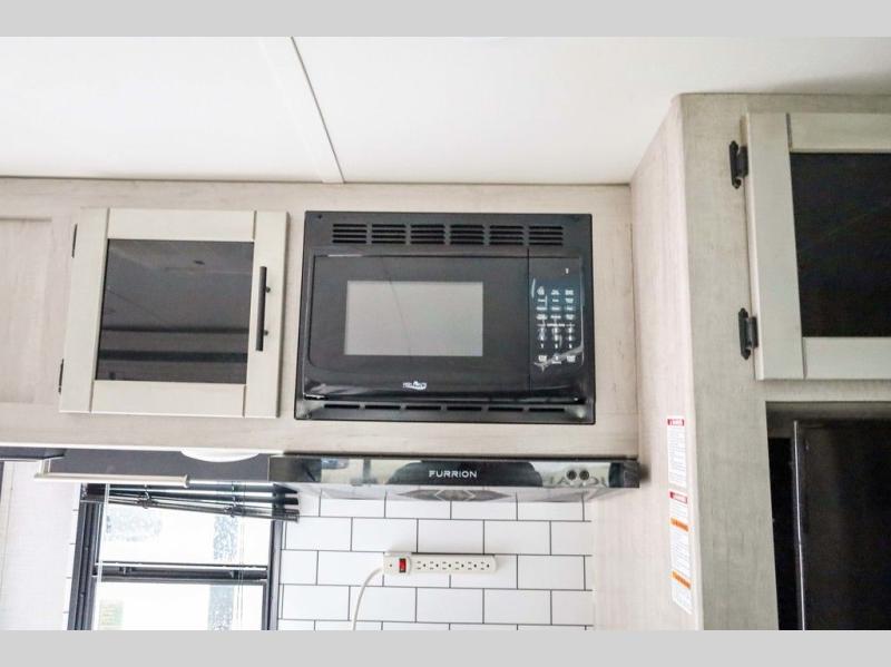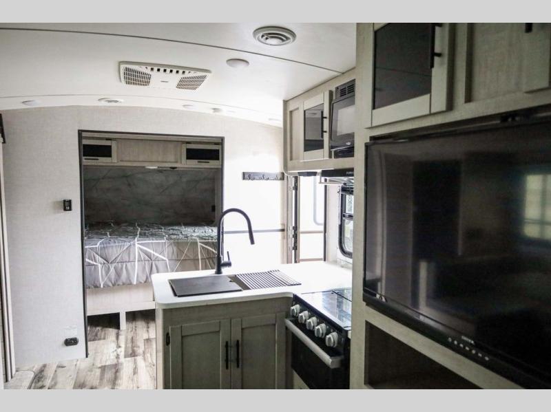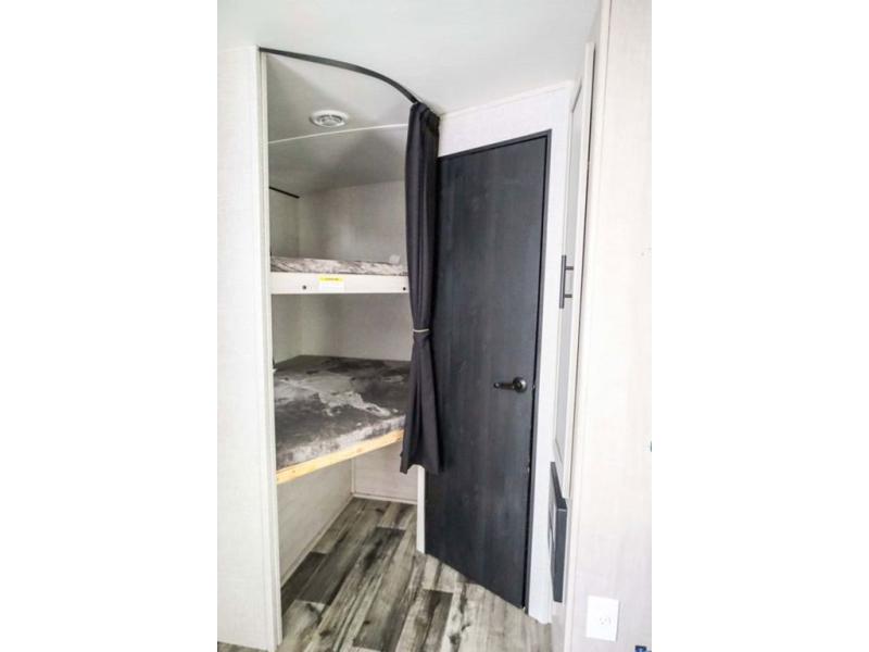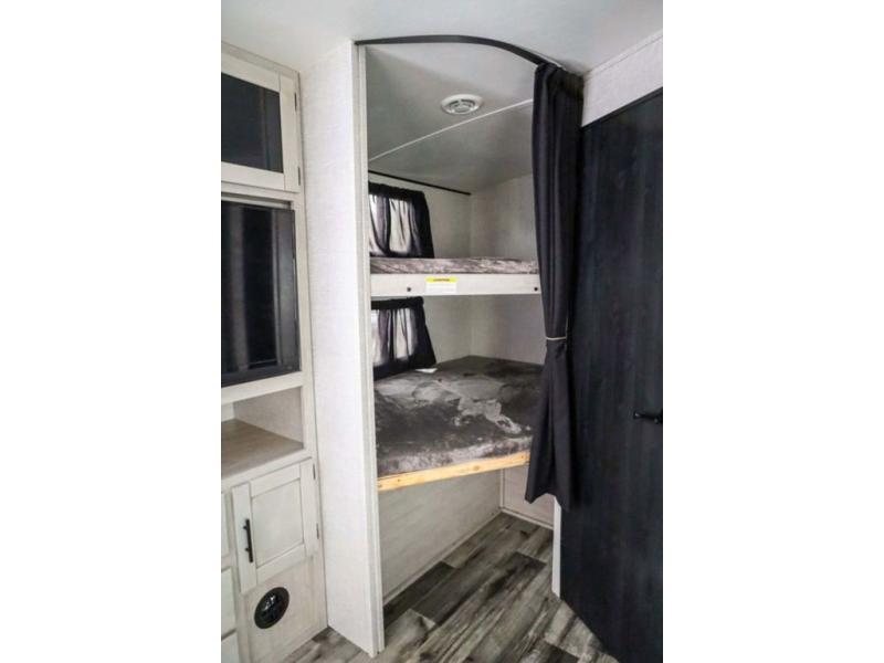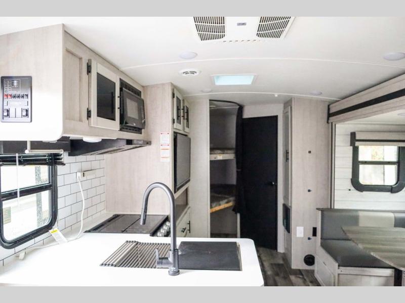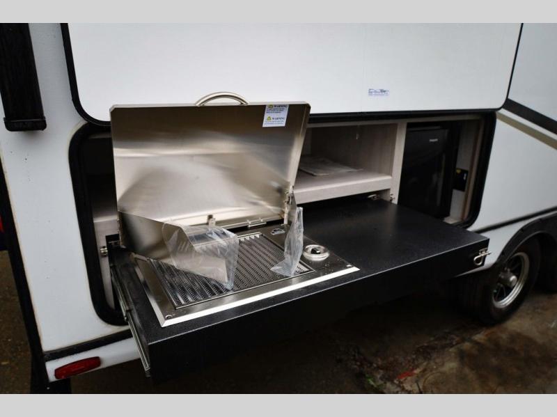 From the front private bedroom with a king bed and a slide out, to the rear corner bath and double-size bunks, you will love everything about this travel trailer. When you wake up in the morning you can prepare breakfast on the exterior camp kitchen, and if it's raining outside, the glass top range indoors will get the job done. There is also a stainless steel microwave for quick meals, and the wardrobe/pantry can store paper goods and the kids' cereal. Play a game of cards around the U-shaped dinette before heading off to bed in the front private bedroom!