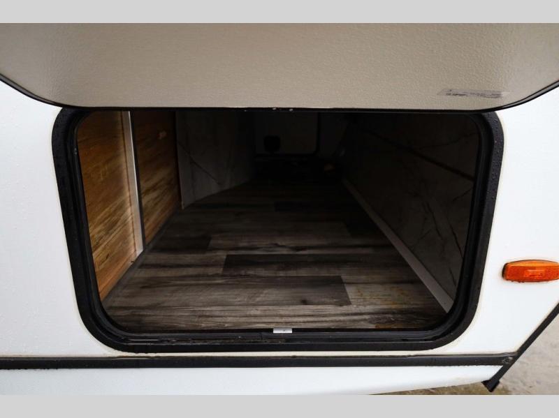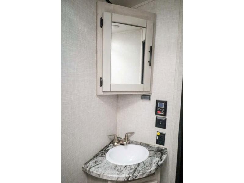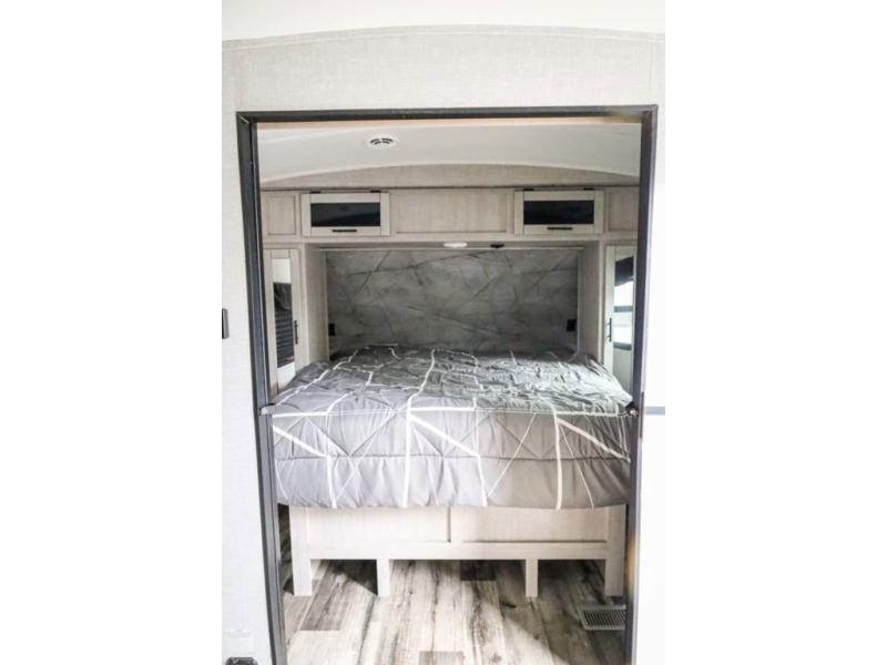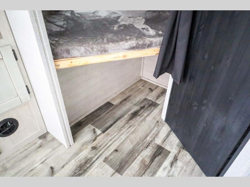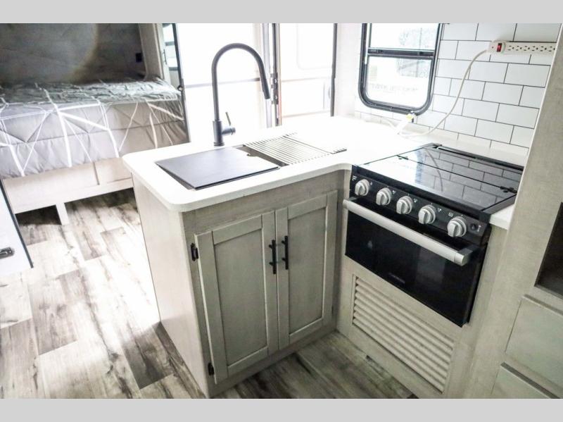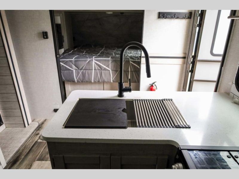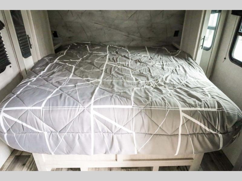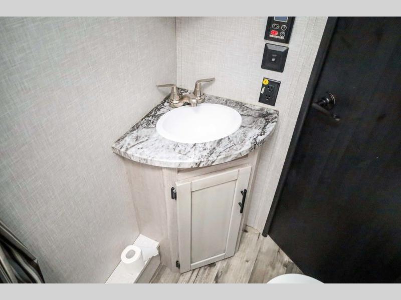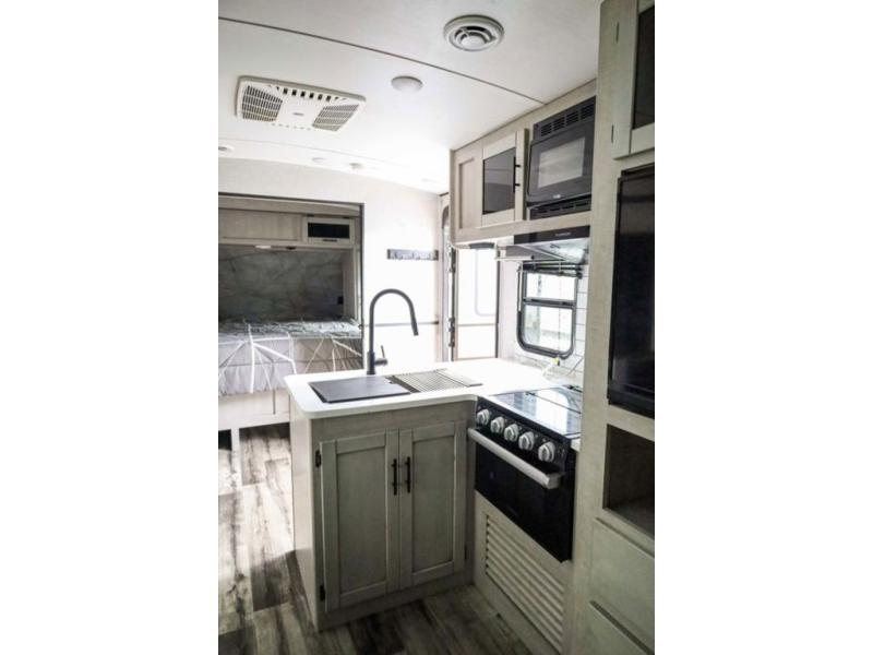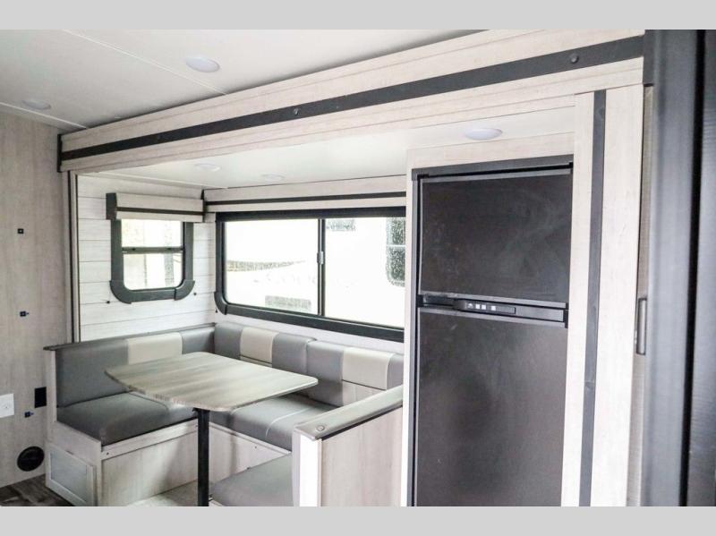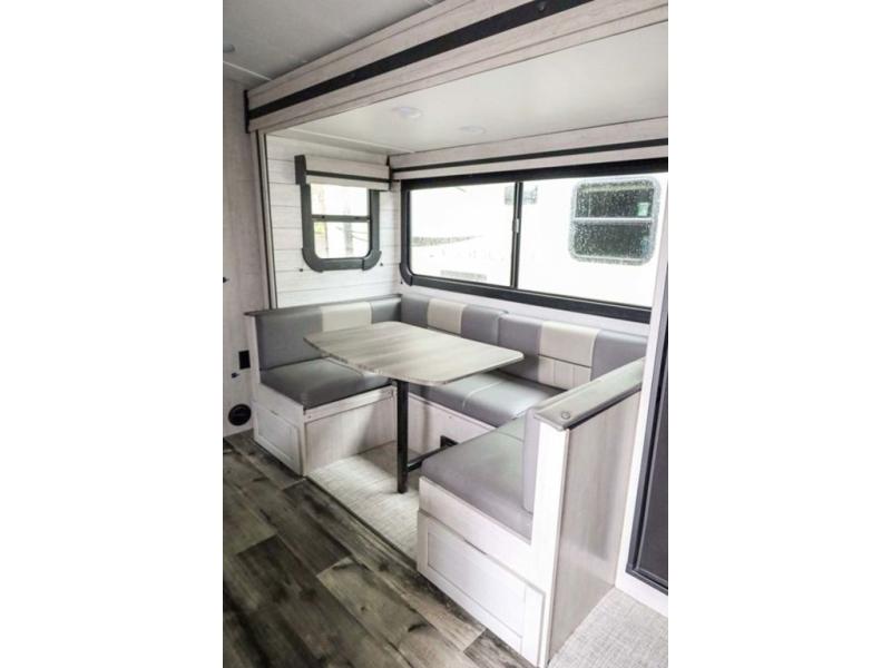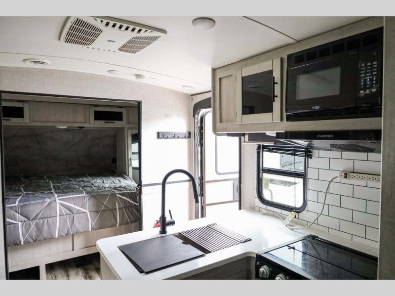 From the front private bedroom with a king bed and a slide out, to the rear corner bath and double-size bunks, you will love everything about this travel trailer. When you wake up in the morning you can prepare breakfast on the exterior camp kitchen, and if it's raining outside, the glass top range indoors will get the job done. There is also a stainless steel microwave for quick meals, and the wardrobe/pantry can store paper goods and the kids' cereal. Play a game of cards around the U-shaped dinette before heading off to bed in the front private bedroom!