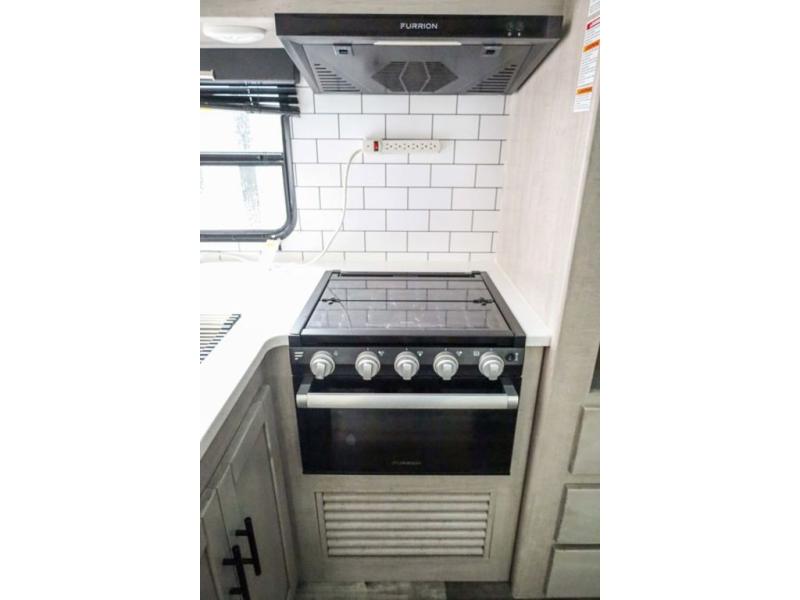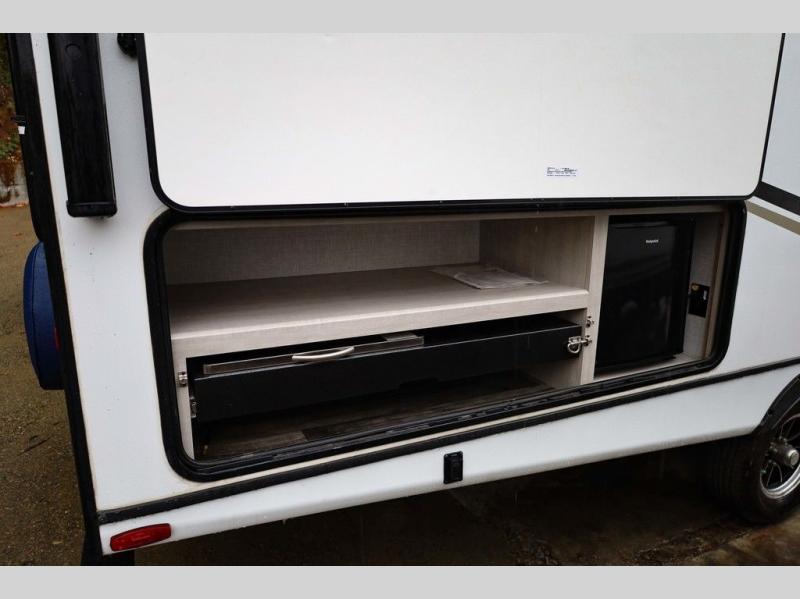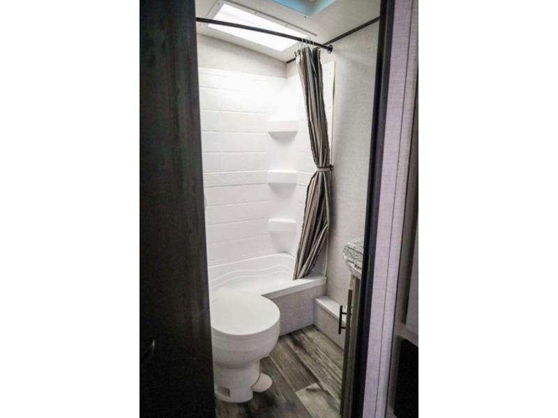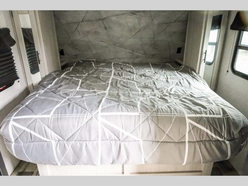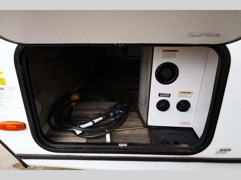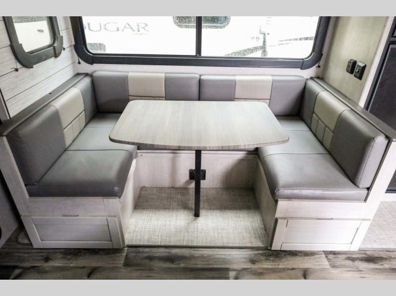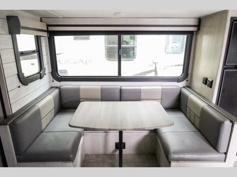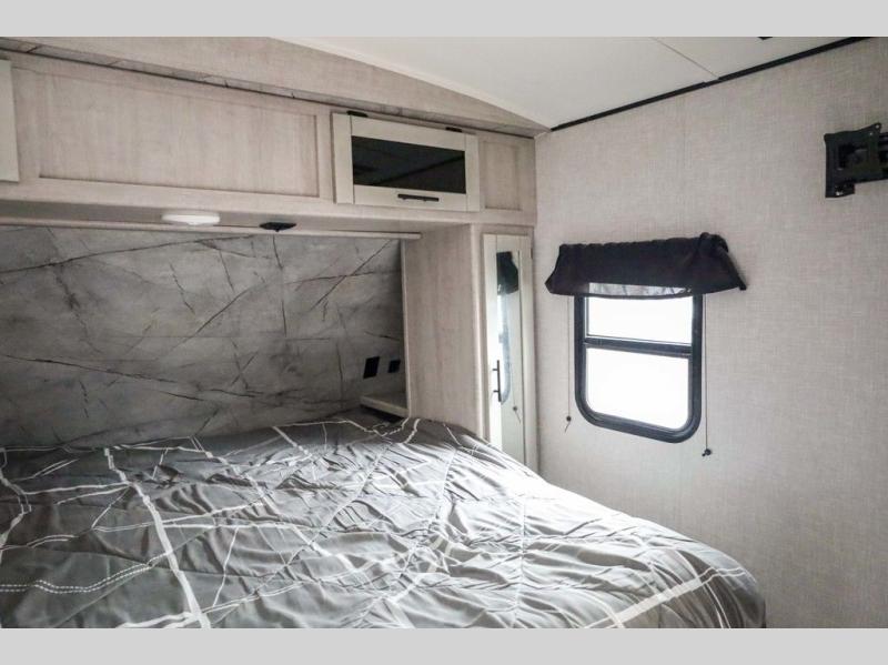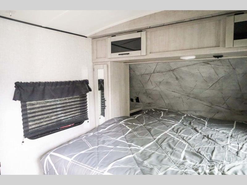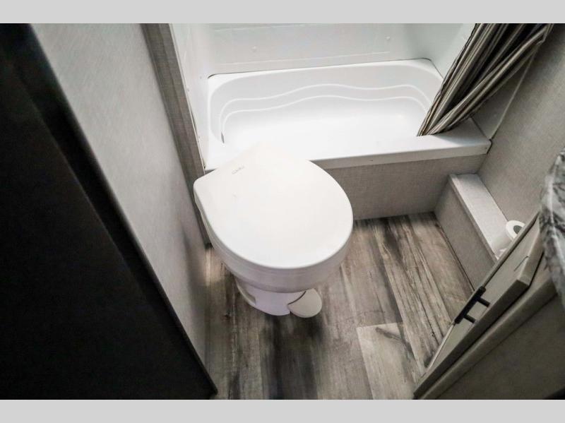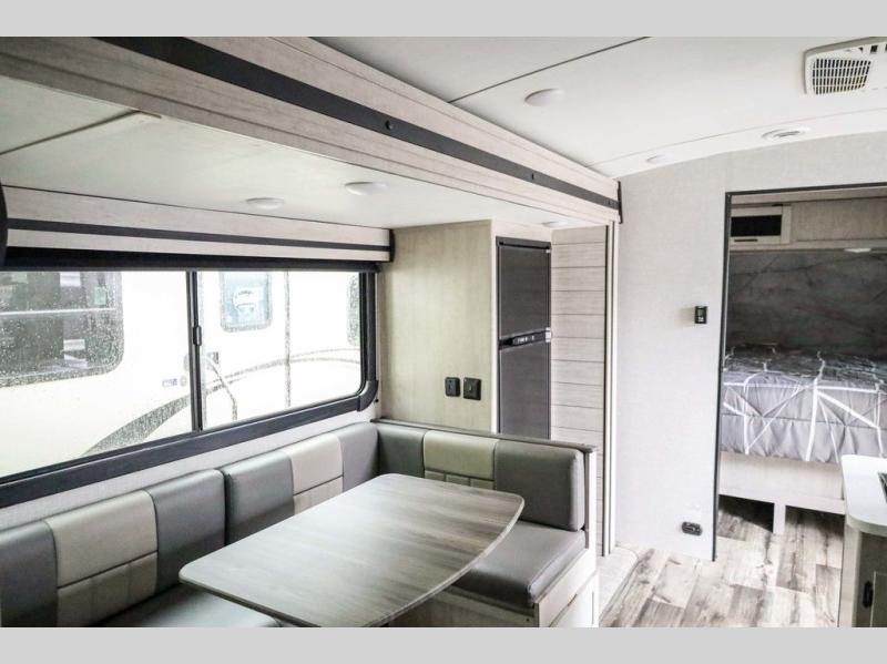 From the front private bedroom with a king bed and a slide out, to the rear corner bath and double-size bunks, you will love everything about this travel trailer. When you wake up in the morning you can prepare breakfast on the exterior camp kitchen, and if it's raining outside, the glass top range indoors will get the job done. There is also a stainless steel microwave for quick meals, and the wardrobe/pantry can store paper goods and the kids' cereal. Play a game of cards around the U-shaped dinette before heading off to bed in the front private bedroom!