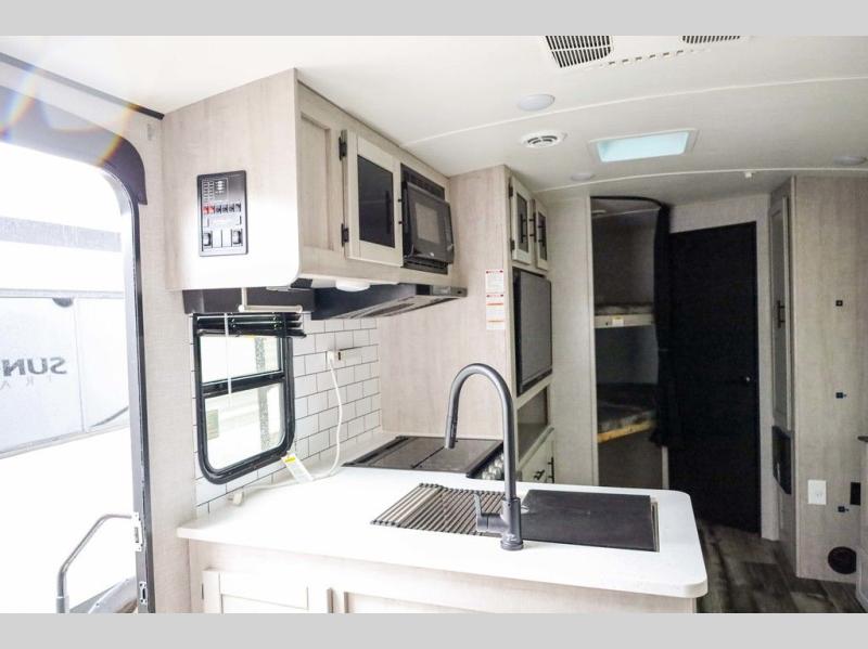 With any Sunset Trail travel trailer by CrossRoads RV, the interior offers a stainless steel farmhouse sink with a cover, solid surface kitchen countertops, and a docking station with 12 Volt, USB Port, and 110 Outlets. Also included is a 13,500 BTU air conditioner plus upgraded insulation with roof and floor reflective foil for added comfort, plus sturdy construction elements like a plywood bed board with strut assist, residential wood window trim, and hardwood cabinet doors. Make your lightweight and comfortable RV decision today!