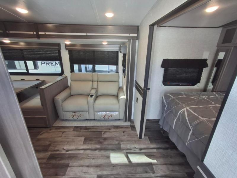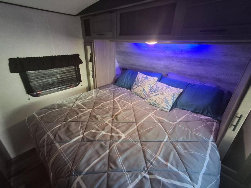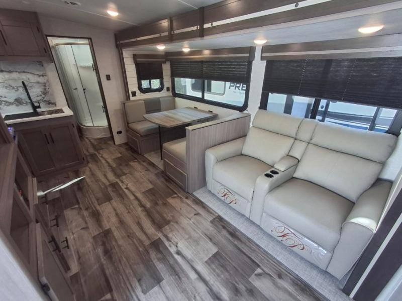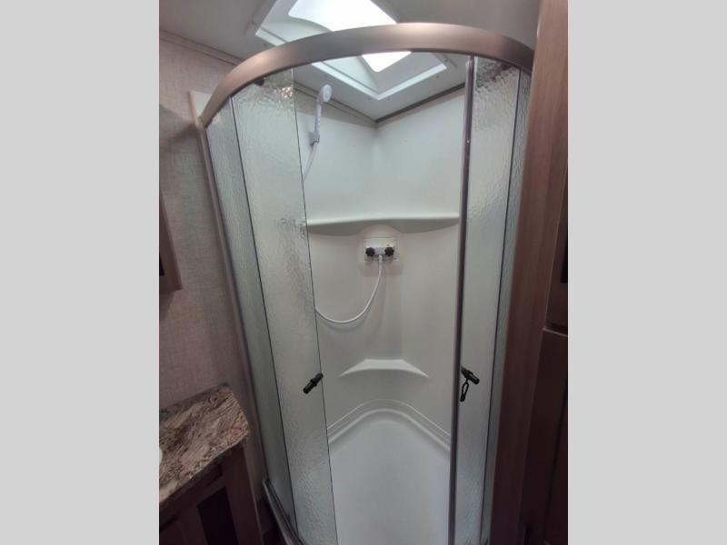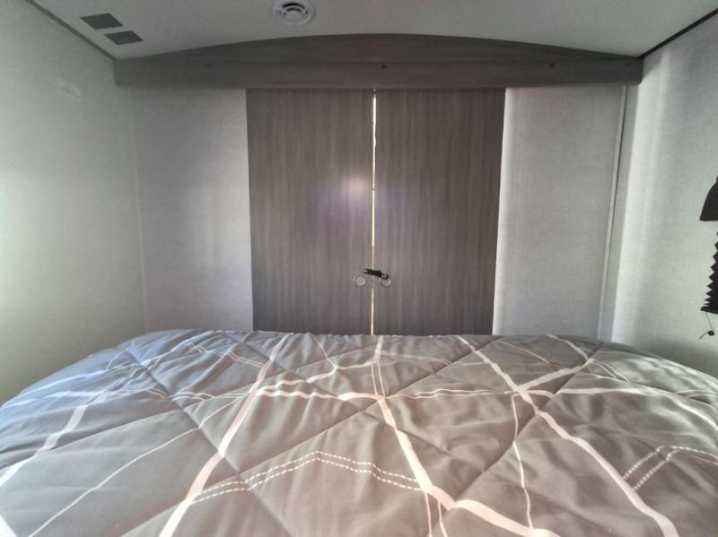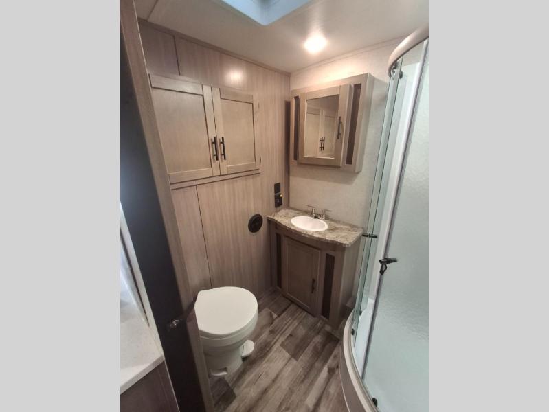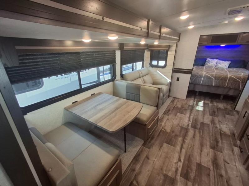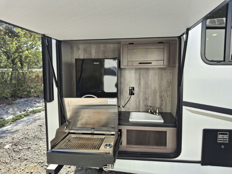 You will love the added interior space you have in this travel trailer thanks to the large slide out in the main living area. Here, you'll enjoy playing cards at the XL booth dinette and relaxing on the tri-fold sofa. Make home-cooked meals on the glass top range or use the exterior camp kitchen. There is even an exterior refrigerator for cold drinks, and the power awning will shade you from the hot summer sun. This model features a full rear bath for added privacy, and the shower skylight will allow natural light in. The front private bedroom includes a king bed, dual wardrobes, plus a shoe storage and pet station for your convenience!