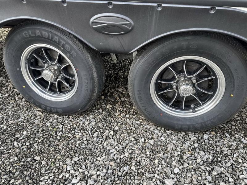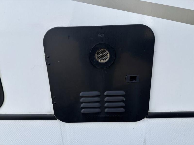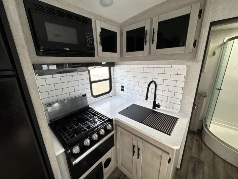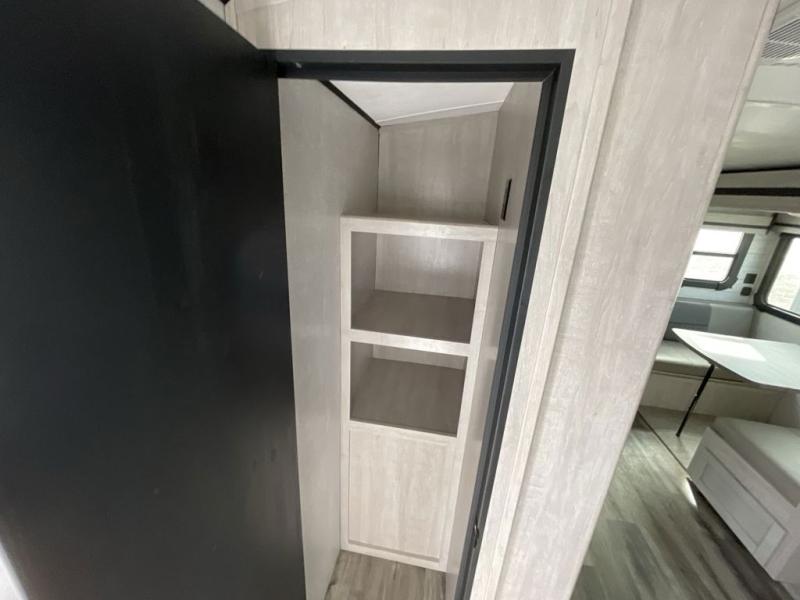 You will love the added interior space you have in this travel trailer thanks to the large slide out in the main living area. Here, you'll enjoy playing cards at the XL booth dinette and relaxing on the tri-fold sofa. Make home-cooked meals on the glass top range or use the exterior camp kitchen. There is even an exterior refrigerator for cold drinks, and the power awning will shade you from the hot summer sun. This model features a full rear bath for added privacy, and the shower skylight will allow natural light in. The front private bedroom includes a king bed, dual wardrobes, plus a shoe storage and pet station for your convenience!