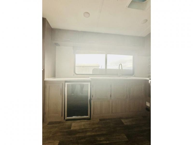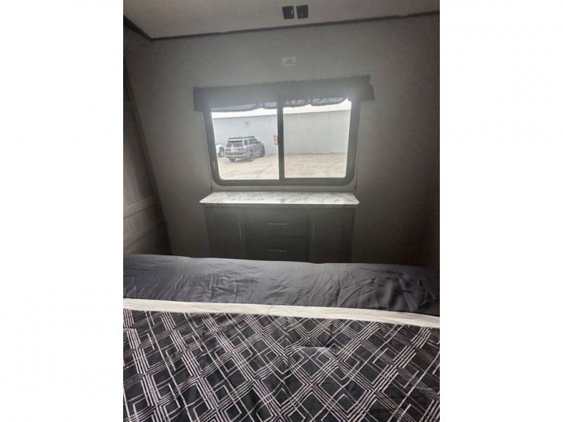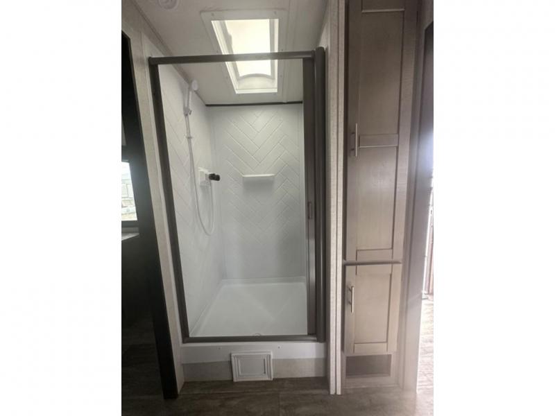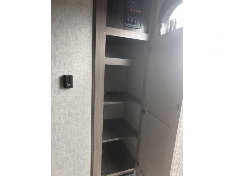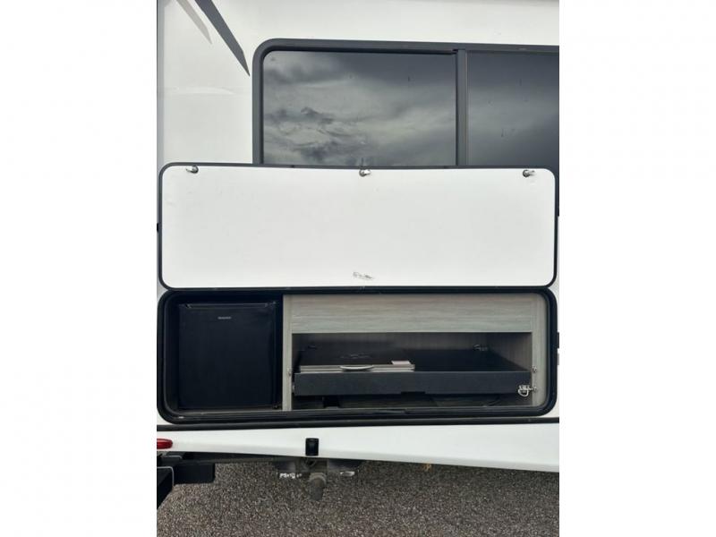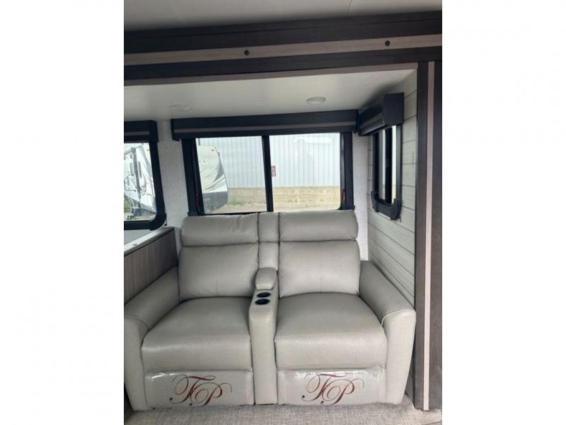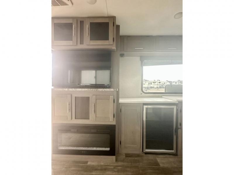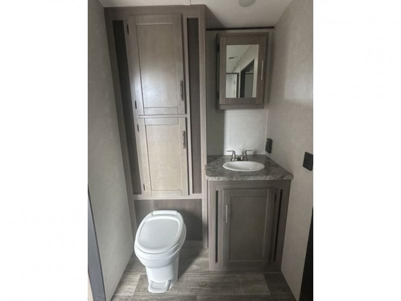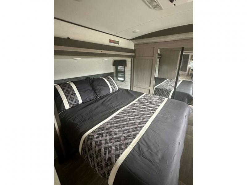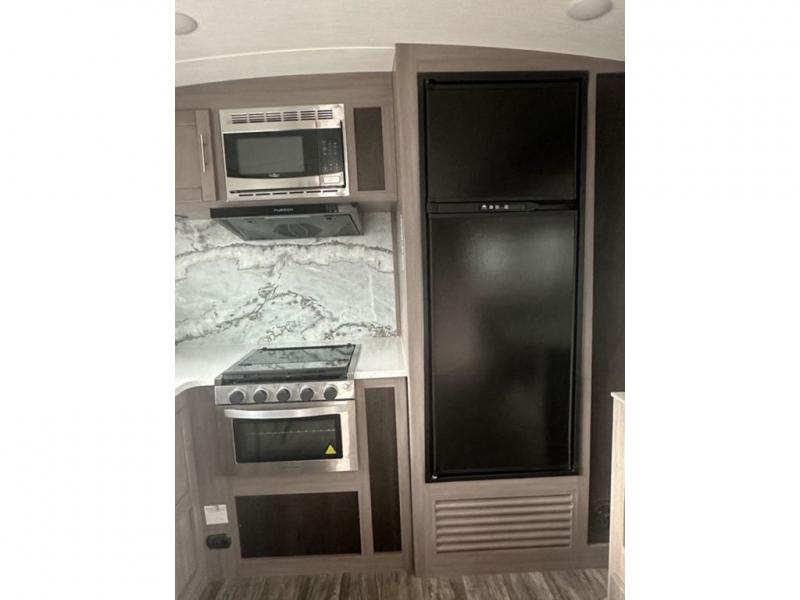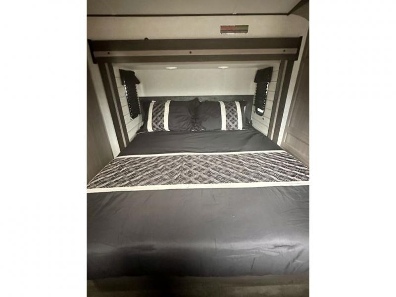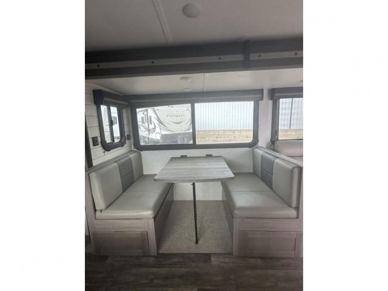 One step inside this travel trailer and you can be sure you've just found your new RV. The large slide out in the main living area will allow the dog to stretch out, and there is a second slide out in the front private bedroom for even more space. The walk-through bath is both spacious and convenient. Your crew can relax on the XL booth dinette and the standard tri-fold sofa can be replaced with an optional theater seating if you're not needing the additional sleeping space. This model also includes an exterior camp kitchen, plus an electric awning with LED lights for the ultimate outdoor living space!