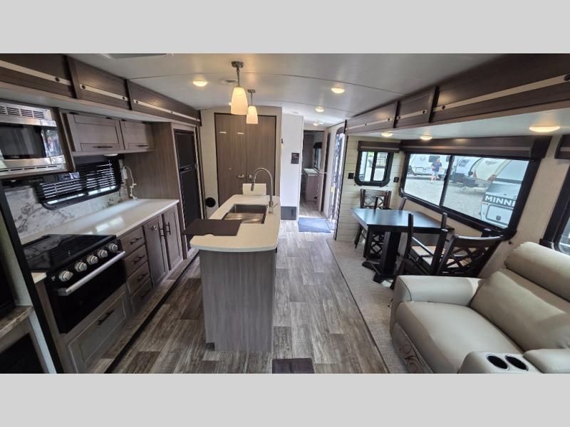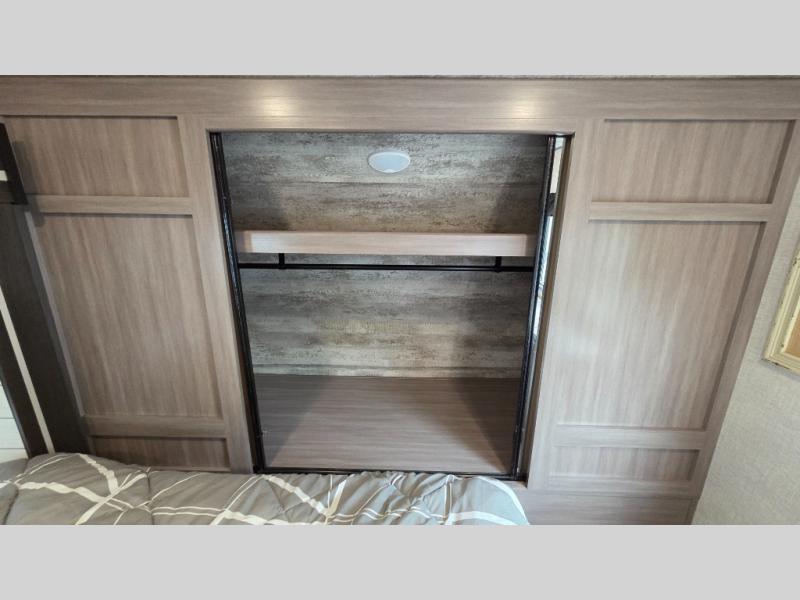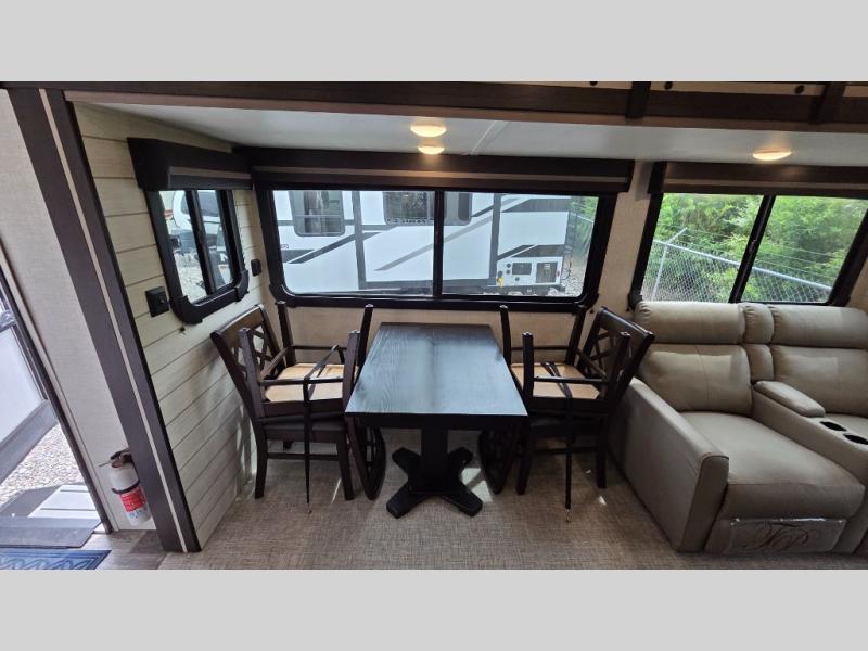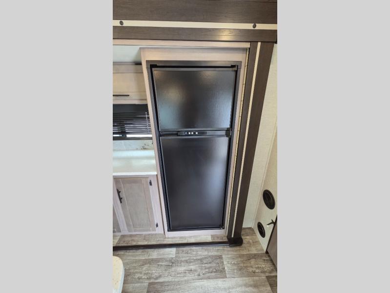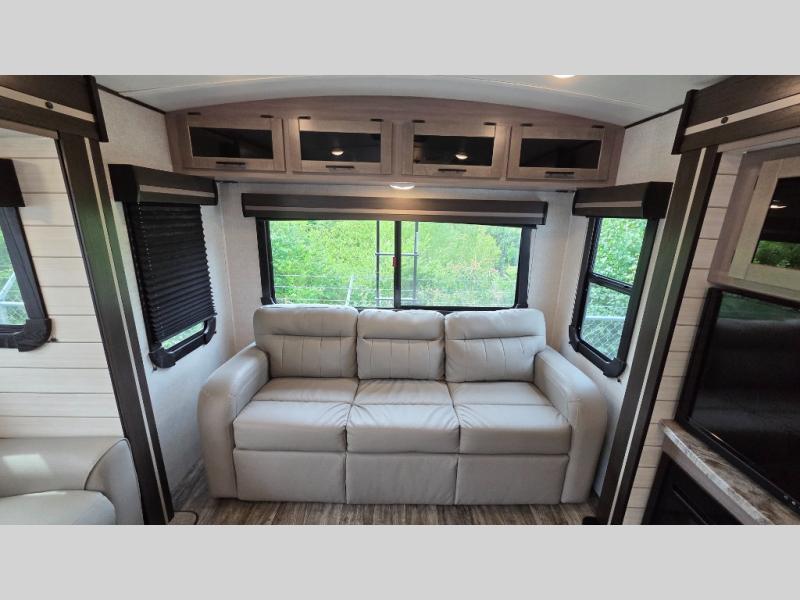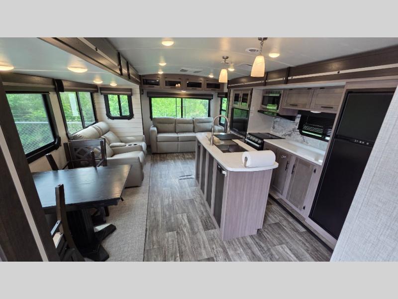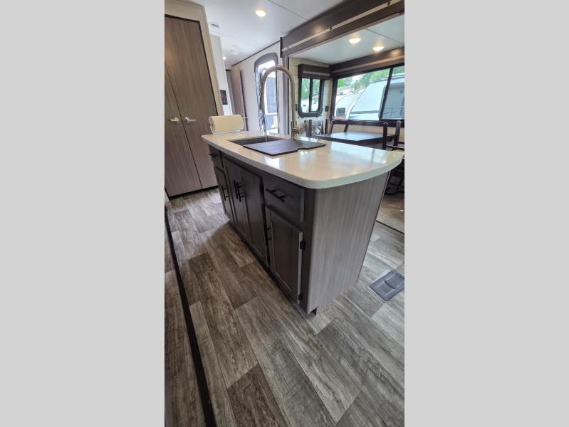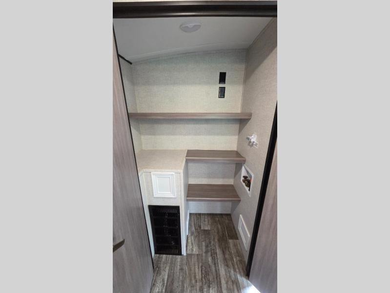 This spacious travel trailer is beaming with luxurious features you are sure to love. The dual opposing slides in the main living area open up the whole space, plus there is a third slide out in the front master suite. The chef of the family will appreciate the kitchen island for additional counter space, and there is a large pantry for all your non-perishables. This space has also been prepped to add an optional washer and dryer if you choose. Your family will find plenty of seating space on the rear 82" tri-fold sofa, the XL booth dinette, and the theater seating. The dual entry bath creates a front master bedroom, and you'll find plenty of storage space here, including a chest of drawers and a large front shelf!