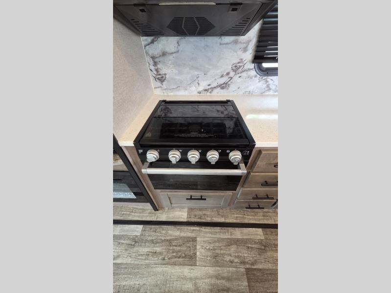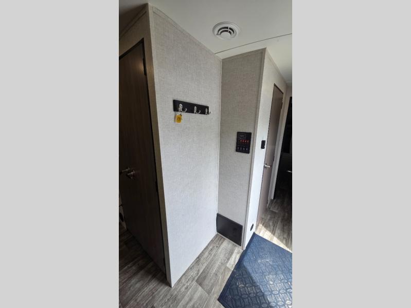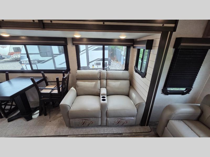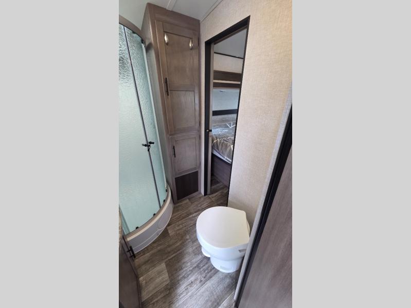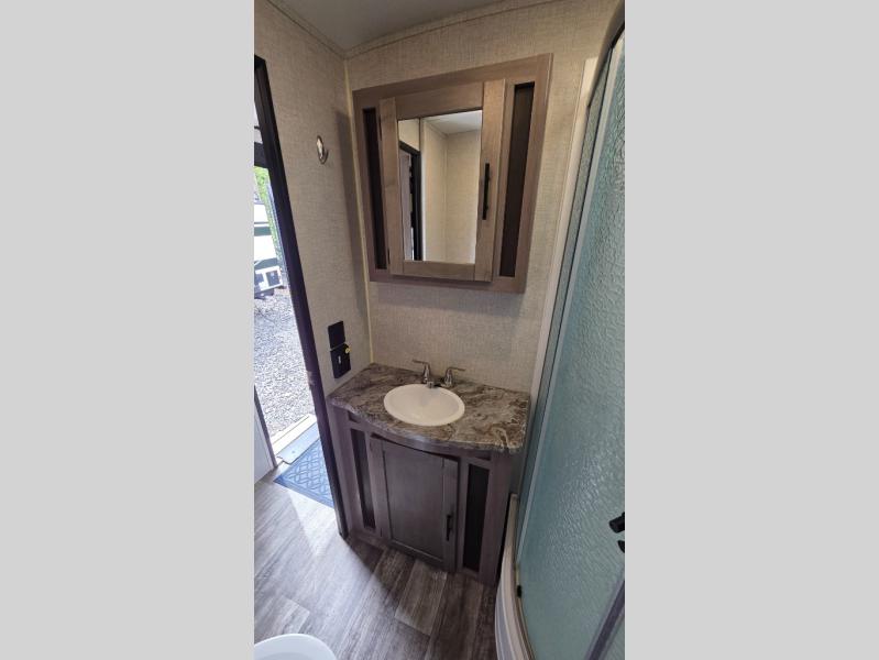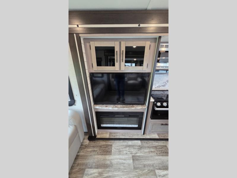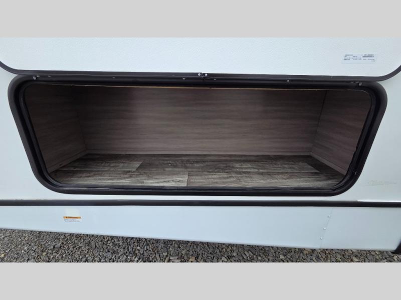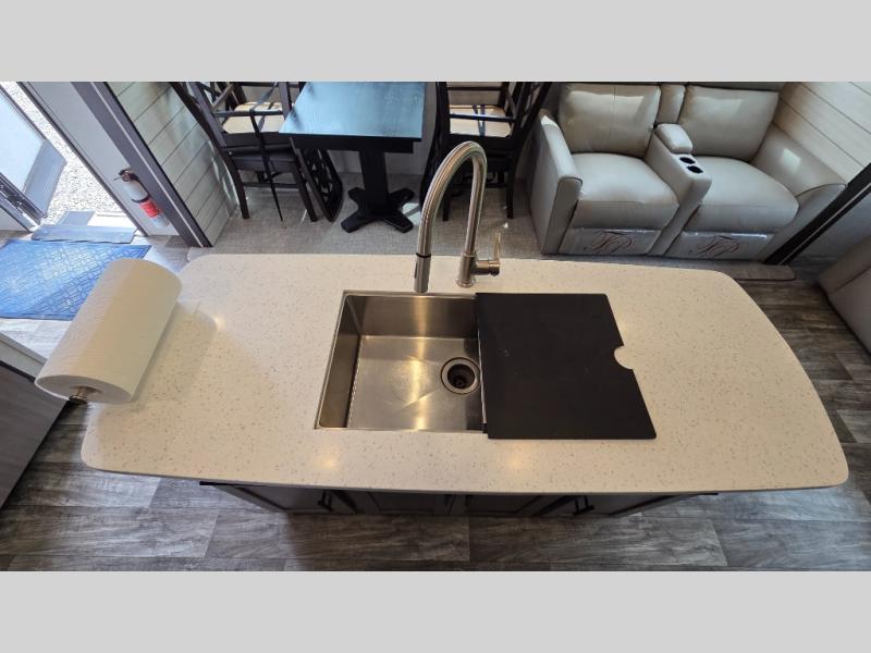 This spacious travel trailer is beaming with luxurious features you are sure to love. The dual opposing slides in the main living area open up the whole space, plus there is a third slide out in the front master suite. The chef of the family will appreciate the kitchen island for additional counter space, and there is a large pantry for all your non-perishables. This space has also been prepped to add an optional washer and dryer if you choose. Your family will find plenty of seating space on the rear 82" tri-fold sofa, the XL booth dinette, and the theater seating. The dual entry bath creates a front master bedroom, and you'll find plenty of storage space here, including a chest of drawers and a large front shelf!