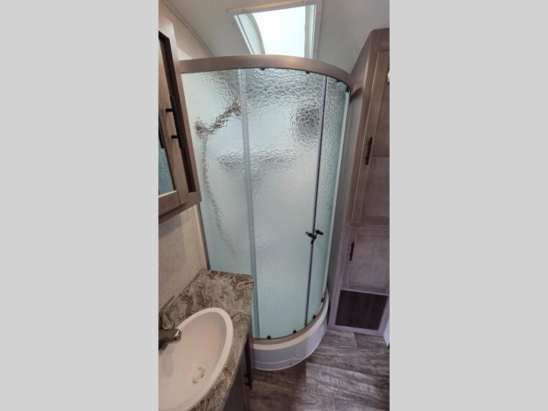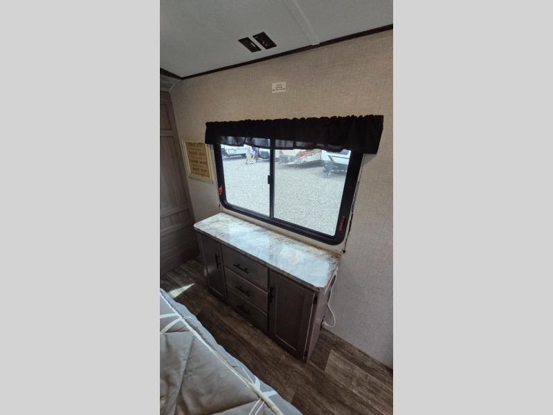 With any Sunset Trail travel trailer by CrossRoads RV, the interior offers a stainless steel farmhouse sink with a cover, solid surface kitchen countertops, and a docking station with 12 Volt, USB Port, and 110 Outlets. Also included is a 13,500 BTU air conditioner plus upgraded insulation with roof and floor reflective foil for added comfort, plus sturdy construction elements like a plywood bed board with strut assist, residential wood window trim, and hardwood cabinet doors. Make your lightweight and comfortable RV decision today!