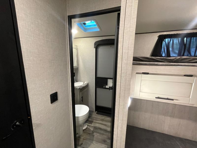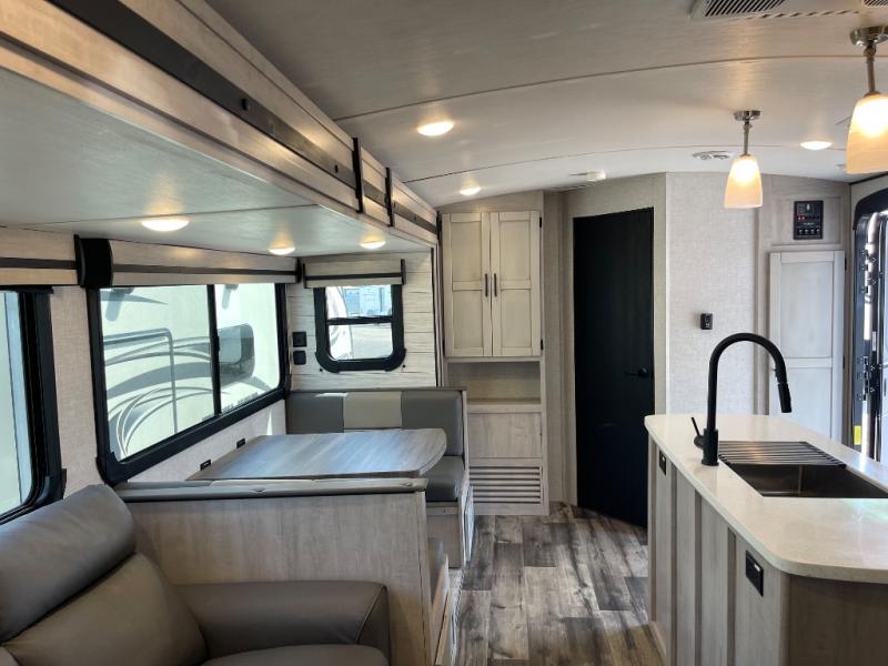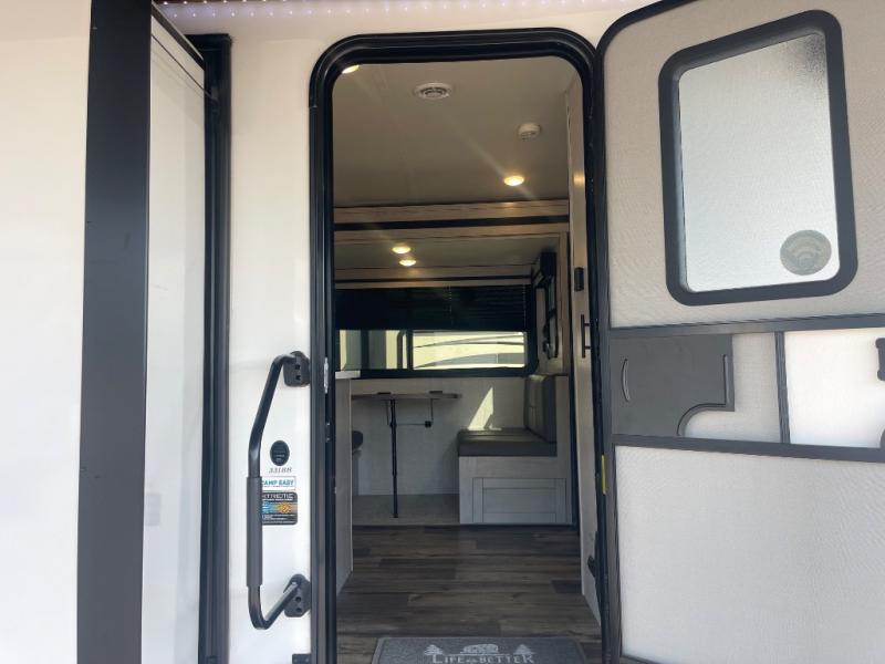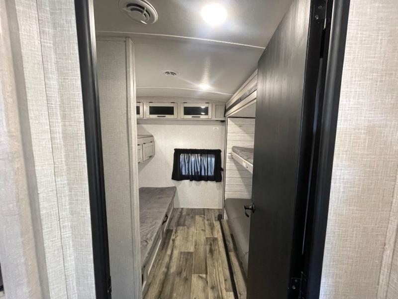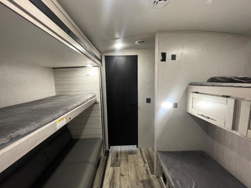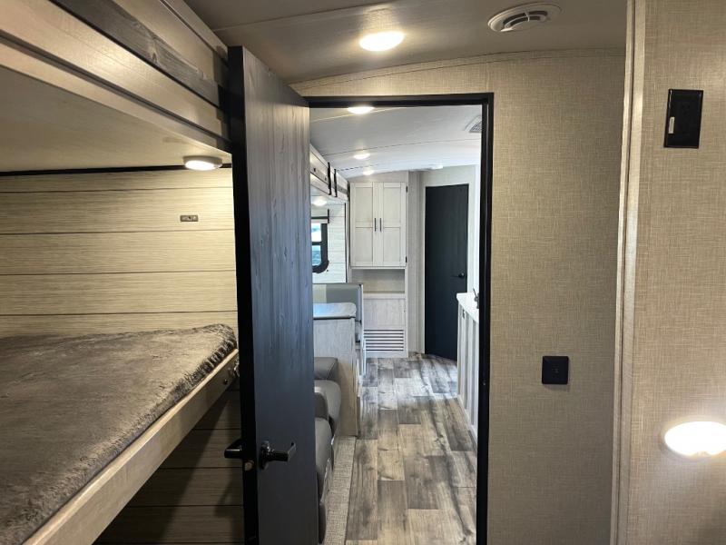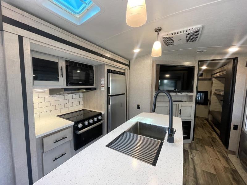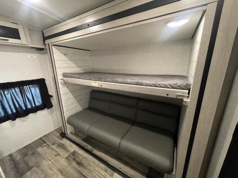 This travel trailer is packed with convenient features and luxury comforts for a camping trip you won't soon forget. Once you arrive at the campground, put out the electric awning and make a quick lunch on the exterior camp kitchen. The kitchen island inside will be the perfect place to cut up all the fixings for the burgers and you can grab the chips from the pantry. The kids will love the private bunkhouse that includes two bunks, a jackknife sofa with a kick, plus a dual entry half bath for convenience. The full walk-through bath will create a front master bedroom you are sure to love. Here, the king bed will provide a great night's rest and there are dual wardrobes for all your clothes. Plus there is a convenient shoe storage and pet station for your trusted loyal friends!