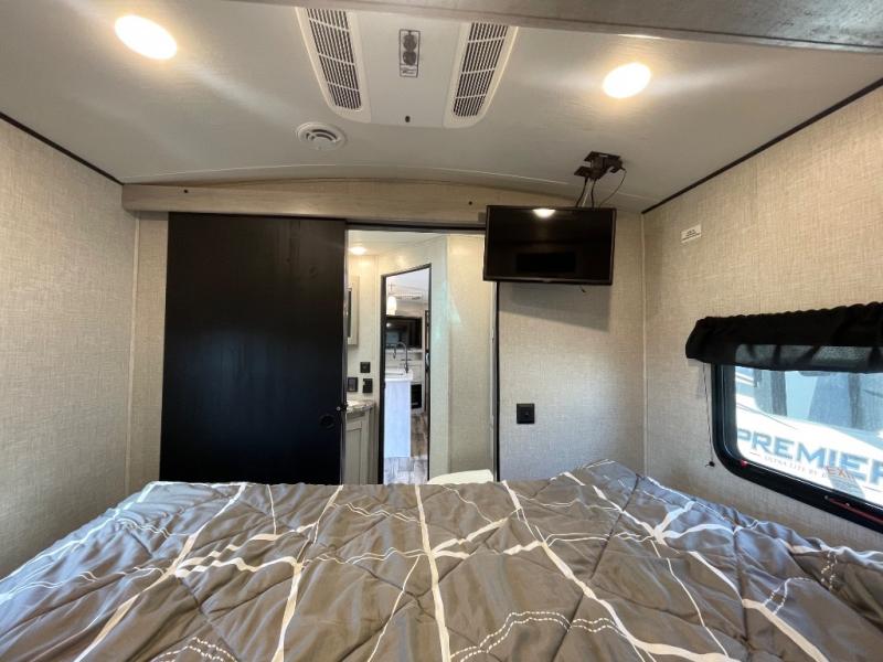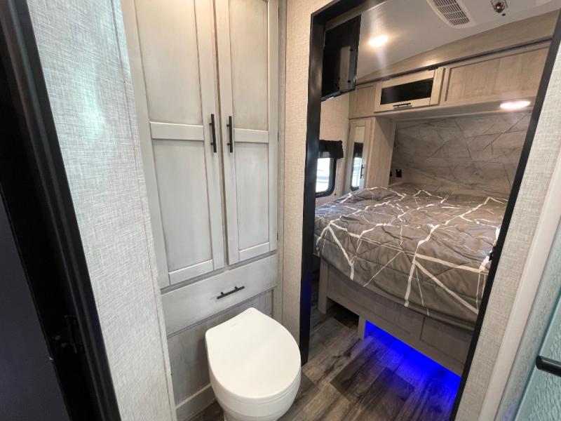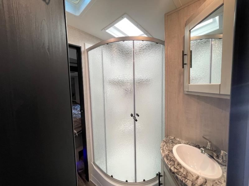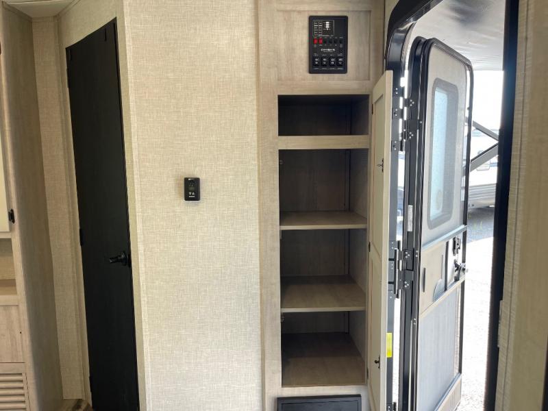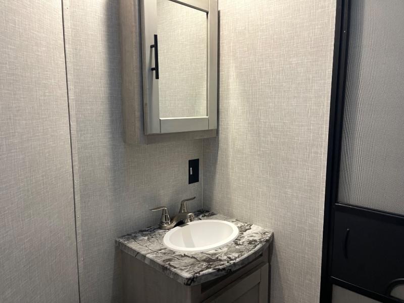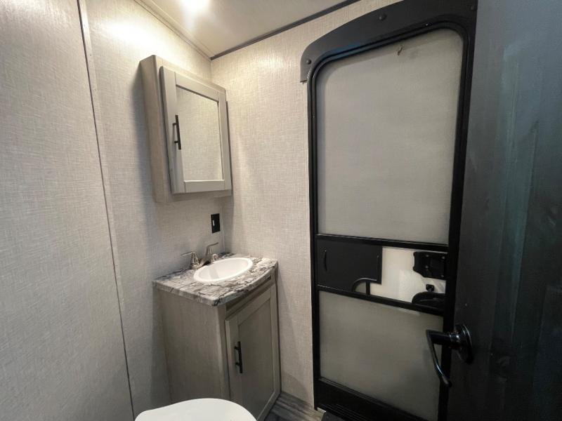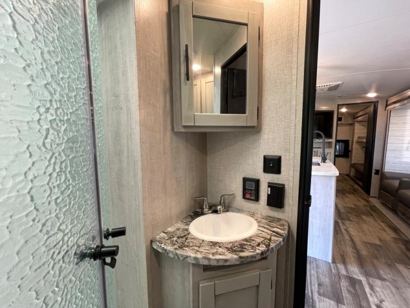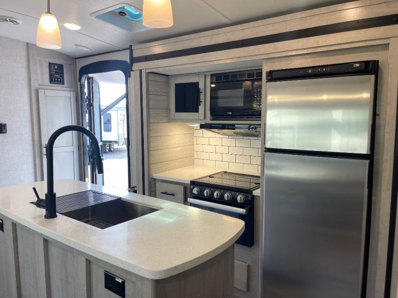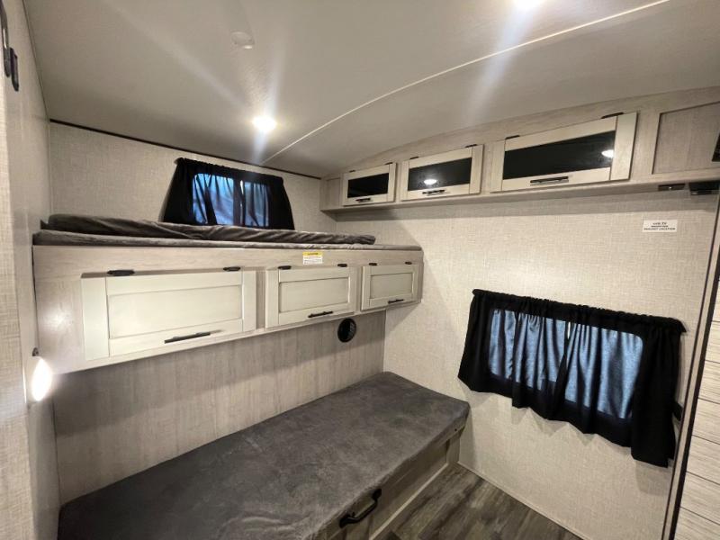 This travel trailer is packed with convenient features and luxury comforts for a camping trip you won't soon forget. Once you arrive at the campground, put out the electric awning and make a quick lunch on the exterior camp kitchen. The kitchen island inside will be the perfect place to cut up all the fixings for the burgers and you can grab the chips from the pantry. The kids will love the private bunkhouse that includes two bunks, a jackknife sofa with a kick, plus a dual entry half bath for convenience. The full walk-through bath will create a front master bedroom you are sure to love. Here, the king bed will provide a great night's rest and there are dual wardrobes for all your clothes. Plus there is a convenient shoe storage and pet station for your trusted loyal friends!