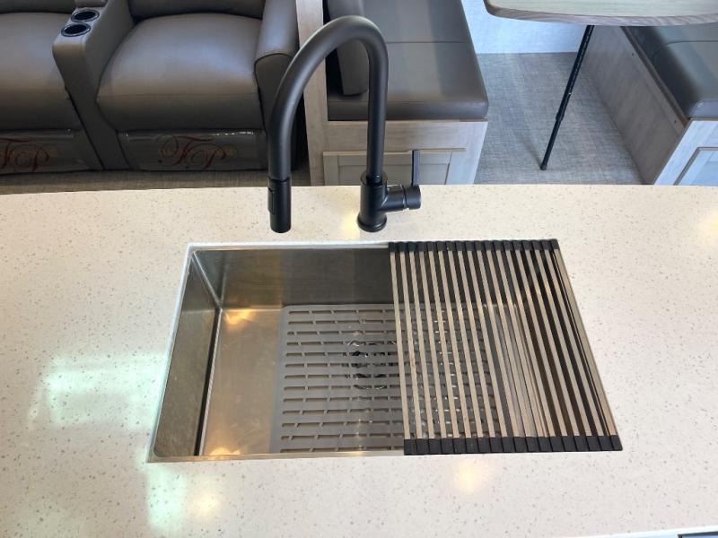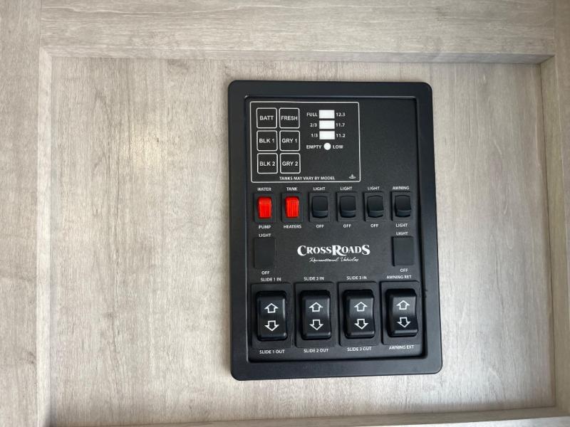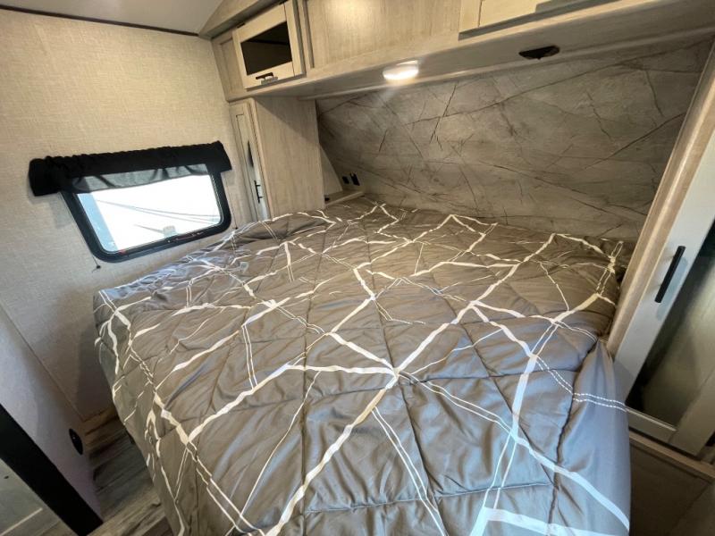 With any Sunset Trail travel trailer by CrossRoads RV, the interior offers a stainless steel farmhouse sink with a cover, solid surface kitchen countertops, and a docking station with 12 Volt, USB Port, and 110 Outlets. Also included is a 13,500 BTU air conditioner plus upgraded insulation with roof and floor reflective foil for added comfort, plus sturdy construction elements like a plywood bed board with strut assist, residential wood window trim, and hardwood cabinet doors. Make your lightweight and comfortable RV decision today!