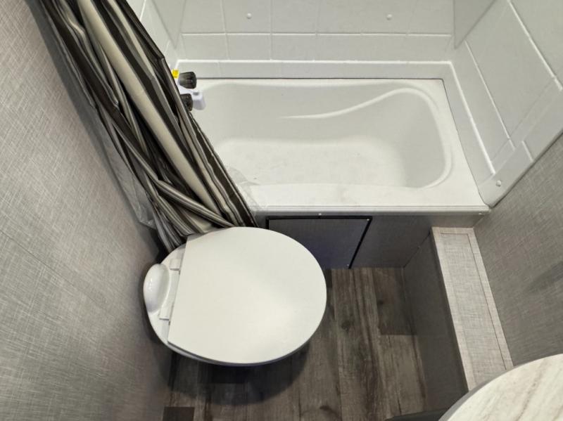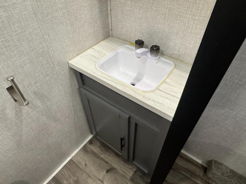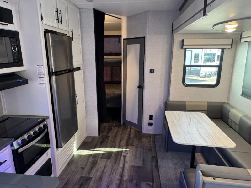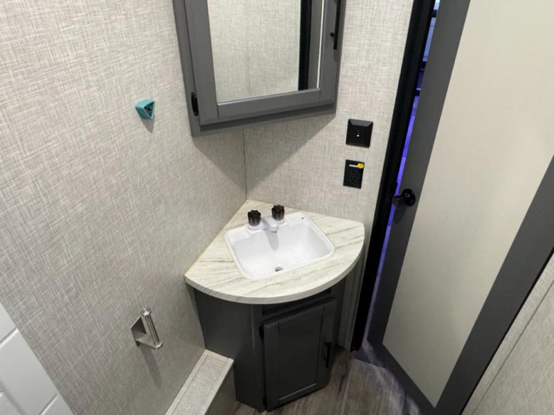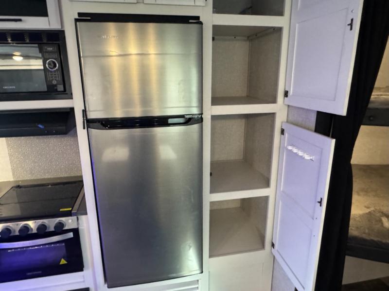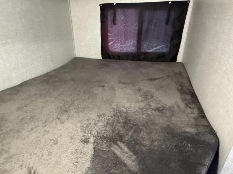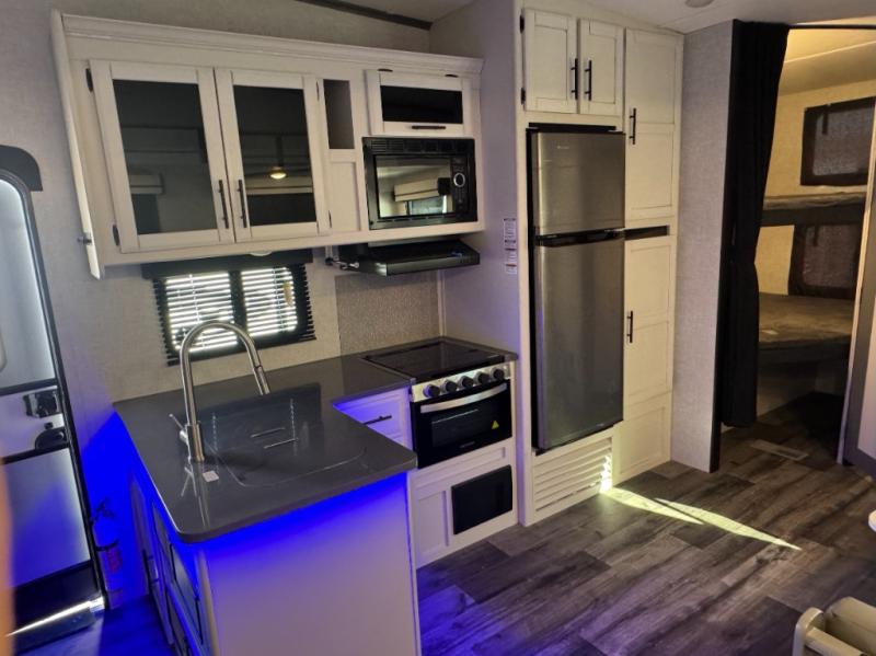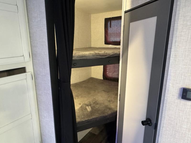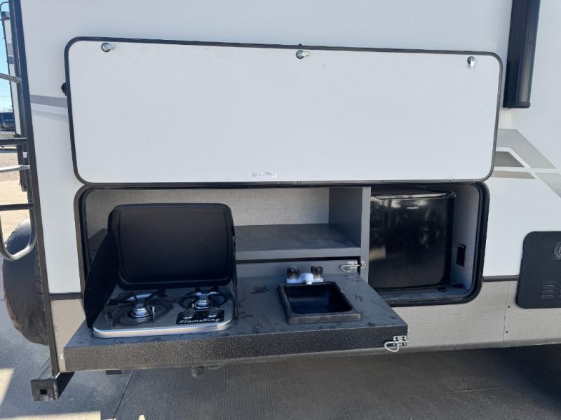 Eat, sleep, relax, and play all in this spacious fifth wheel that can sleep ten people each night! Once you arrive at your destination, stretch your legs around the campsite, then you can prepare lunch on the outside kitchen. You may want to take a rest on the queen bed after lunch, and the kids or your guests can read books on the double-size bunks. This model includes a bath and a half for your convenience, plus you'll find plenty of storage space, including a kitchen pantry for snacks!