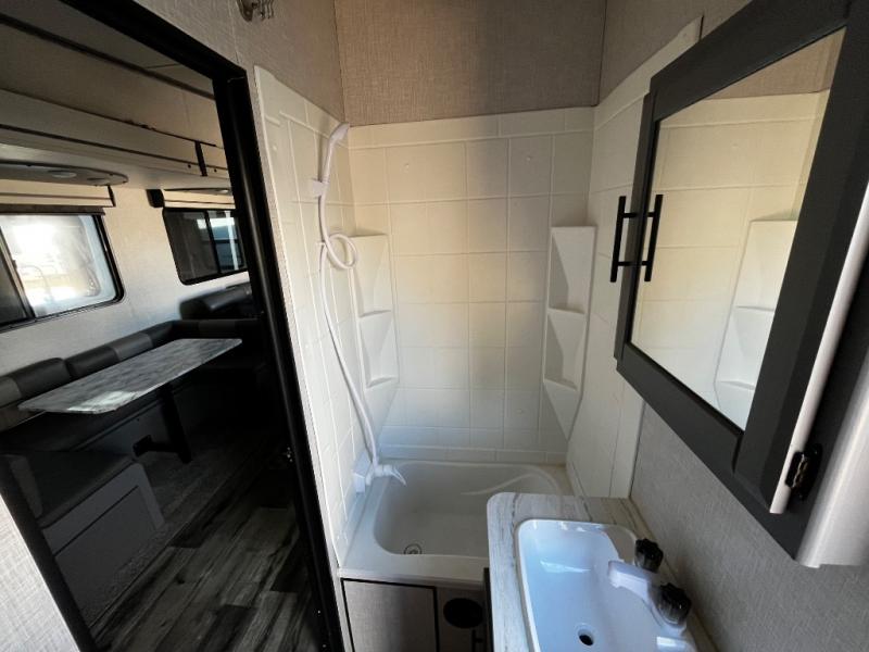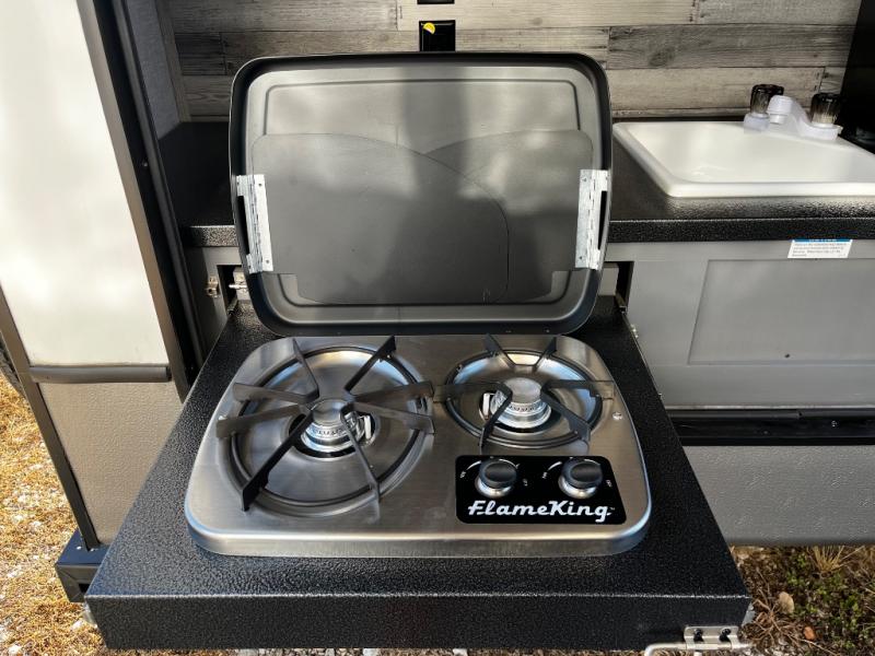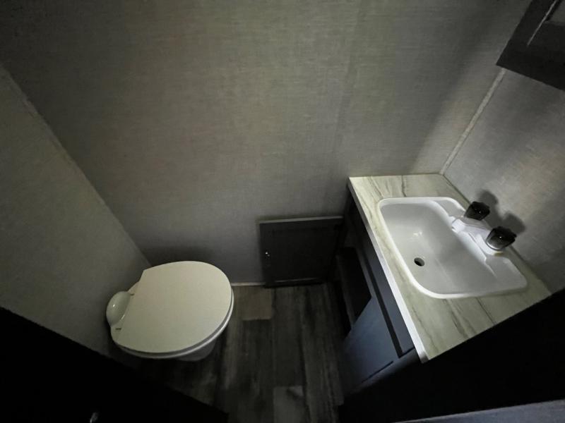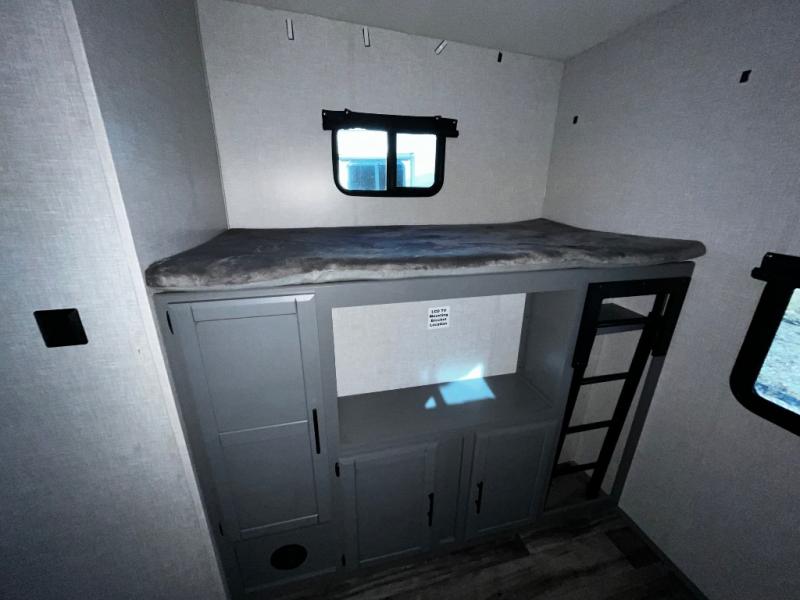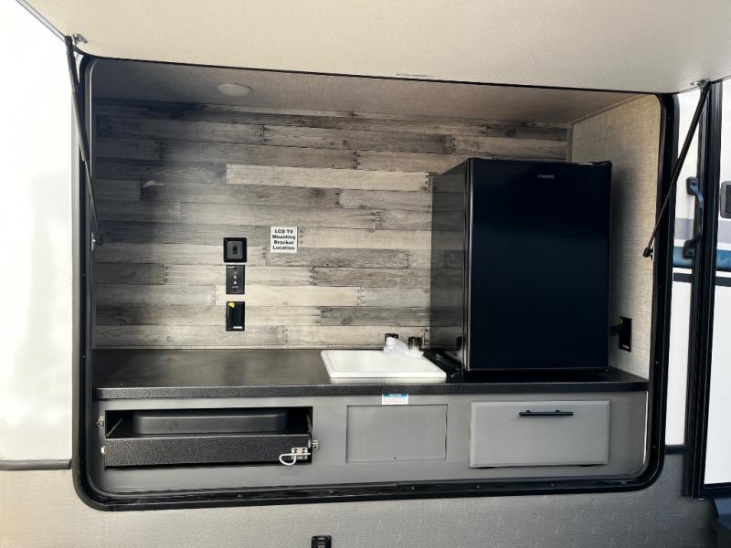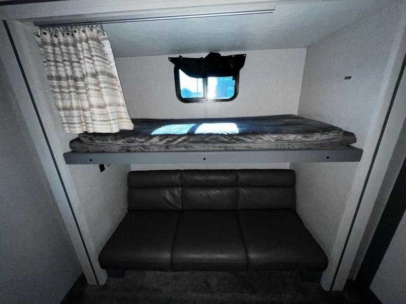This dual entry, dual slide fifth wheel is perfect for your family or large group! The private bunkhouse includes a jackknife sofa with a flip-up bunk above, a convenient trundle bed, plus a second bunk with wardrobe space below. The chef of the family can prepare meals each day on the three-burner cooktop, and everyone can dine around the U-shaped dinette or sit under the power awing outside. This model also includes a tri-fold sofa for additional guests, and the front master suite features a queen bed and its own half bath!