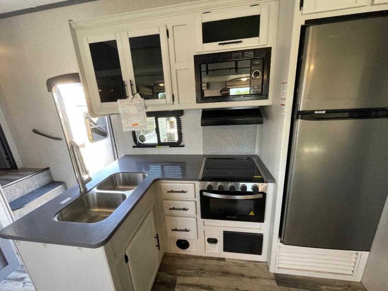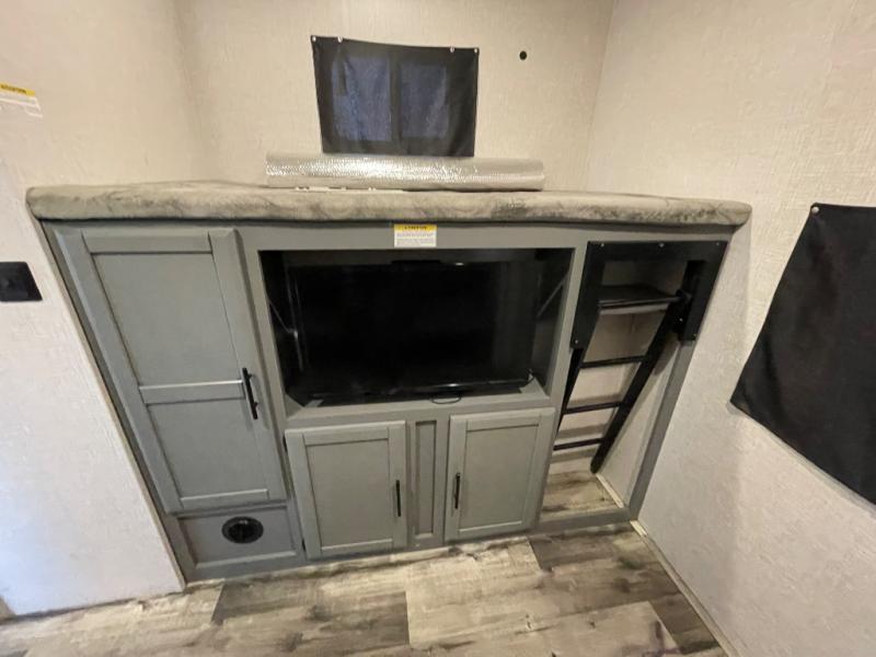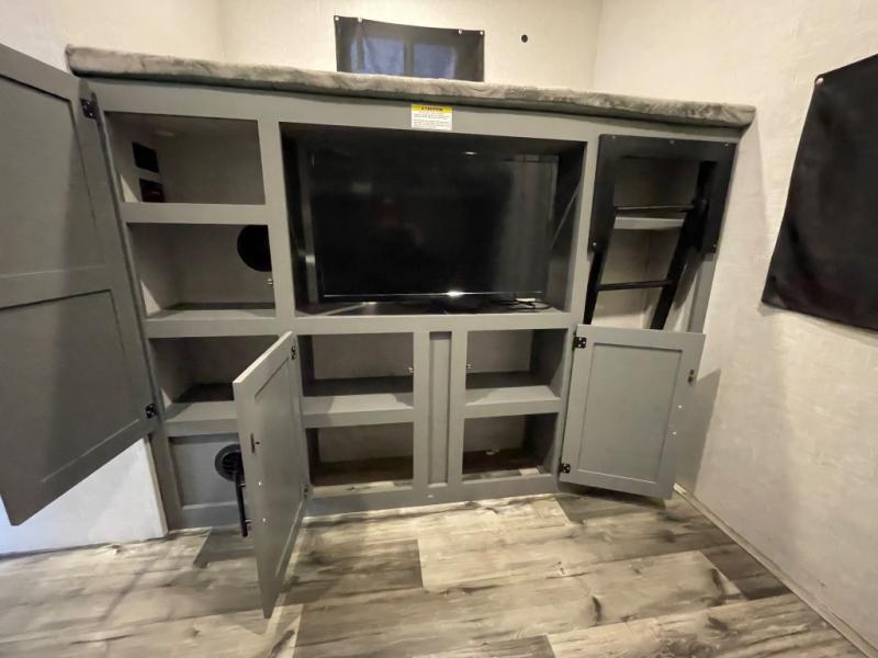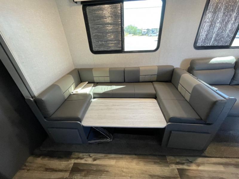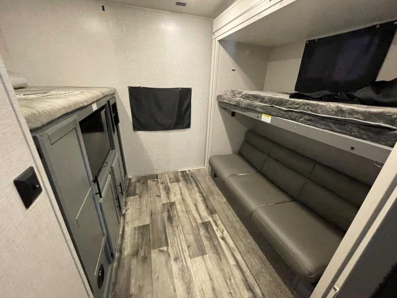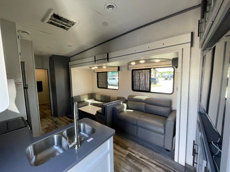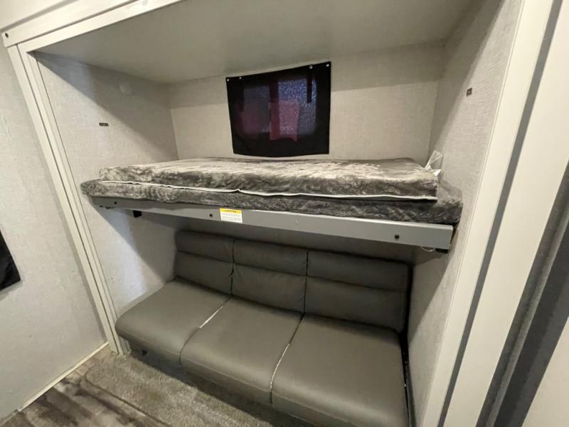 This dual entry, dual slide fifth wheel is perfect for your family or large group! The private bunkhouse includes a jackknife sofa with a flip-up bunk above, a convenient trundle bed, plus a second bunk with wardrobe space below. The chef of the family can prepare meals each day on the three-burner cooktop, and everyone can dine around the U-shaped dinette or sit under the power awing outside. This model also includes a tri-fold sofa for additional guests, and the front master suite features a queen bed and its own half bath!