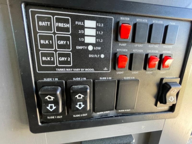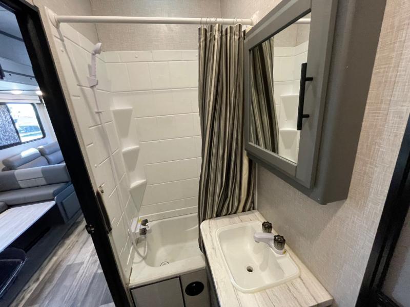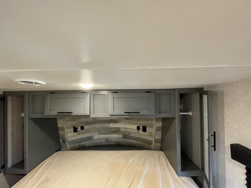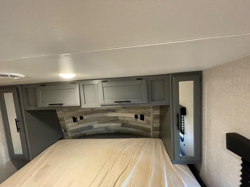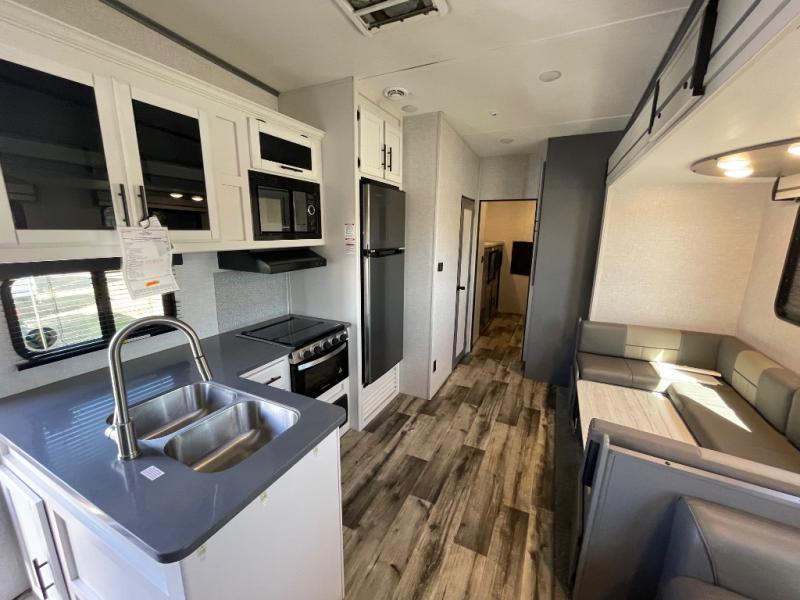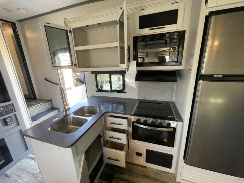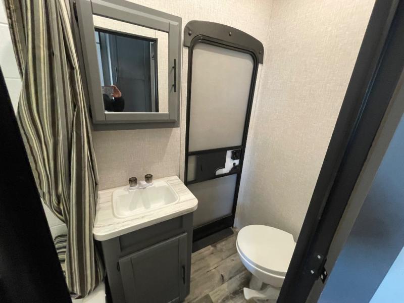 This dual entry, dual slide fifth wheel is perfect for your family or large group! The private bunkhouse includes a jackknife sofa with a flip-up bunk above, a convenient trundle bed, plus a second bunk with wardrobe space below. The chef of the family can prepare meals each day on the three-burner cooktop, and everyone can dine around the U-shaped dinette or sit under the power awing outside. This model also includes a tri-fold sofa for additional guests, and the front master suite features a queen bed and its own half bath!