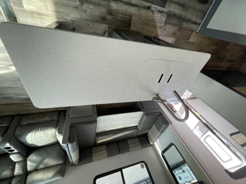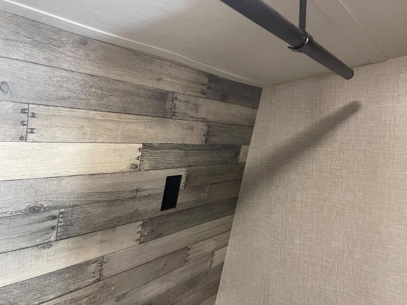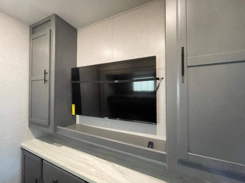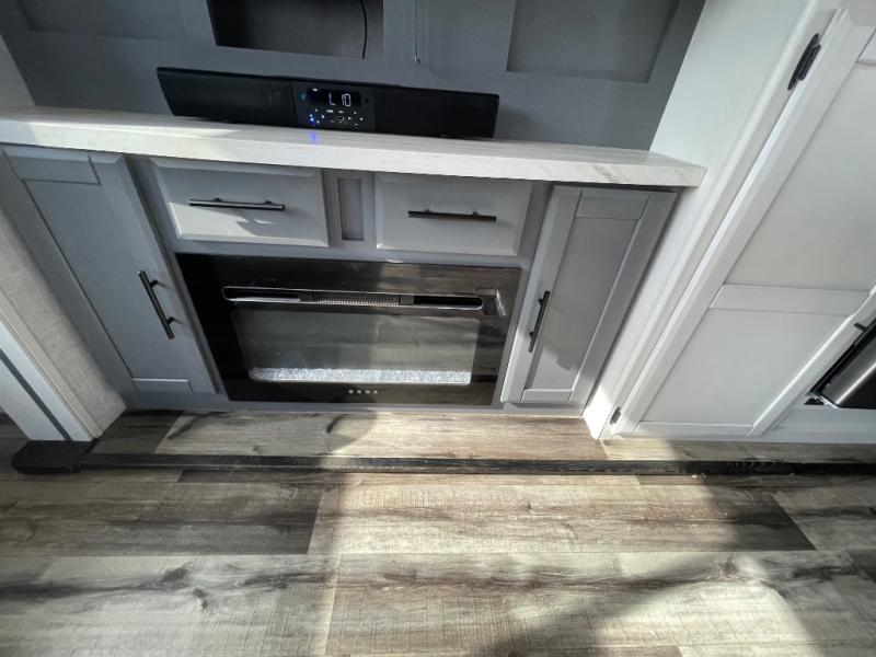 This Volante fifth wheel is an amazing choice for future traveling! You won't miss home at all when you have your own master suite to relax in and a second bedroom with a jackknife sofa, bunk mat, and flip-up bunk for your traveling companions. The living area is also going to be relaxing with its 72" sofa, 60" theater seats, U-shaped dinette, and entertainment center with fireplace. The front bedroom also has some extra convenience since it includes a full-width closet that can hold all of your favorite sweaters.