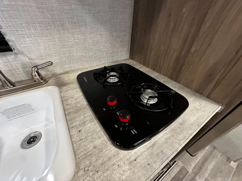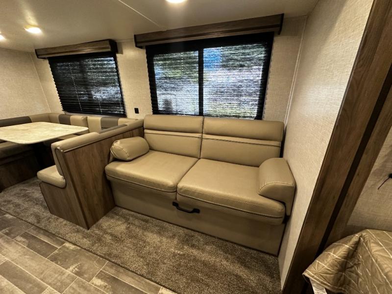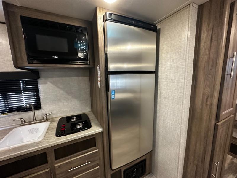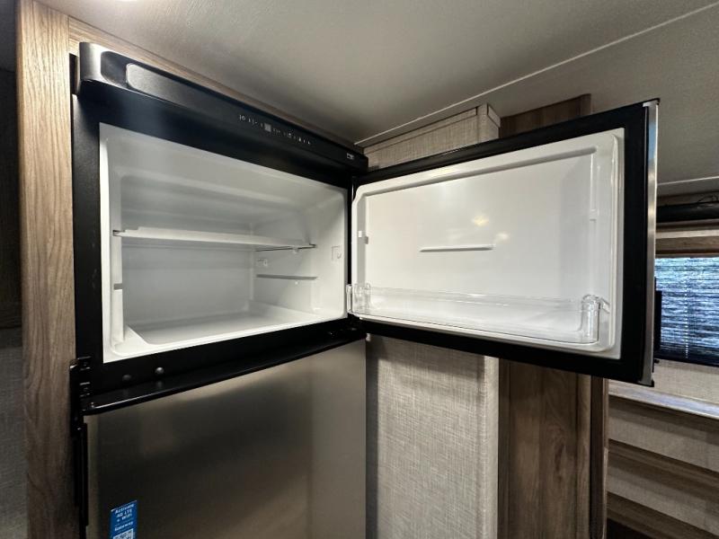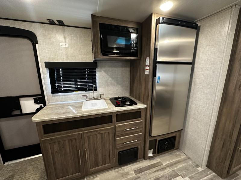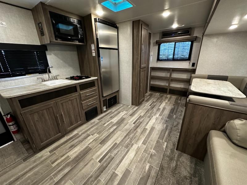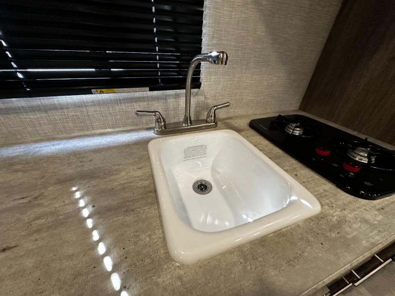 Step inside the Zinger 18DS and you’ll immediately notice the thoughtful layout that maximizes every inch of space. The bright and open interior features comfortable seating and a versatile dinette where you can enjoy meals, game nights, or plan your next destination. Large windows fill the living area with natural light and scenic views, creating an inviting atmosphere that enhances every camping experience.