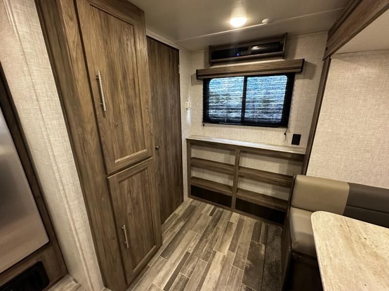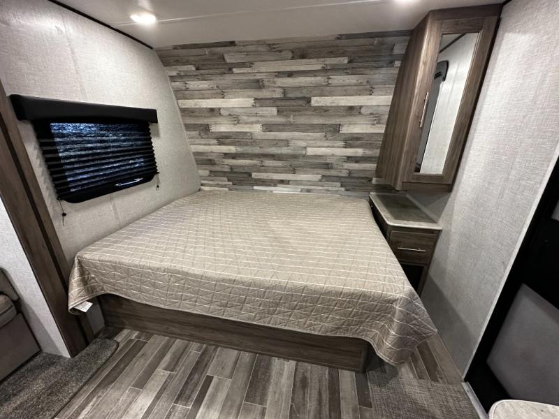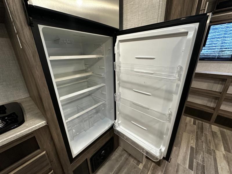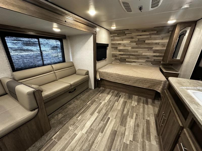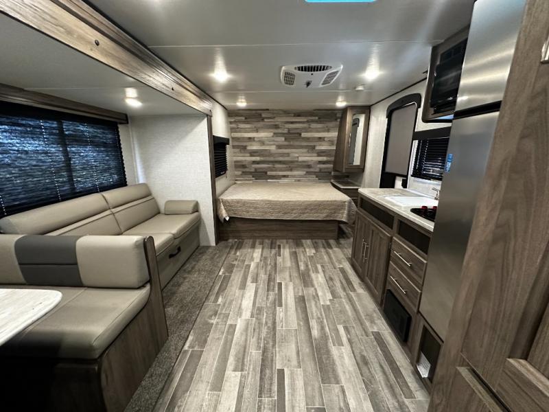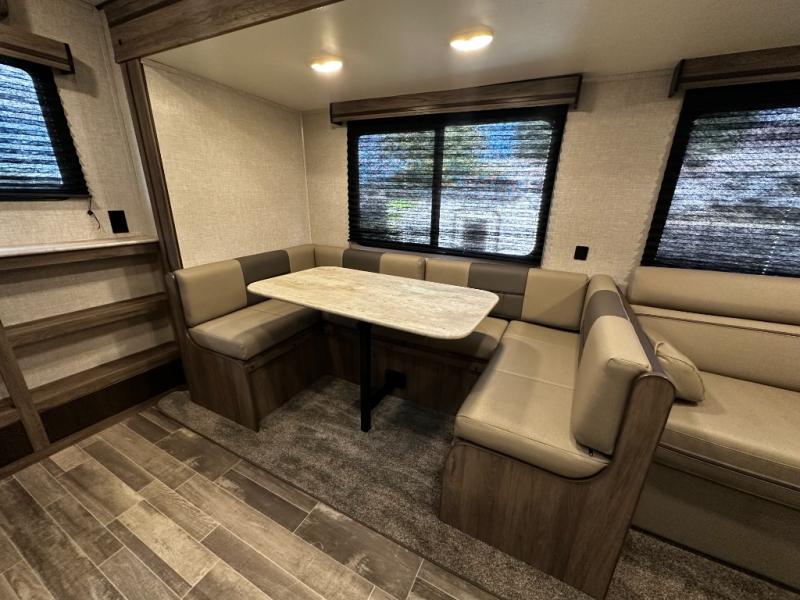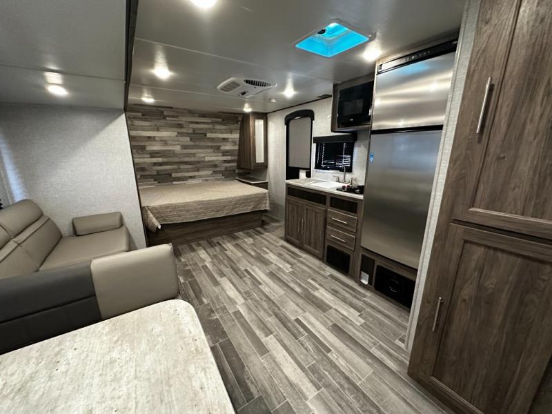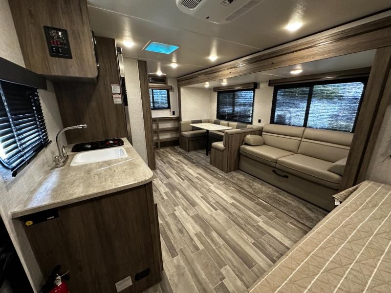 Step inside the Zinger 18DS and you’ll immediately notice the thoughtful layout that maximizes every inch of space. The bright and open interior features comfortable seating and a versatile dinette where you can enjoy meals, game nights, or plan your next destination. Large windows fill the living area with natural light and scenic views, creating an inviting atmosphere that enhances every camping experience.