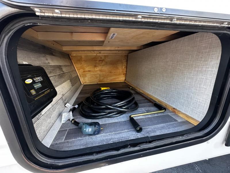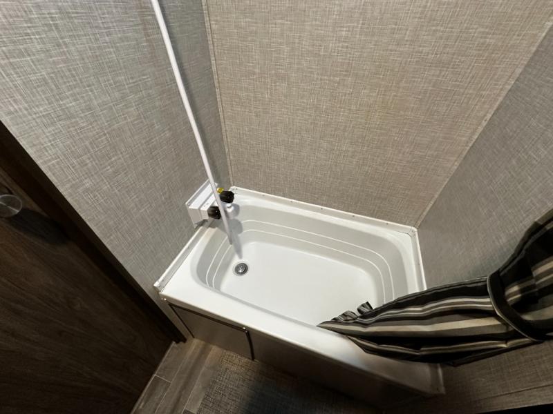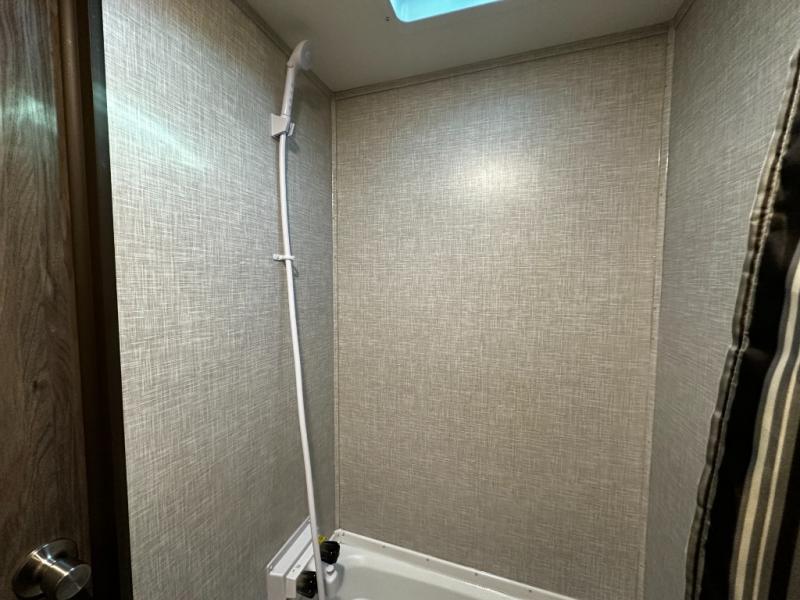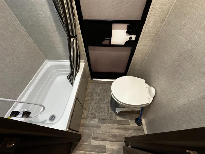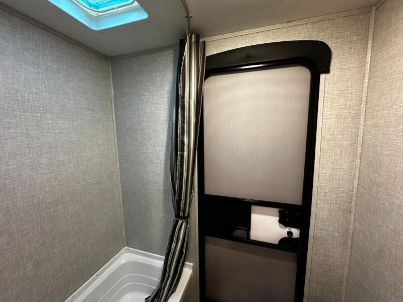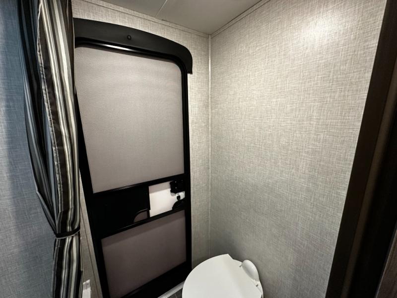 When it’s time to rest, the cozy sleeping area provides a comfortable retreat with quality bedding and convenient storage for your personal belongings. The adjacent bathroom features a functional layout and quality fixtures, making daily routines simple and efficient—even while you’re off the grid. Additional storage compartments throughout the coach ensure your travel gear, clothing, and accessories are neatly stowed and easy to access.