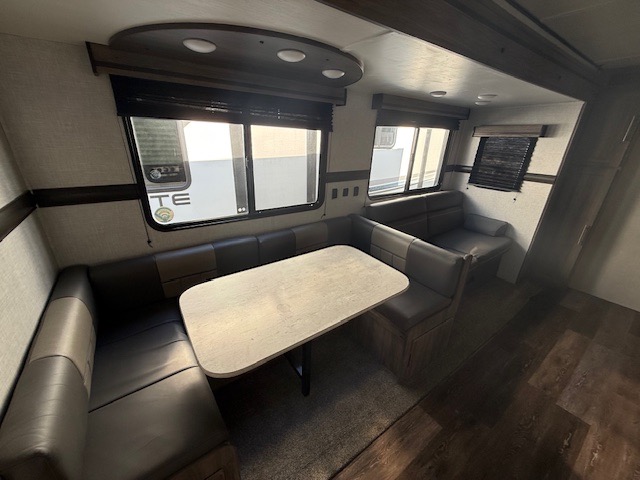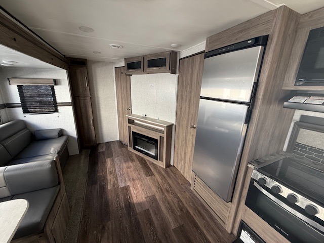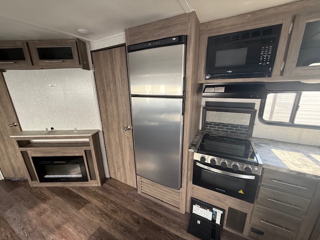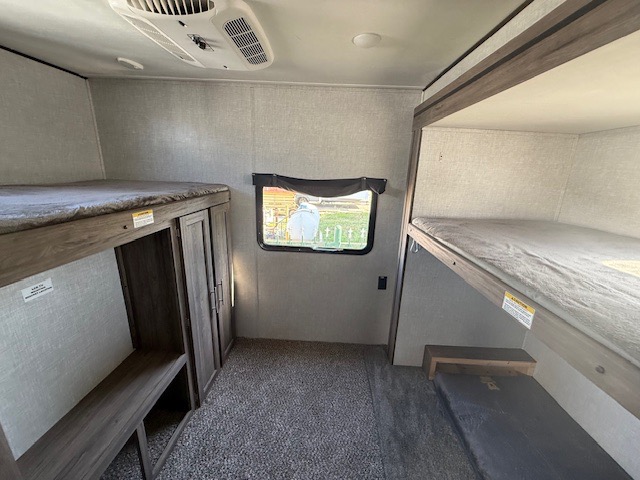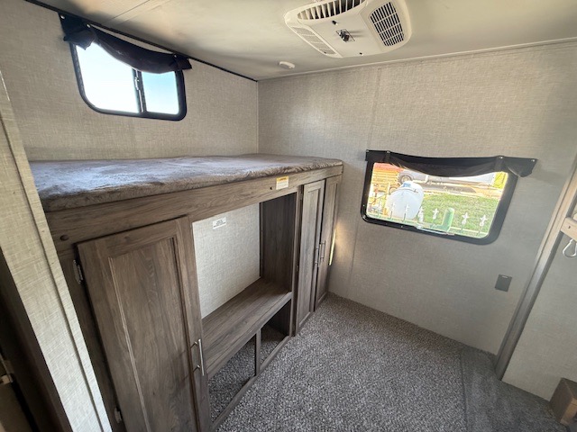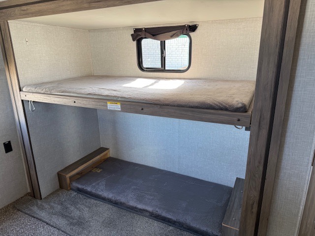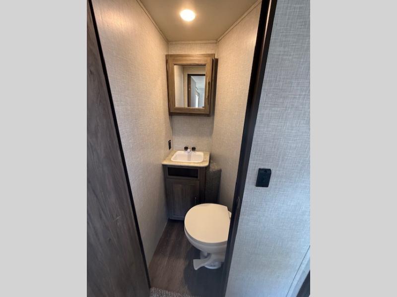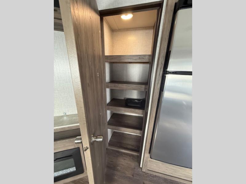 The whole family will love camping in this travel trailer! It features a front private bedroom with a 60" x 74" RV queen bed and a private entrance into the dual-entry bathroom, and a rear private bunkhouse for the kids or guests to sleep on the 38" x 74" flip-up bunk above the 72" tri-fold sofa which is across from a 38" x 74" bunk above a wardrobe. There's room for everyone to watch a movie at the entertainment center between the 60" sofa and the 80" U-shaped dinette slide, and the large pantry is big enough to store everyone's favorite snacks. The dual-entry bathroom is easy to access and has a 34" radius shower with a glass door, a linen closet, and a mirrored medicine cabinet for you to get ready all in one place!