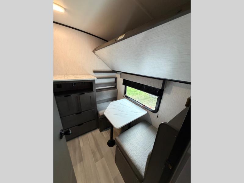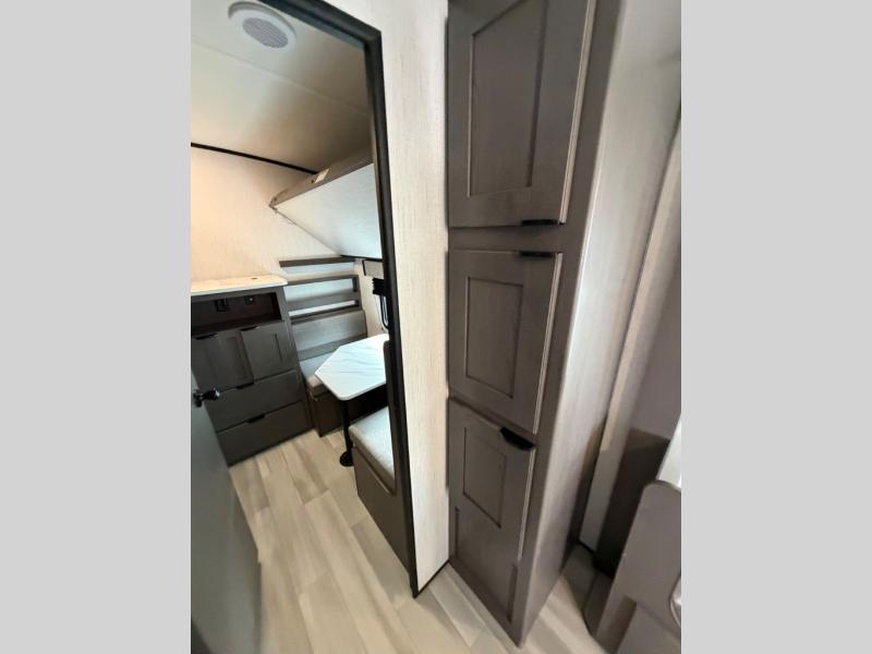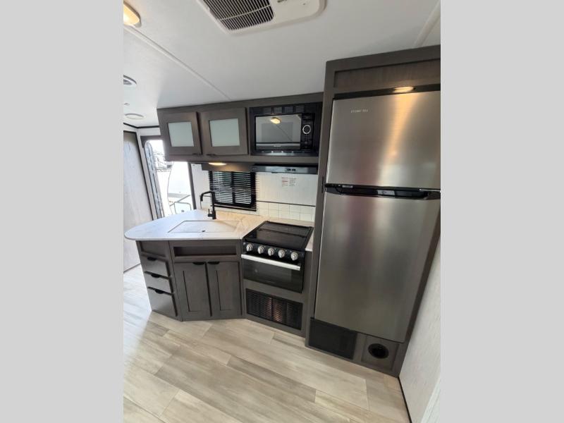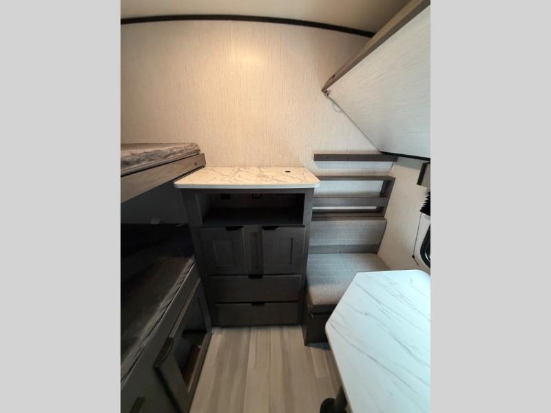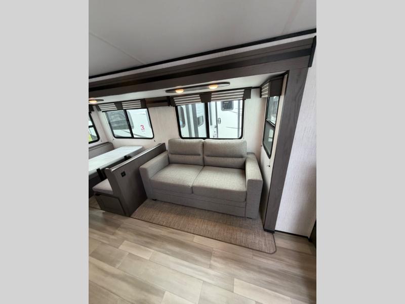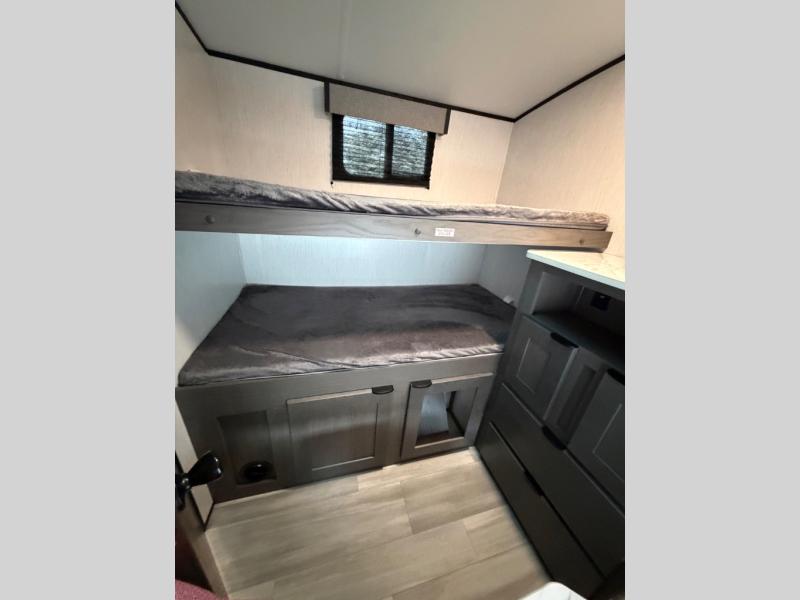 Everyone is going to love this travel trailer with a private bunkhouse! There are triple bunk beds, plus a dinette under one bunk for the kids or your friends to enjoy their own privacy, sleeping space and sitting area. You'll appreciate having your own front private bedroom with a king bed sliding system, and there is a booth dinette and sofa within the large slide out for more seating and sleeping space. Meals can be prepared on the three burner cooktop indoors, or outdoors on the outside griddle. This model also includes a full belly storage system to bring along hiking and fishing gear, and a patio awning for protection from the elements.