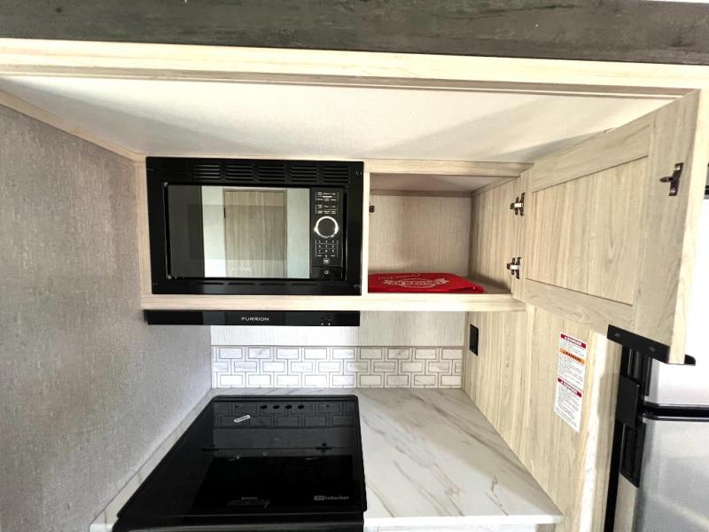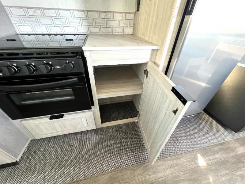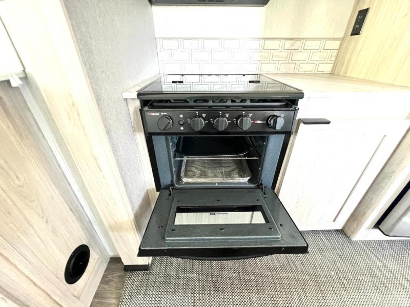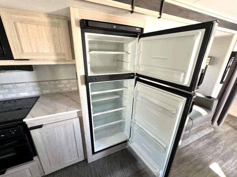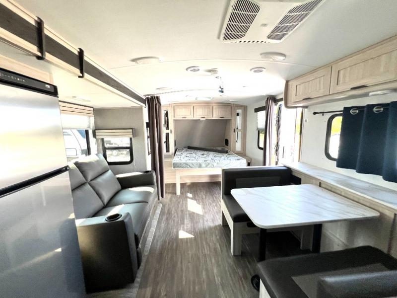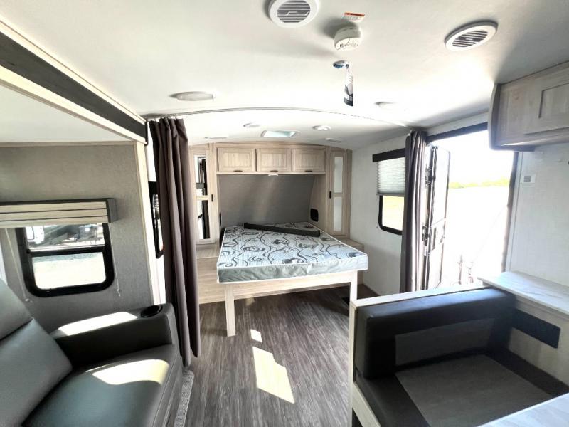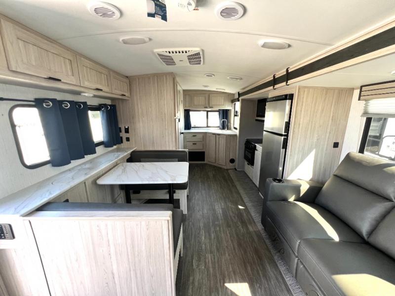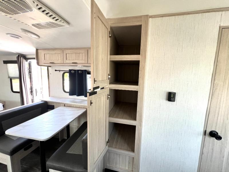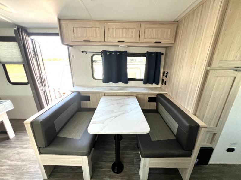 You will have everything you need for a comfortable weekend getaway with this travel trailer! Up front there is a patent pending king bed sliding system with an industry first pet palace with cruise-thru and an under-bed storage design, as well as wardrobes and a privacy curtain to draw at night. The kitchen has a three burner cooktop to fry up some eggs, a 10.7 cu. ft. refrigerator to keep your perishables fresh, and seamless edge countertops for enhanced durability. The booth dinette offers a comfortable place to enjoy your meals and also can transform into an extra sleeping space for a guest or two depending on their size.