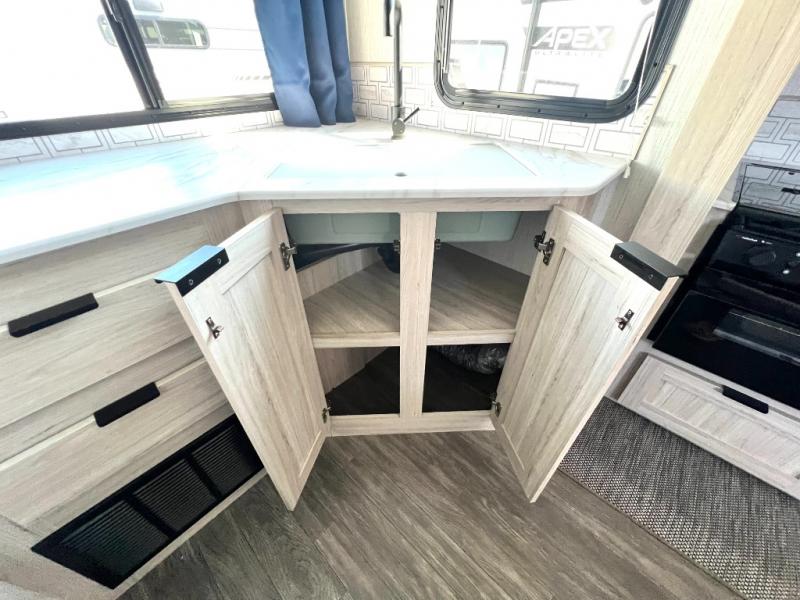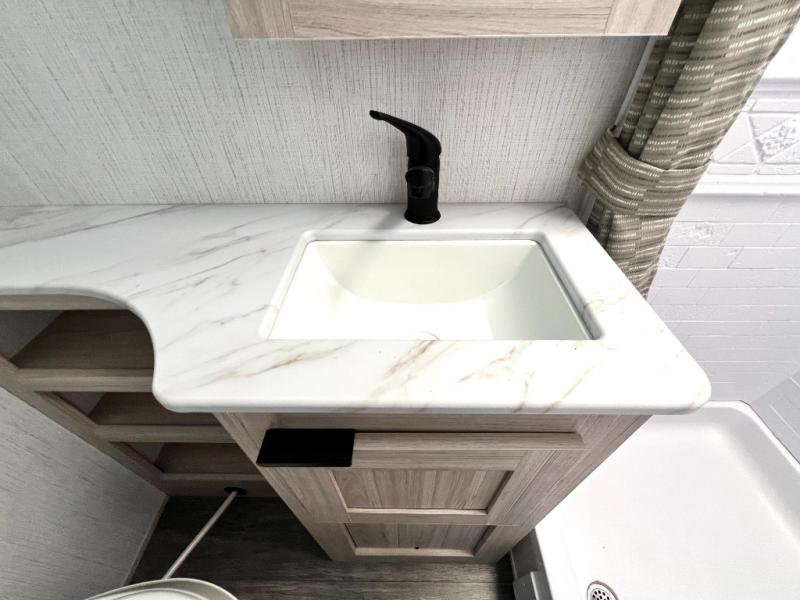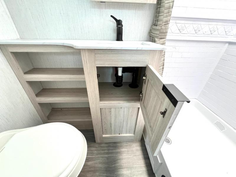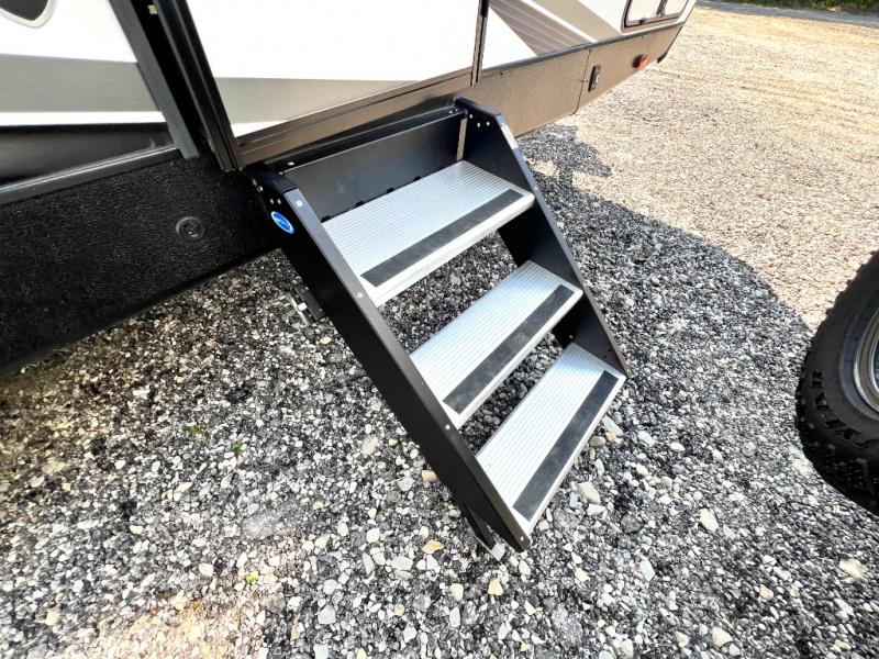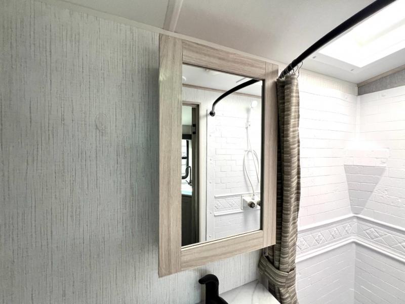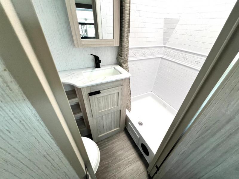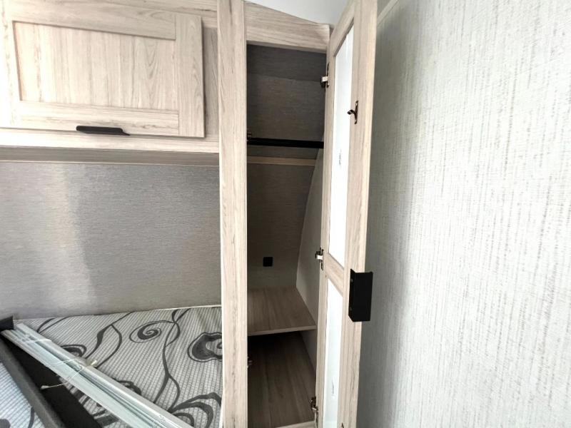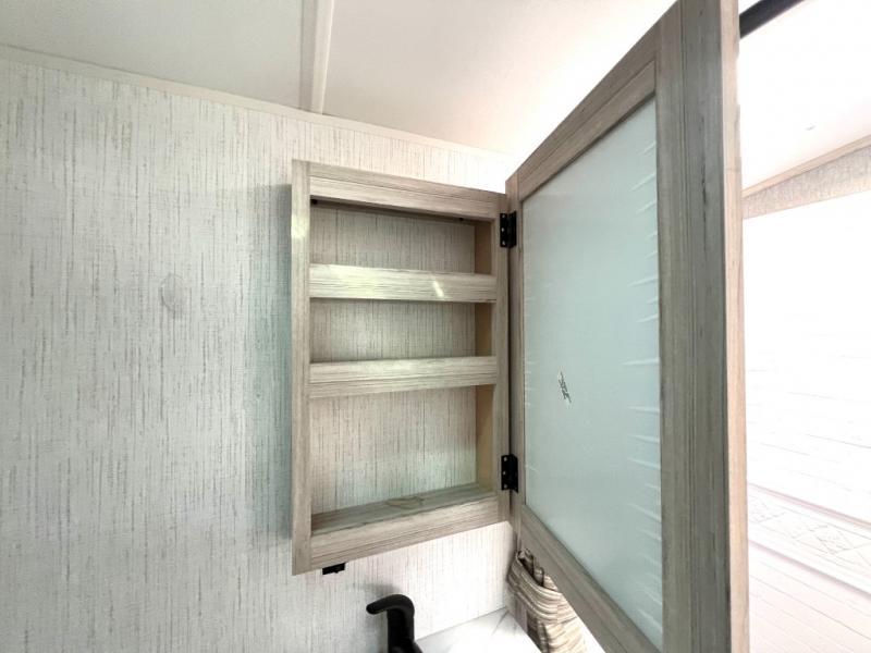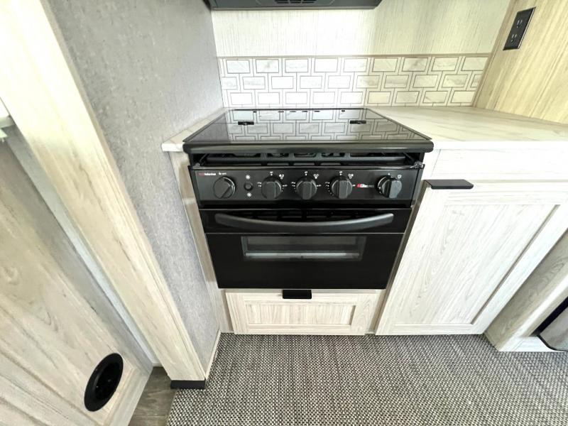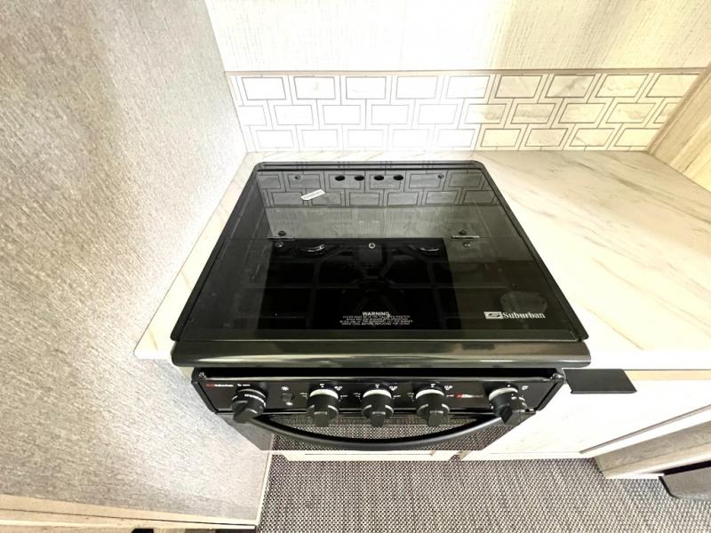 You will have everything you need for a comfortable weekend getaway with this travel trailer! Up front there is a patent pending king bed sliding system with an industry first pet palace with cruise-thru and an under-bed storage design, as well as wardrobes and a privacy curtain to draw at night. The kitchen has a three burner cooktop to fry up some eggs, a 10.7 cu. ft. refrigerator to keep your perishables fresh, and seamless edge countertops for enhanced durability. The booth dinette offers a comfortable place to enjoy your meals and also can transform into an extra sleeping space for a guest or two depending on their size.