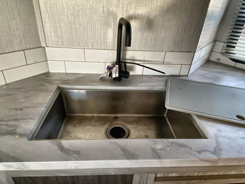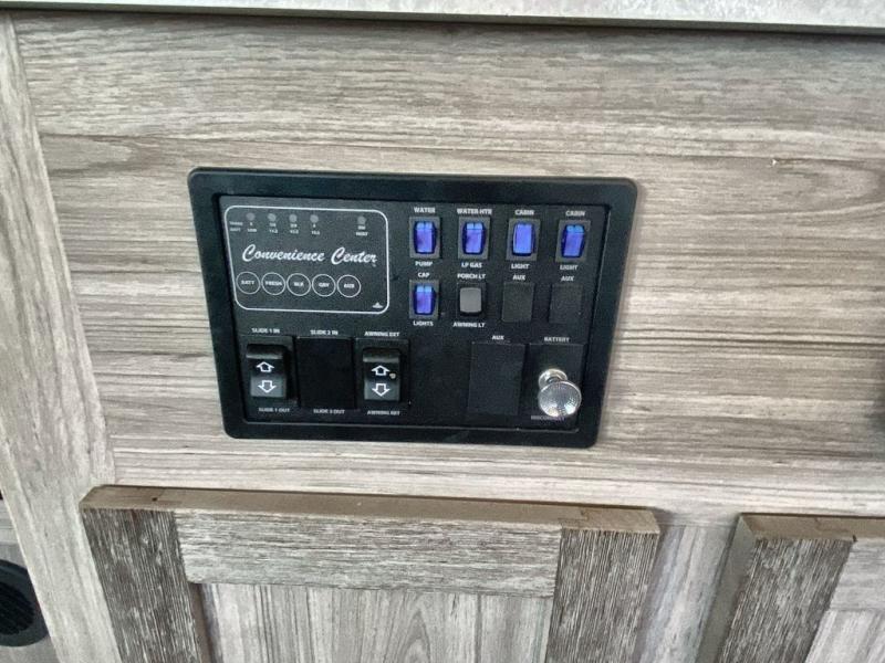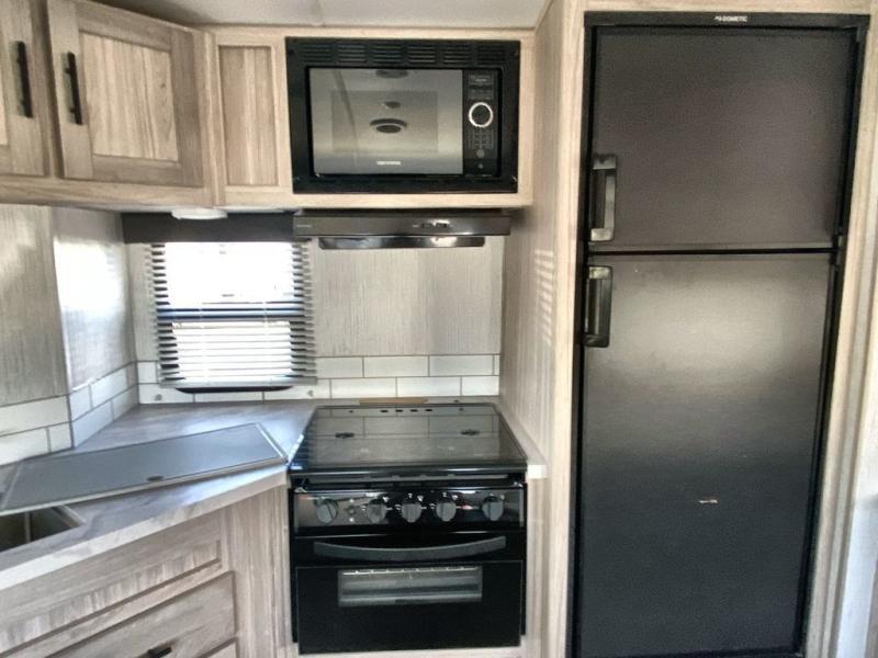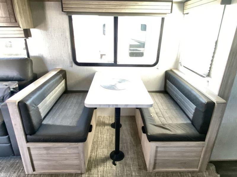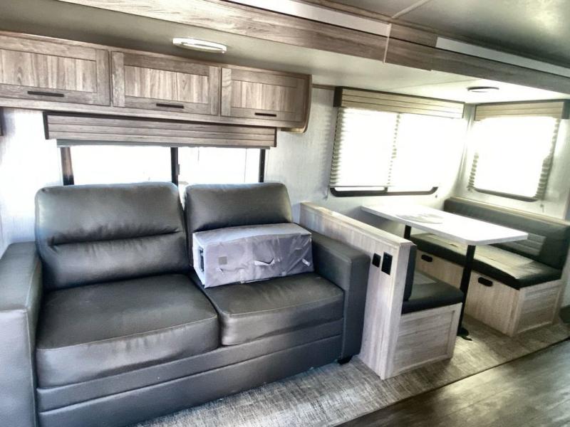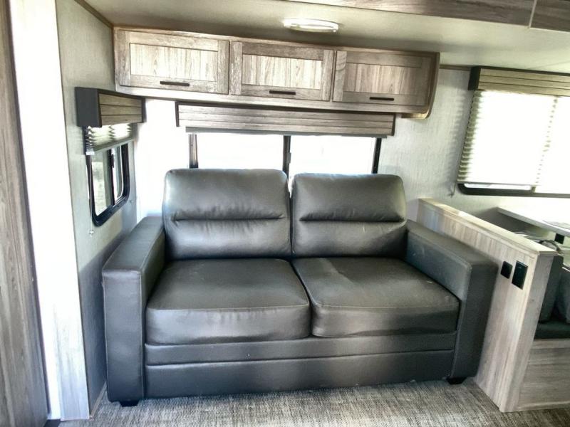 Enjoy a relaxing vacation at the campgrounds with this travel trailer! The full rear bathroom has a full shower for you to rinse the sand out of your hair each day and extra countertop space to set your items. Your bellies will stay full with a walk-in pantry to store your canned goods and snacks, and a three burner cooktop to fry up some bacon. The sofa and booth dinette slide opens up the living/kitchen area while offering comfortable places to dine and socialize, plus they can even transform into extra sleeping spaces. The front private bedroom has a queen bed with wardrobes on either side so you can enjoy a good night's rest!