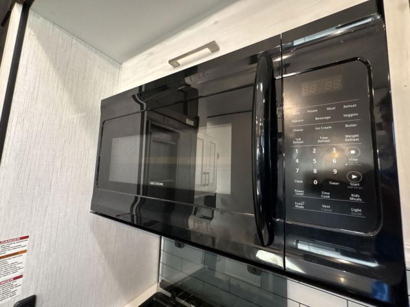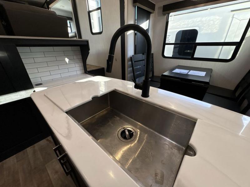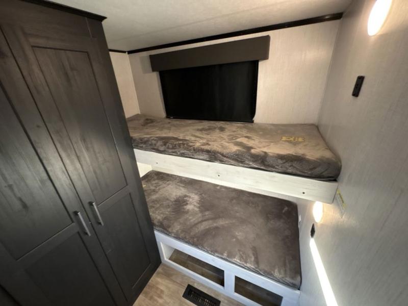 If you like luxury and comfort, you'll undoubtedly love this South Fork fifth wheel! This unit just about has it all with its rear private bedroom, private bunkhouse with a loft above, central kitchen with opposing slides for more prep area, and separate living room up front with a 50" TV and integrated sound bar. The living room also has opposing sofa slides, so you can also use this room as a makeshift bedroom for extra travelers. The bedroom provides you with extra comfort since it has a king-size pillowtop mattress, and you have a place to sit down and eat dinner with the free-standing table with chairs in the kitchen.