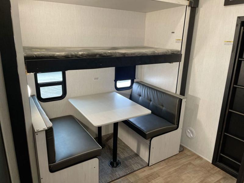 True luxury is having two full bathrooms, and this South Fork fifth wheel delivers that and more! One of the full bathrooms is located in the back creating a bunkhouse suite. This area is also special because it contains the second exterior entry door as a unique rear entry door. Now you don't have to be bothered by kids coming and going while you stay secluded up at the front in your own private bedroom. This bedroom has a king-size pillowtop mattress so that you can sleep in extreme comfort each night, and there is also a full-width wardrobe for you to store your many different outfits. The 50" TV with integrated sound bar will provide great entertainment for the whole group, and there is a sofa and half booth dinette for you to relax on while you watch.