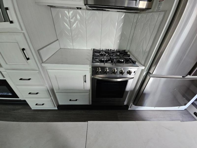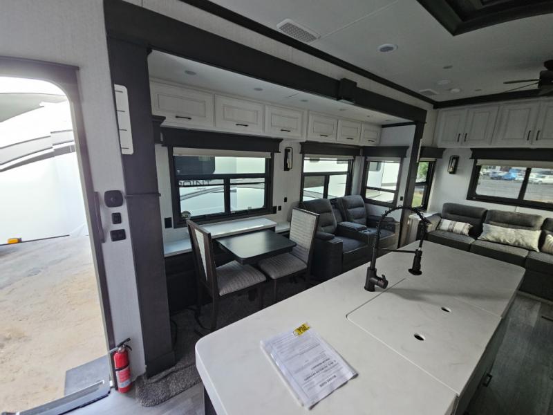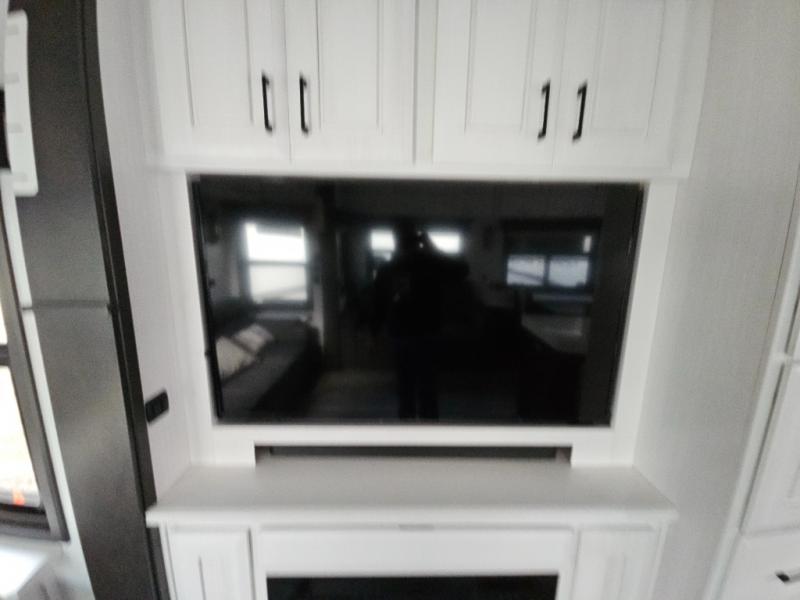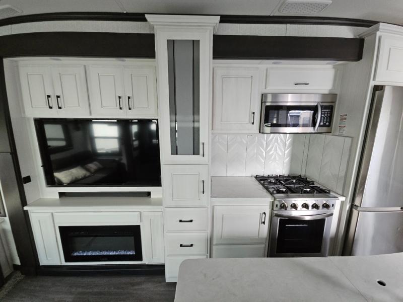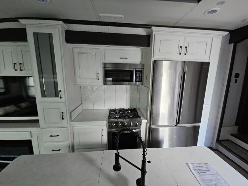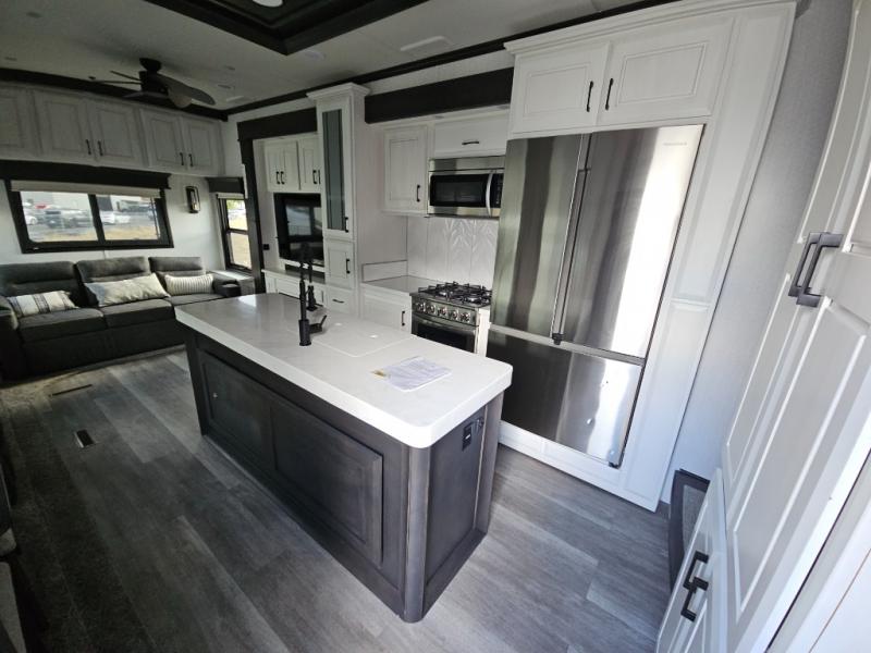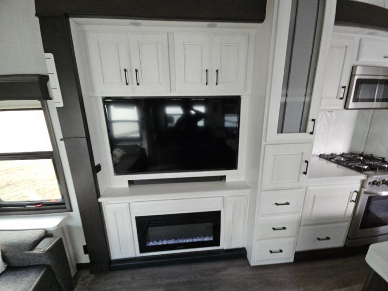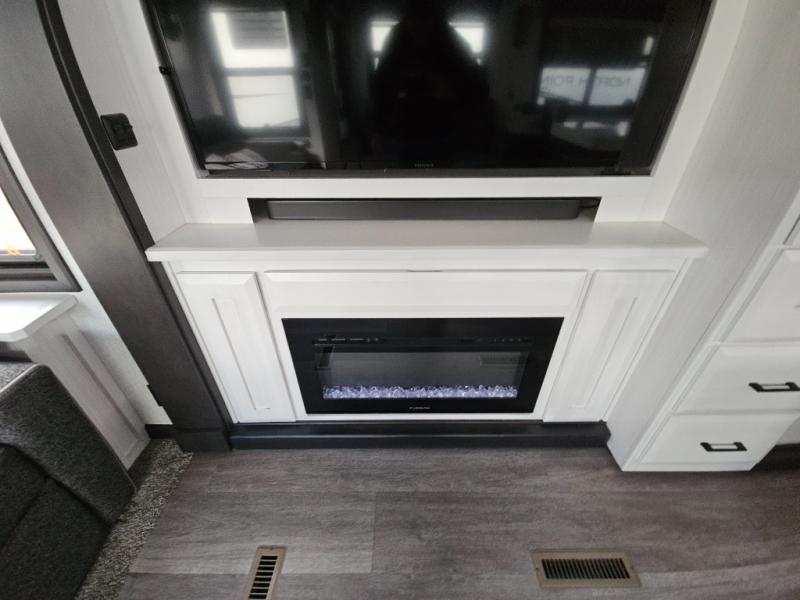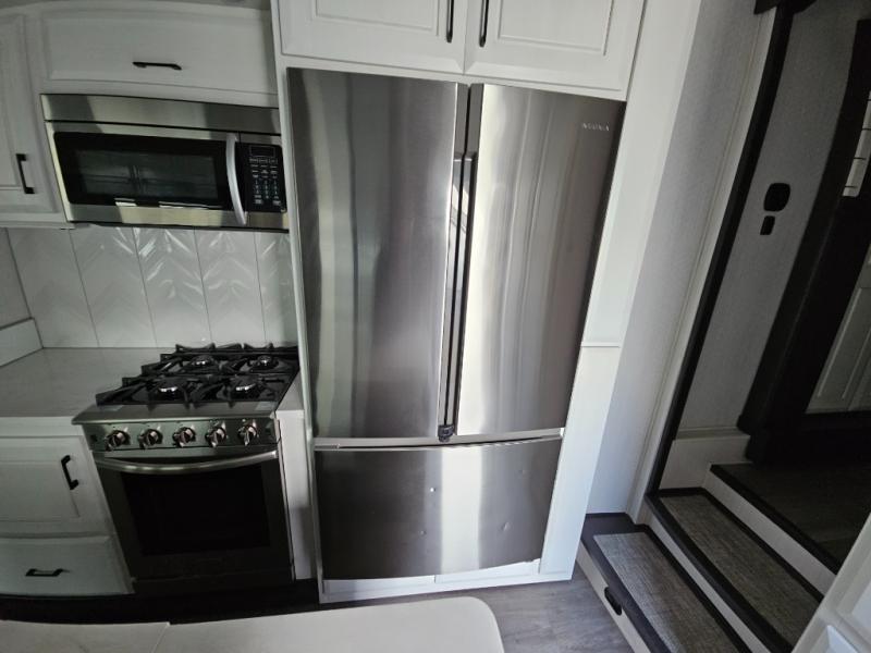 Triple slides for added space, a residential hide-a-bed sofa, and a spacious front bedroom make this fifth wheel family-friendly and ready to go! The chef of the family will have plenty of counter space to prep meals at the kitchen island, and leftovers can go in the residential stainless steel French door refrigerator. The kids can play a game at the dinette table with a hidden leaf extension if more want to join, or everyone can relax in front of the fireplace. The hardwood steps leading up to the full bath and front front private bedroom will make it feel more like home, and there is washer/dryer prep if you want the option to make laundry day easier. When it's finally time to catch some zzz's, you can sleep soundly on the slide out king bed, or choose the optional queen bed or optional Sleep Number bed by Select Comfort!