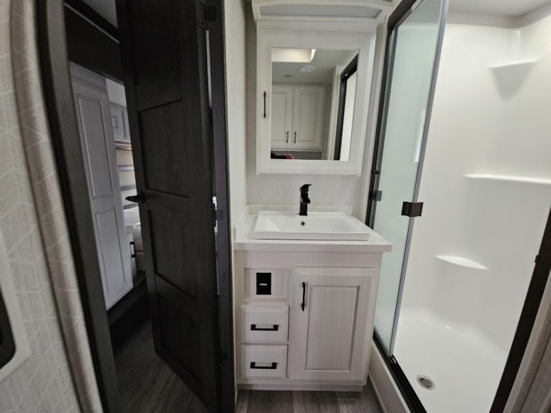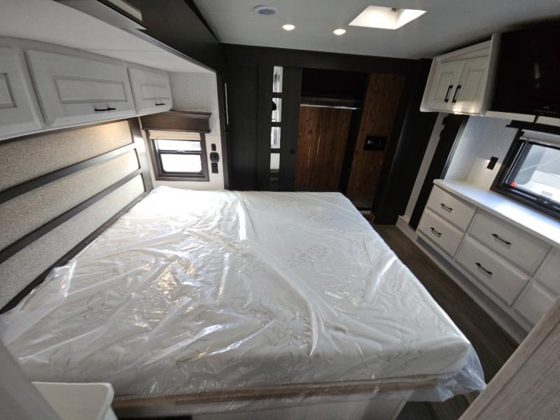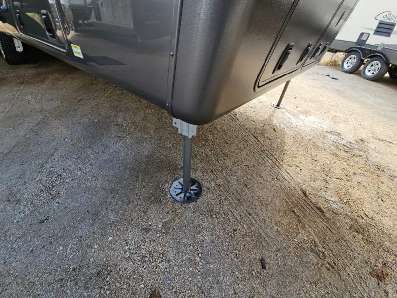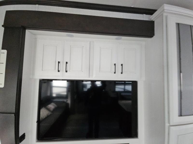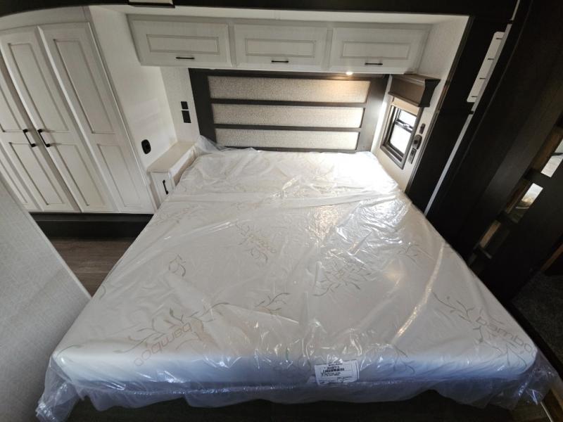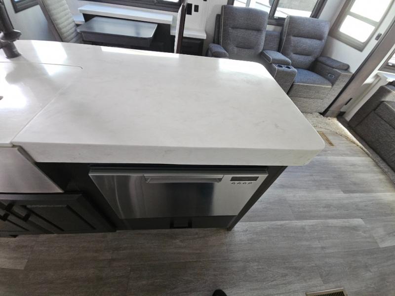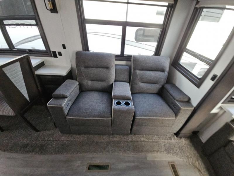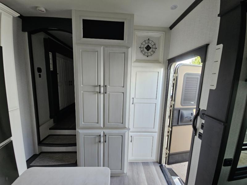 Triple slides for added space, a residential hide-a-bed sofa, and a spacious front bedroom make this fifth wheel family-friendly and ready to go! The chef of the family will have plenty of counter space to prep meals at the kitchen island, and leftovers can go in the residential stainless steel French door refrigerator. The kids can play a game at the dinette table with a hidden leaf extension if more want to join, or everyone can relax in front of the fireplace. The hardwood steps leading up to the full bath and front front private bedroom will make it feel more like home, and there is washer/dryer prep if you want the option to make laundry day easier. When it's finally time to catch some zzz's, you can sleep soundly on the slide out king bed, or choose the optional queen bed or optional Sleep Number bed by Select Comfort!