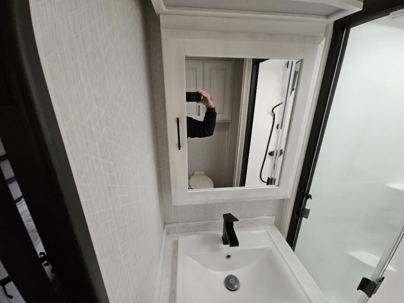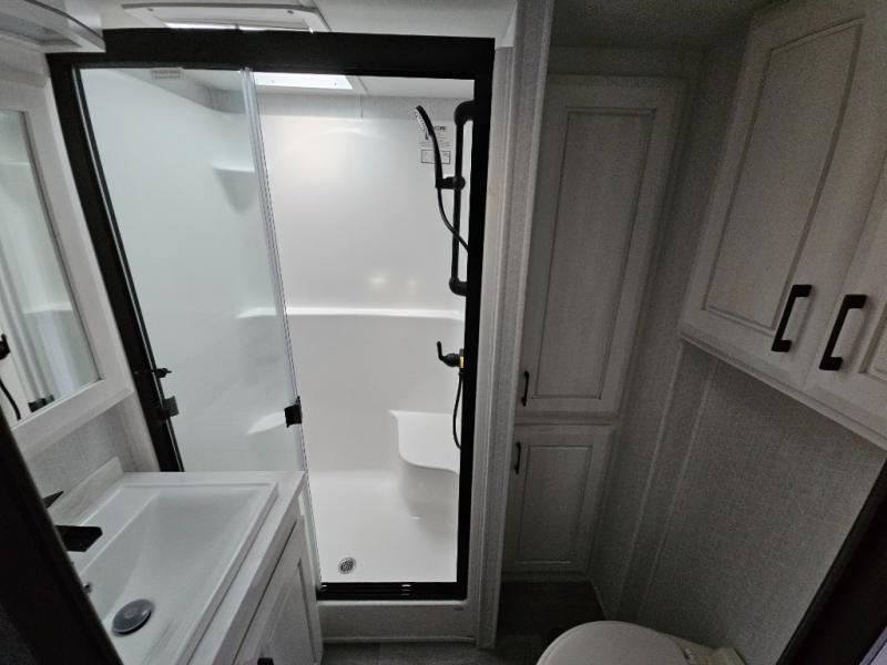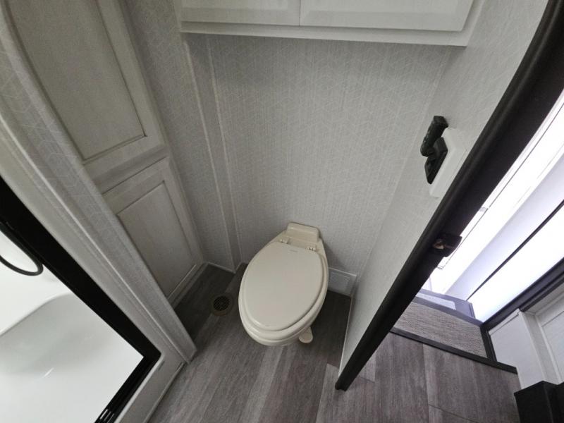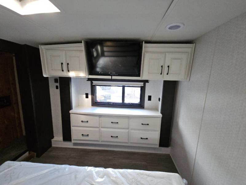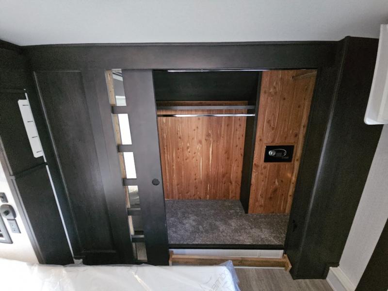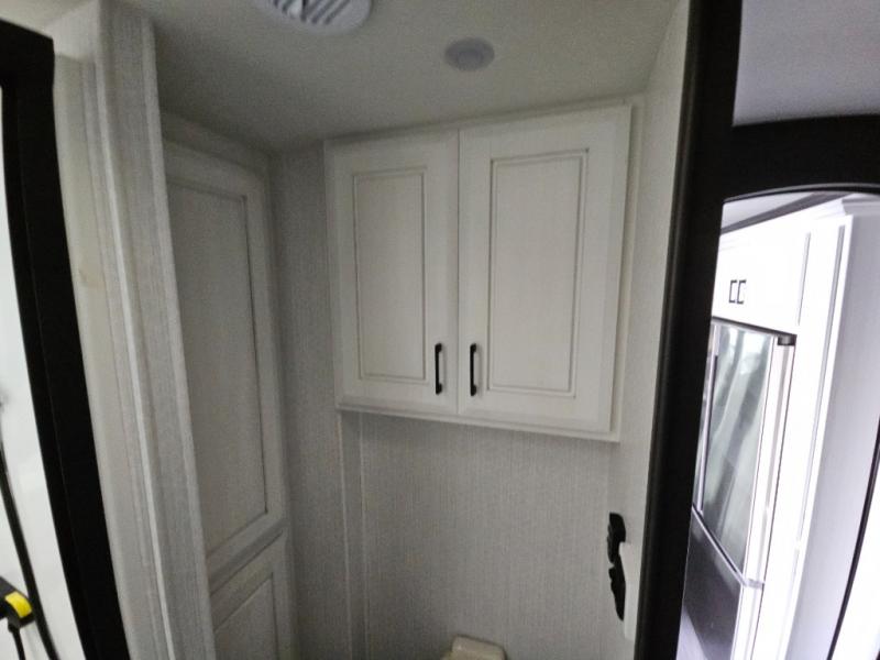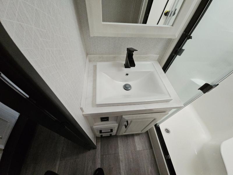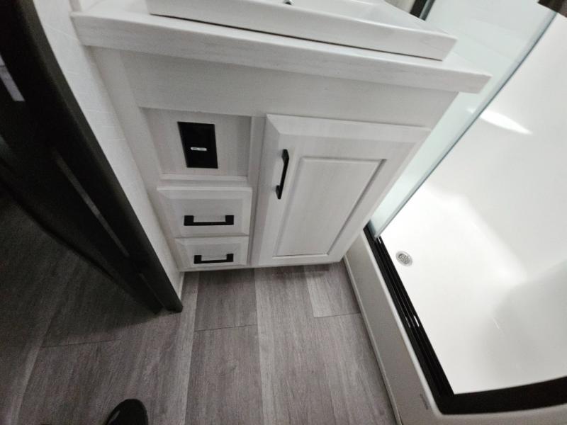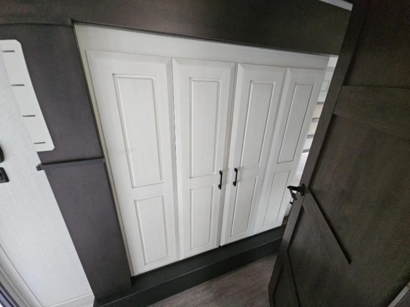 Triple slides for added space, a residential hide-a-bed sofa, and a spacious front bedroom make this fifth wheel family-friendly and ready to go! The chef of the family will have plenty of counter space to prep meals at the kitchen island, and leftovers can go in the residential stainless steel French door refrigerator. The kids can play a game at the dinette table with a hidden leaf extension if more want to join, or everyone can relax in front of the fireplace. The hardwood steps leading up to the full bath and front front private bedroom will make it feel more like home, and there is washer/dryer prep if you want the option to make laundry day easier. When it's finally time to catch some zzz's, you can sleep soundly on the slide out king bed, or choose the optional queen bed or optional Sleep Number bed by Select Comfort!