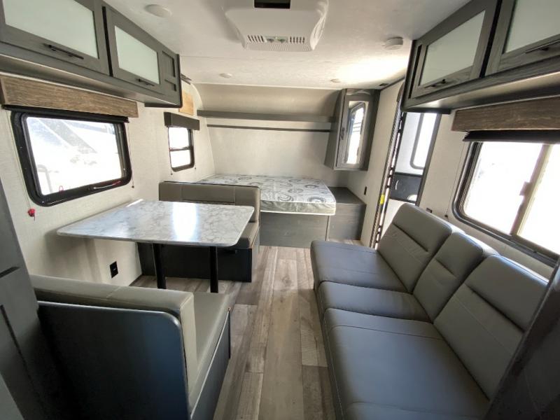 You and your spouse will love camping in this travel trailer! Get a good night's rest each night on the front queen bed with storage for your items, and enjoy your meals at the booth dinette which were prepared with the two burner range and 7 cu. ft. refrigerator, plus you can even transform the dinette into an extra sleeping space. Take an afternoon nap on the jackknife sofa or freshen up in the rear corner bathroom. With oversized windows throughout, you will enjoy plenty of sunlight!