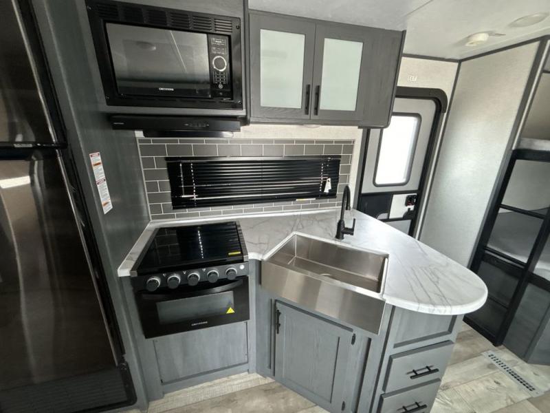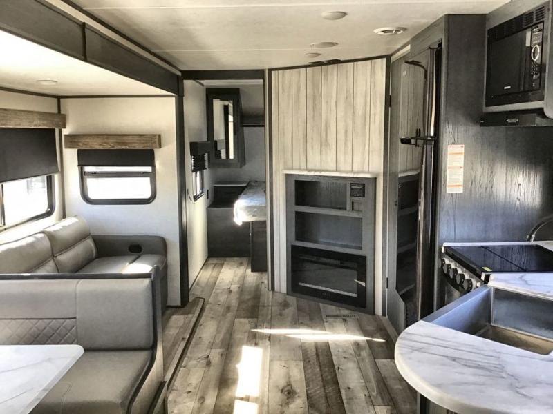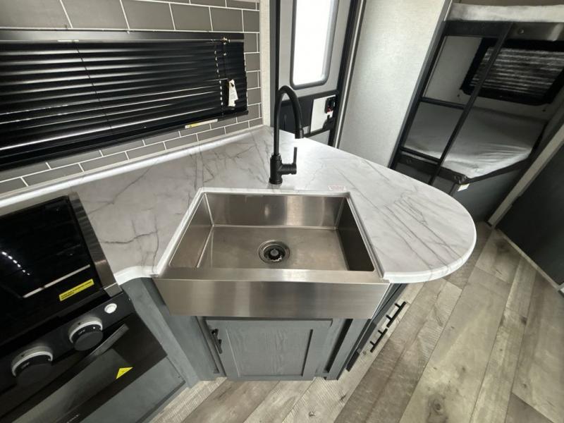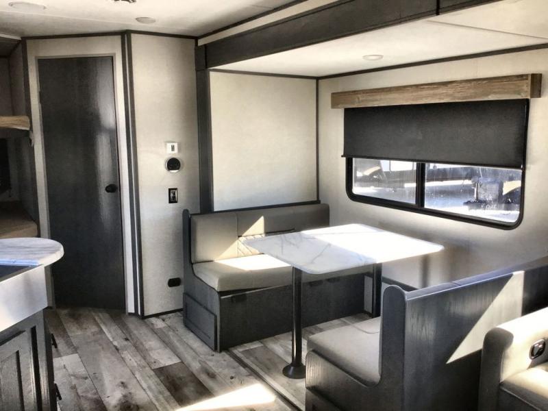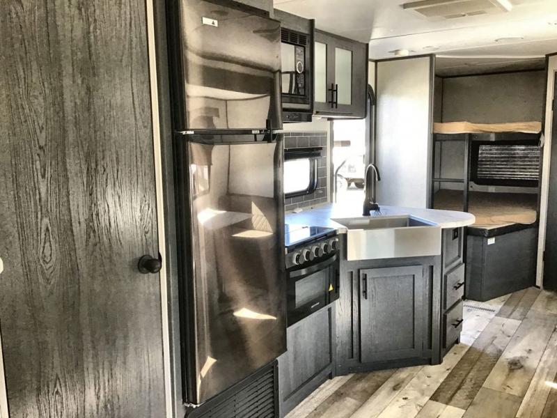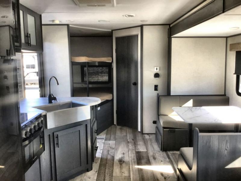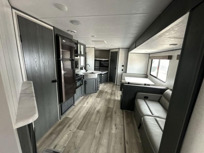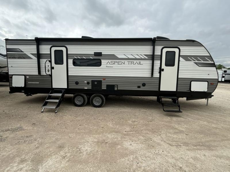 You won't know where to begin with this Aspen Trail travel trailer that has two entry doors! The kids will love sleeping on the rear set of double-size bunks, and you will love having your own private retreat in the front bedroom that has a queen-size bed always waiting for you. The U-shaped dinette and sofa rest upon the large slide which provides extra moving space. Grab a snack from the large pantry and head outdoors to see what the chef is grilling up at the outdoor kitchen!