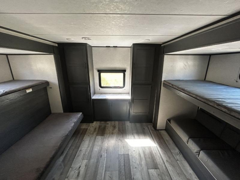 Don't pass up your chance to camp in luxury with this Aspen Trail travel trailer! The rear private bunkhouse is sure to be a hit with your kids. Inside the bunkhouse there is not only one set of bunk beds on a slide, but there is also a second set of bunk beds on a slide, and two closets for your things. The full bathroom is even located just outside of the bunkhouse which will come in very handy at night. Everyone will love gathering together for meal time at the U-shaped dinette and sofa, but if you want to breathe in the fresh air while you eat, then grab a chair and table from the exterior mega pass-through storage compartment and set it up underneath the 18' power awning!