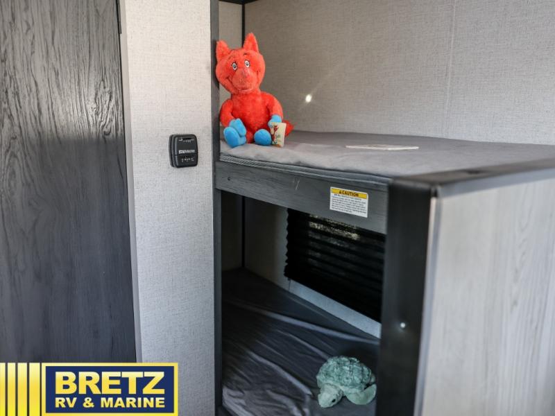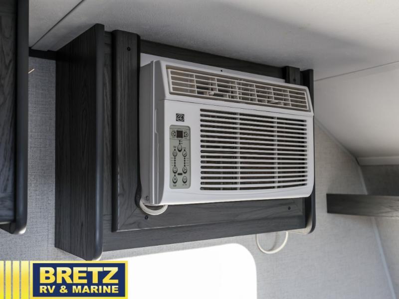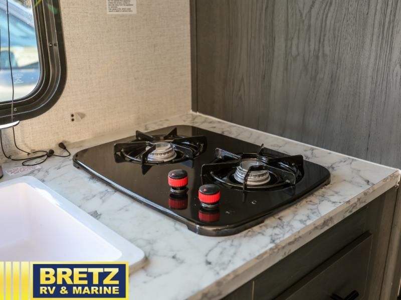 This compact trailer gives you all the conveniences you need while camping, plus comfort! The front queen bed, the bunk beds and the booth dinette offer sleeping space for five, the toilet and shower room offer privacy and a great place to change clothes, and the galley kitchen offers a two burner range top to make meals, a 3.3 cu. ft. refrigerator for cold items, and galley sink with high rise faucet. You can also enjoy the power awning with LED light when wanting some fresh air and protection from the sun.