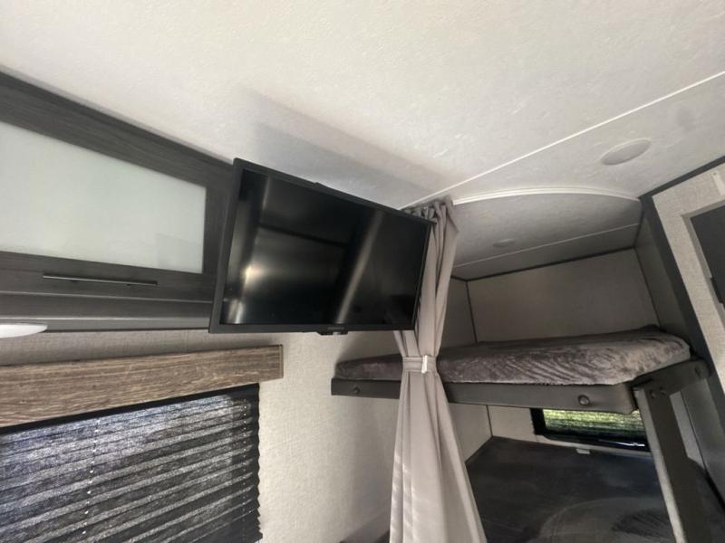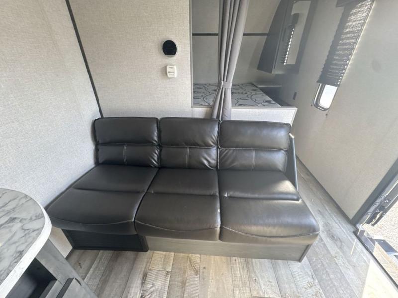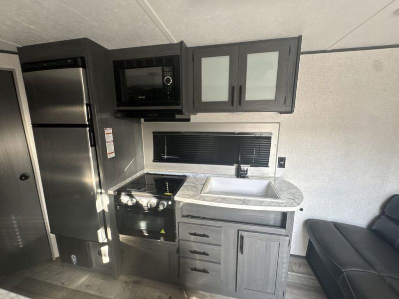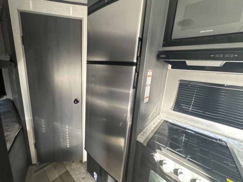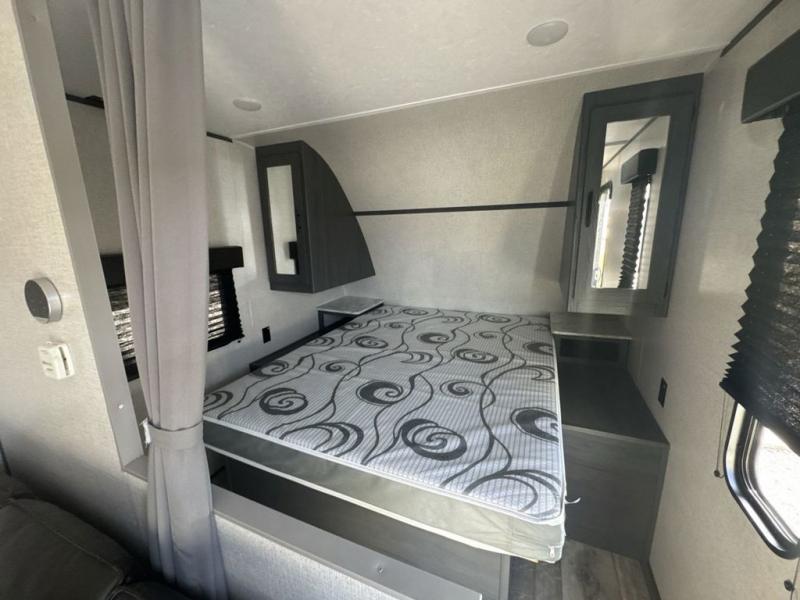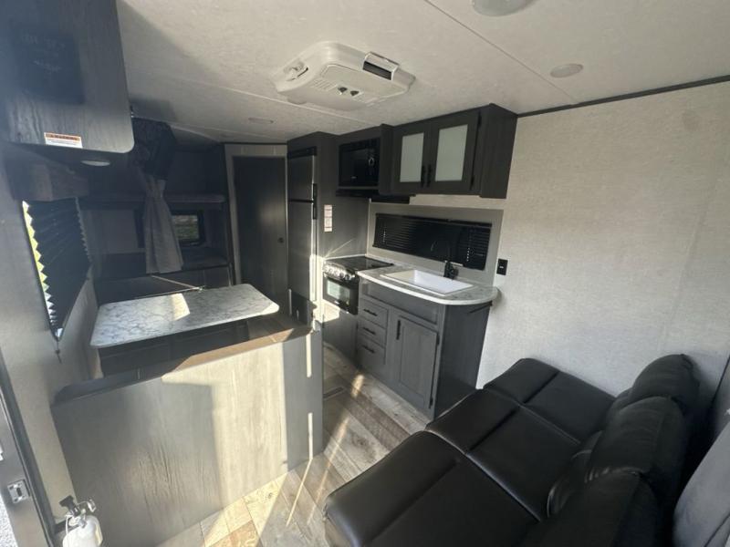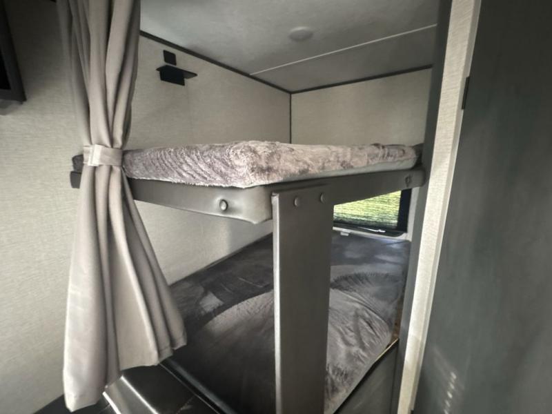 Enjoy privacy in the front bedroom when you close the curtains. You can sleep on your own residential queen bed, and there are two wardrobes to stow away your clothes. Your family and friends can sleep on the double-size bunks in the rear next to the full bathroom with a shower, and the booth dinette as well as the sofa provide extra sleeping space. The 7 cu. ft. refrigerator will hold your cold items, and you can cook using the range top, and keep everything clean using the galley sink with high rise faucet. And the overhead cabinets will hold your dishes, snacks and such.