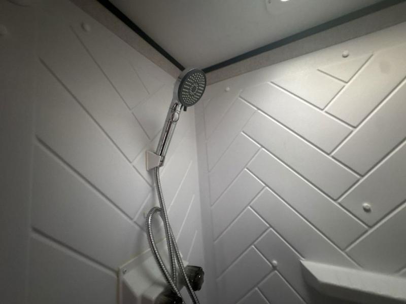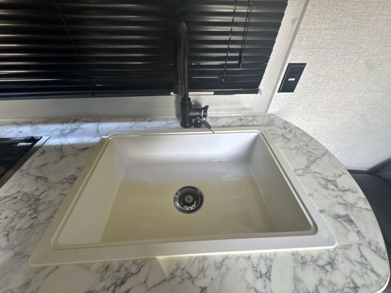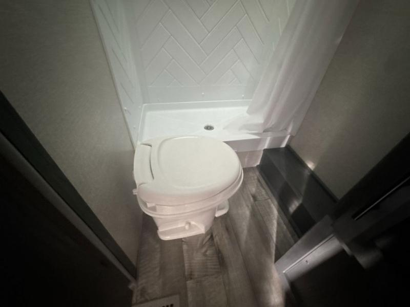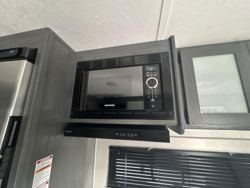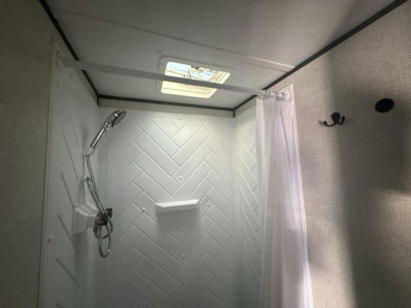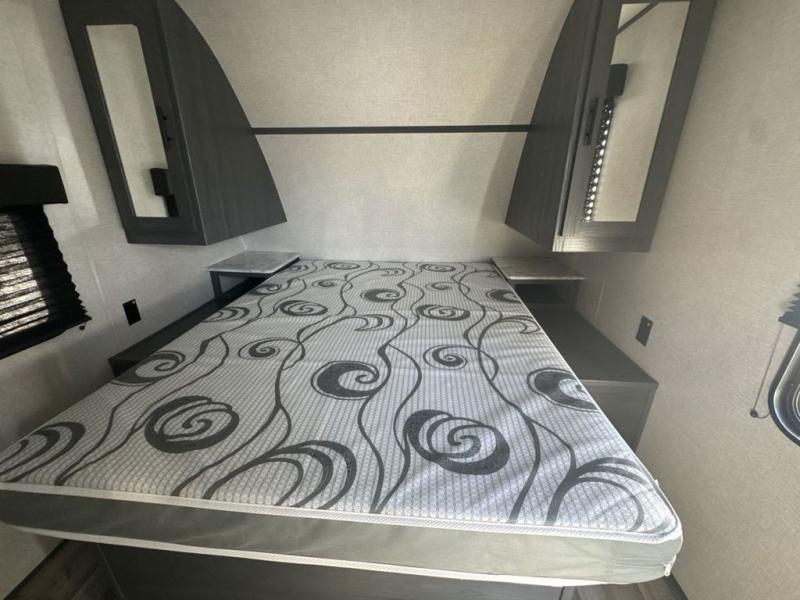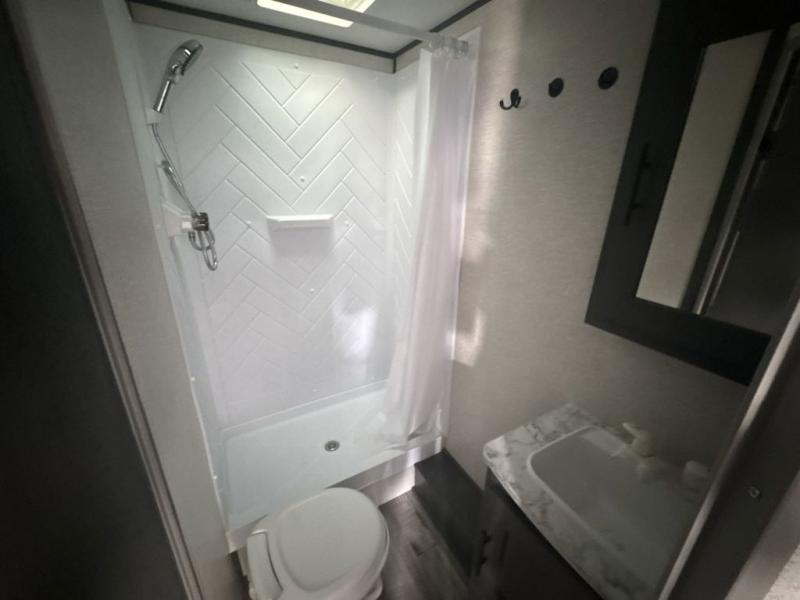 Enjoy privacy in the front bedroom when you close the curtains. You can sleep on your own residential queen bed, and there are two wardrobes to stow away your clothes. Your family and friends can sleep on the double-size bunks in the rear next to the full bathroom with a shower, and the booth dinette as well as the sofa provide extra sleeping space. The 7 cu. ft. refrigerator will hold your cold items, and you can cook using the range top, and keep everything clean using the galley sink with high rise faucet. And the overhead cabinets will hold your dishes, snacks and such.