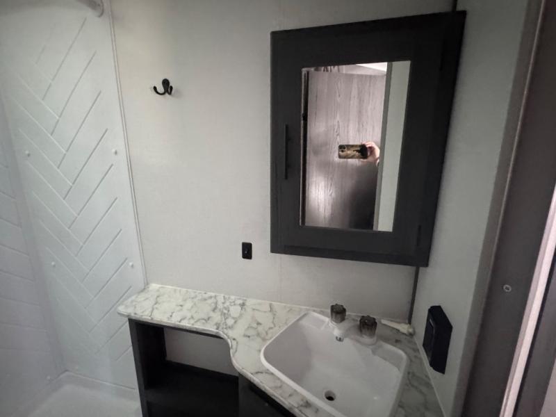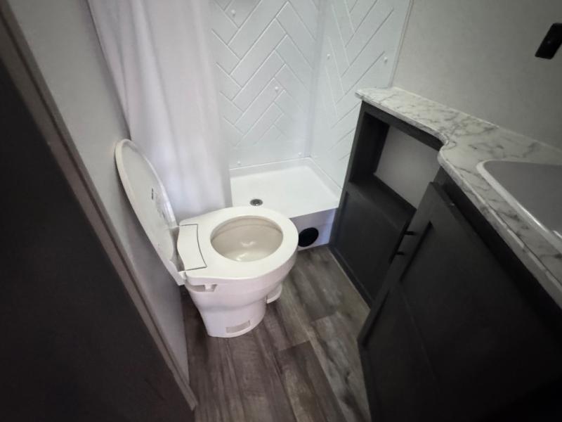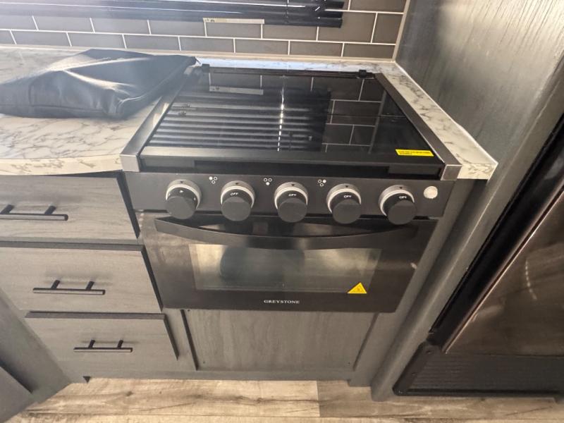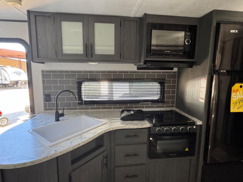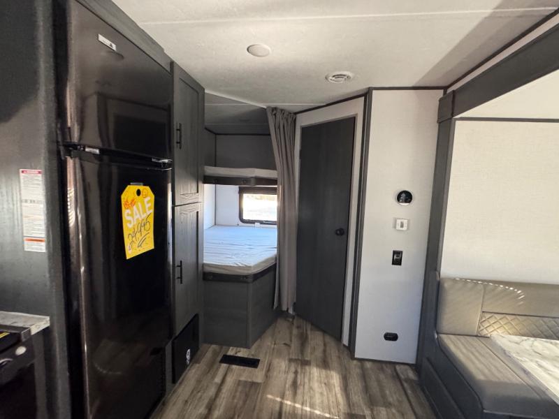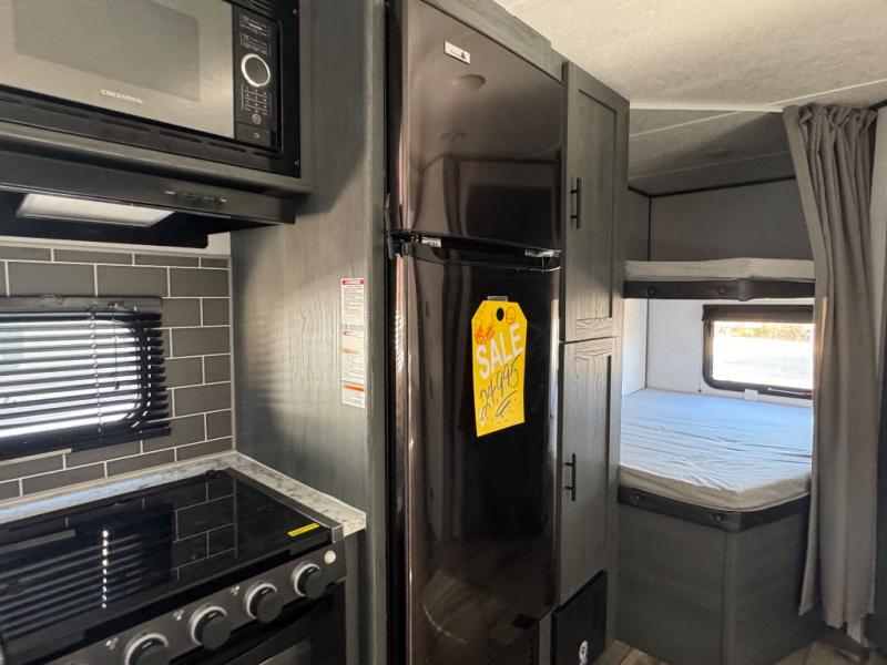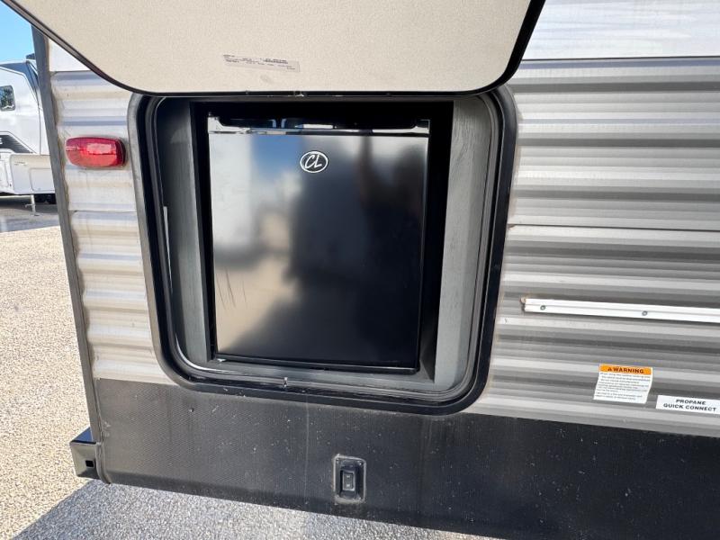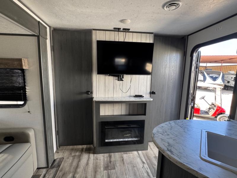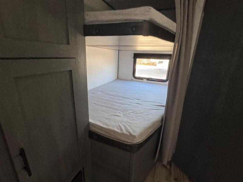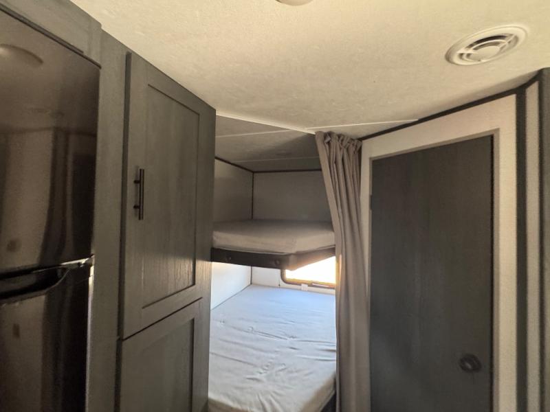 Get ready for fun and relaxation at the campgrounds with this trailer in your campsite. You can fish in the river, hike the trails and relax under the power awning before heading inside to enjoy the comforts of home. You will also enjoy having double access to the private bedroom which offers a residential queen bed and dual wardrobes, plus the full bathroom will keep you refreshed after outdoor fun. The double-size bunks offer sleeping for four, and the furniture doubles as extra sleeping space. The cook will have full amenities including a 7 cu. ft. refrigerator to store lots of cold items. And the single slide gives everyone more floor space.