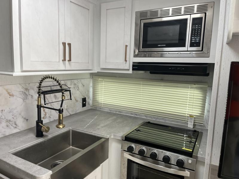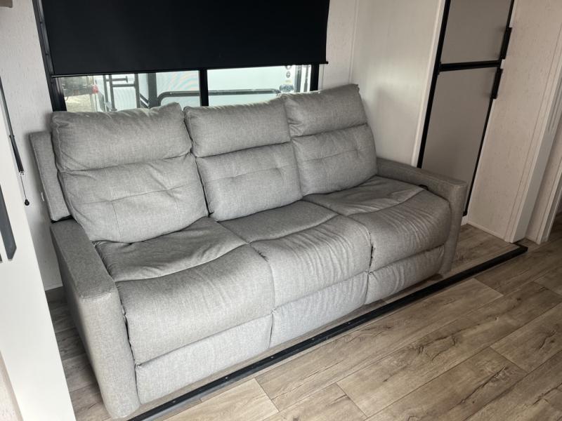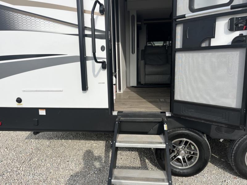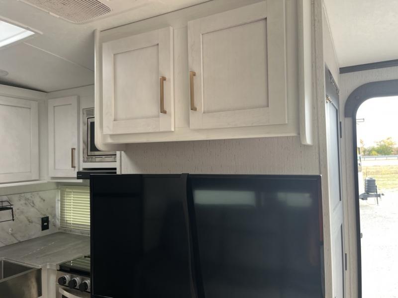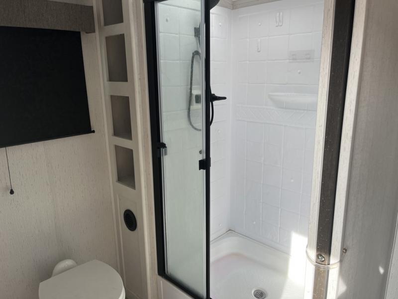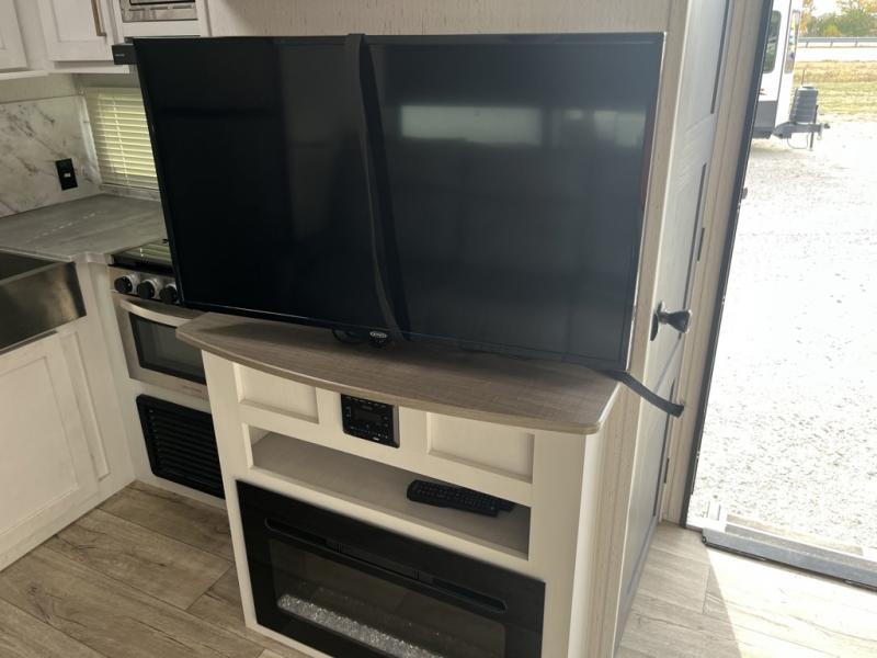 This travel trailer is perfect for two people looking to getaway for the weekend! It features a front private bedroom with a king bed to lay your head at night with wardrobes and nightstands on either side. You can prepare your best meals with the glass top three burner cooktop with a 21" oven and the 10 cu. ft. double door refrigerator then enjoy them at the 78" chaise lounge with a removeable table. The lounge is also conveniently across from an entertainment center with a fireplace and a HD LED TV. Inside the full rear bathroom is a walk-in shower to freshen up in each morning and a closet to keep your linens close.