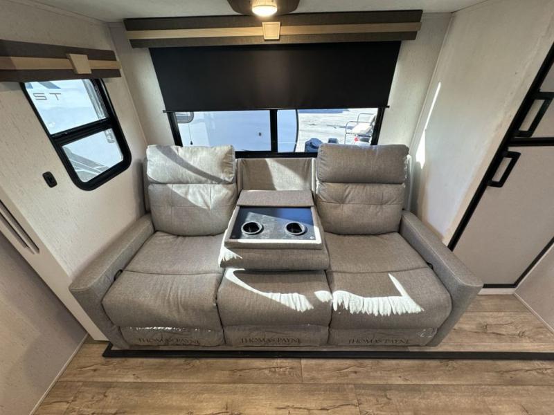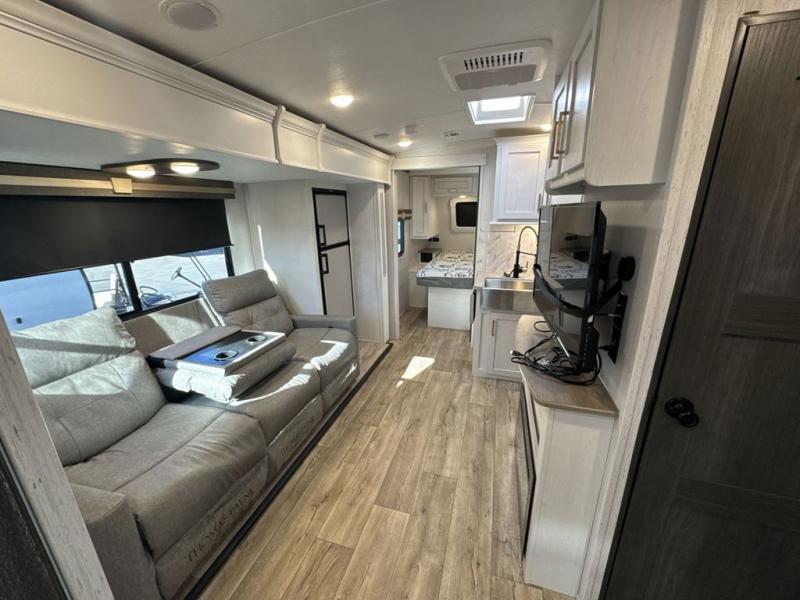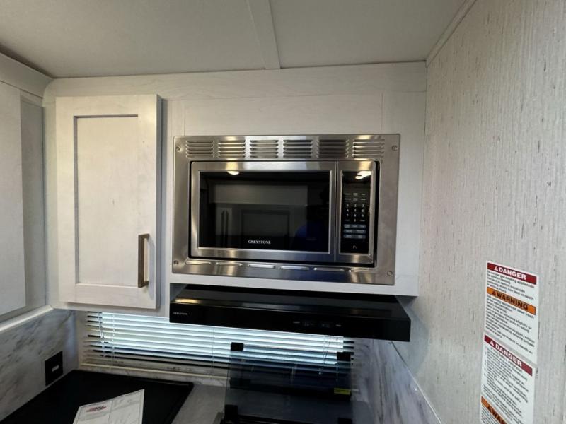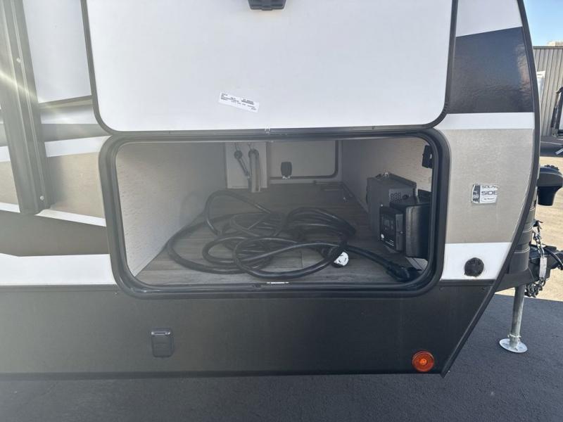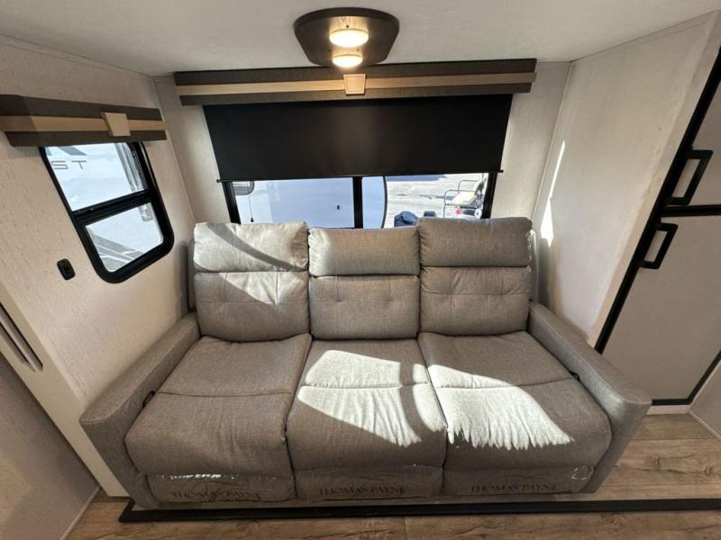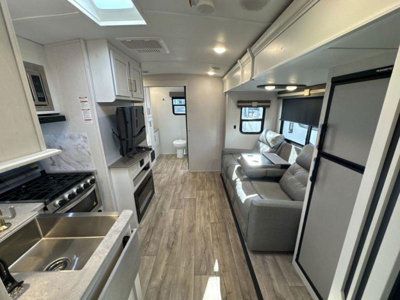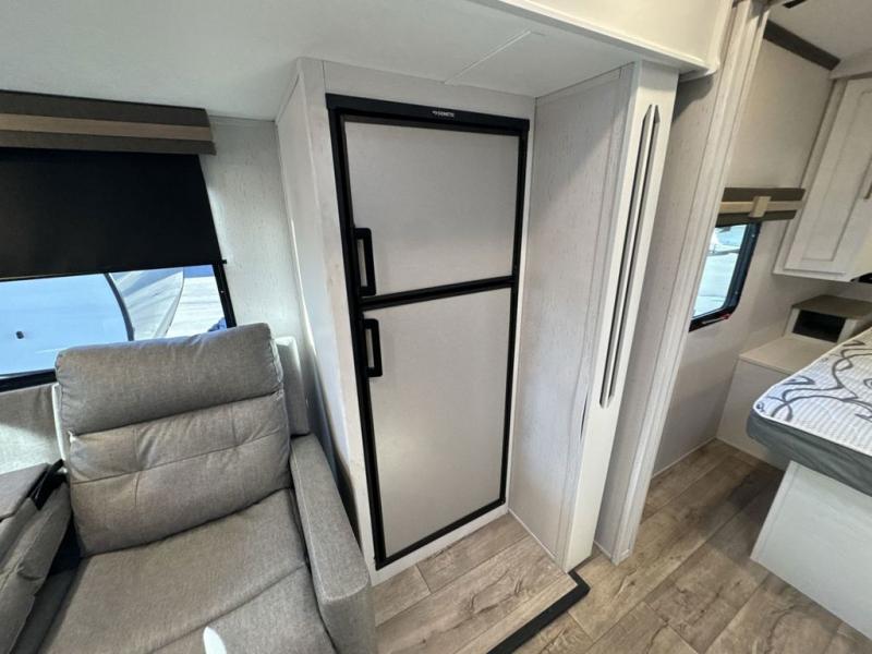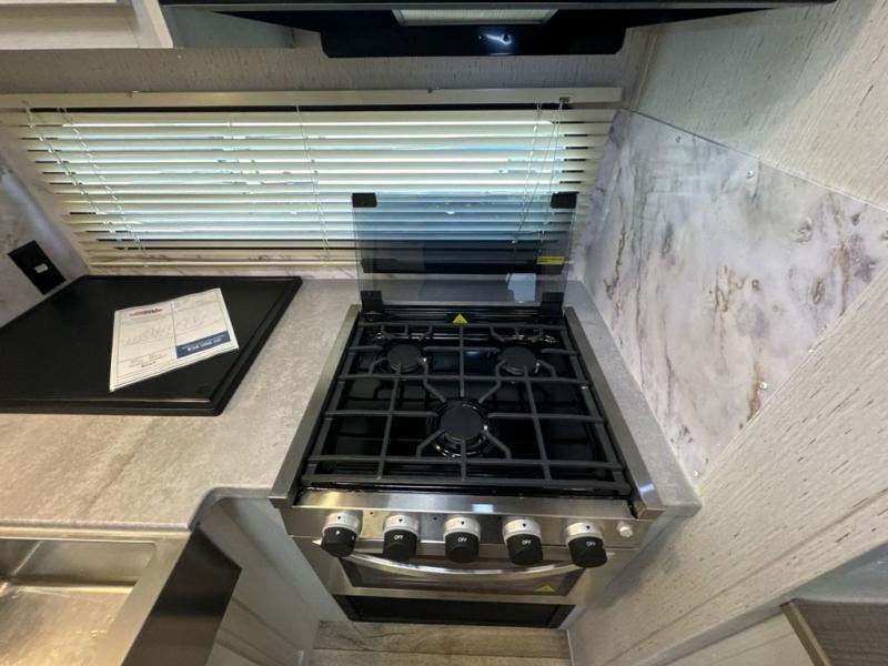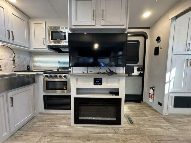 This travel trailer is perfect for two people looking to getaway for the weekend! It features a front private bedroom with a king bed to lay your head at night with wardrobes and nightstands on either side. You can prepare your best meals with the glass top three burner cooktop with a 21" oven and the 10 cu. ft. double door refrigerator then enjoy them at the 78" chaise lounge with a removeable table. The lounge is also conveniently across from an entertainment center with a fireplace and a HD LED TV. Inside the full rear bathroom is a walk-in shower to freshen up in each morning and a closet to keep your linens close.