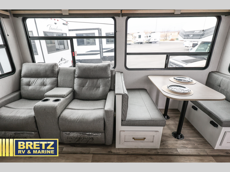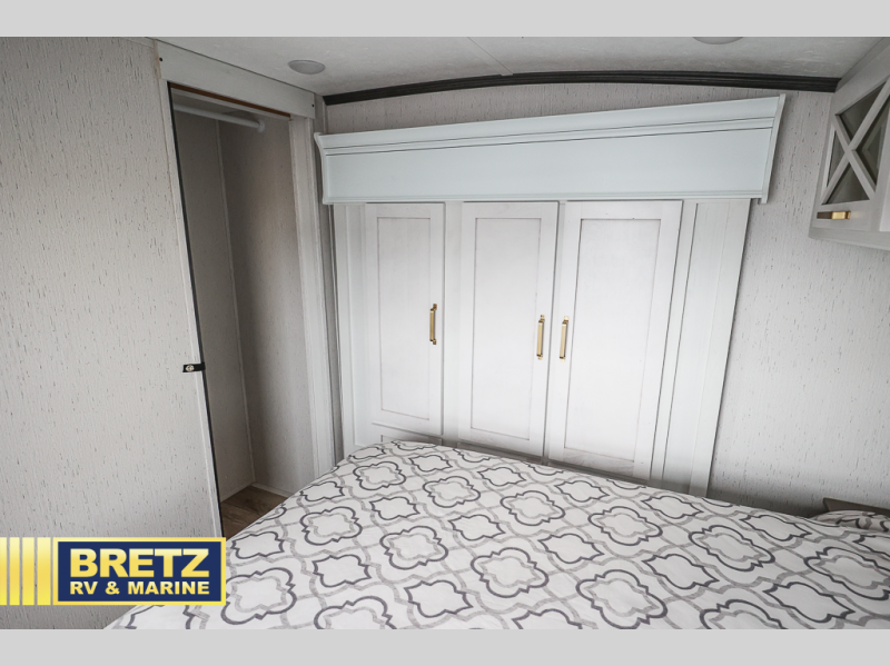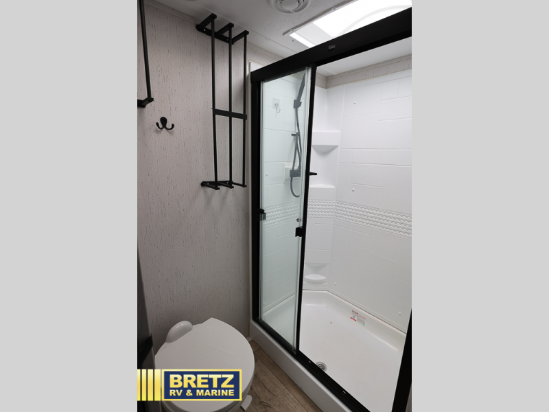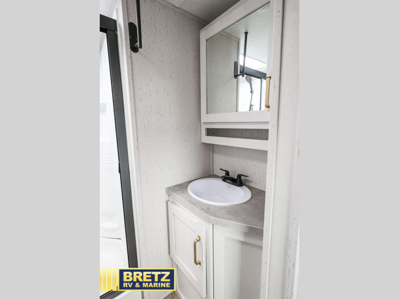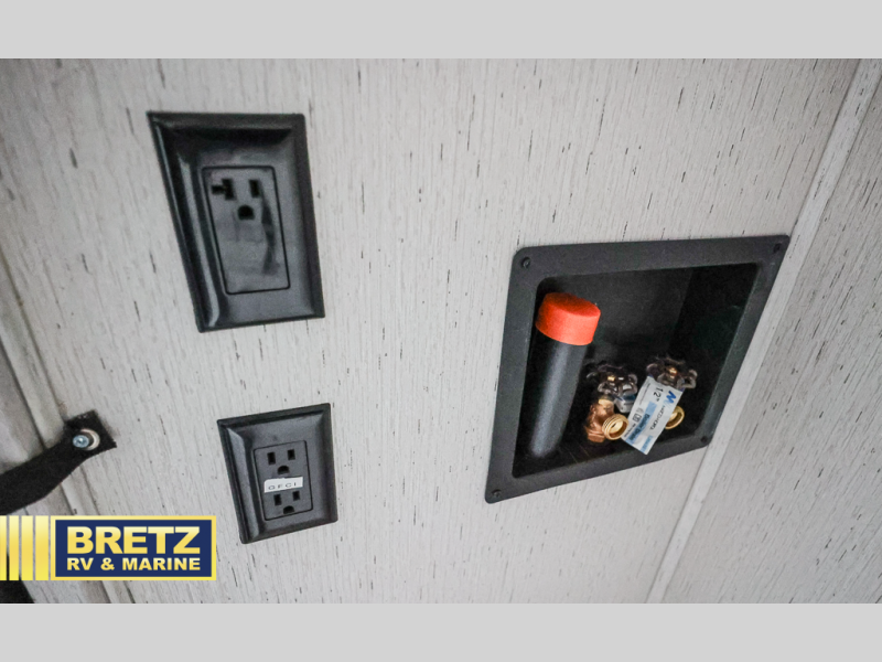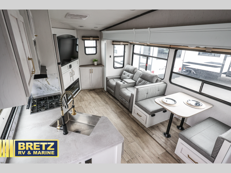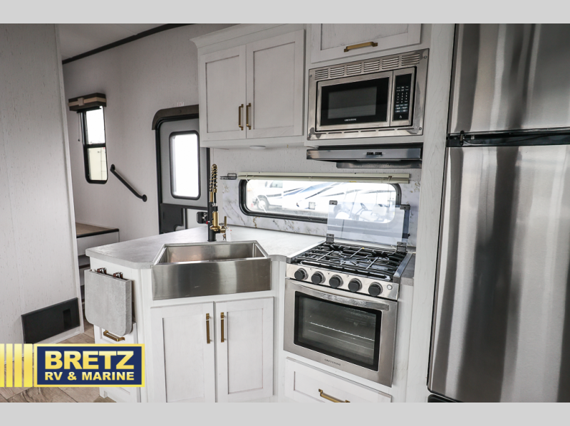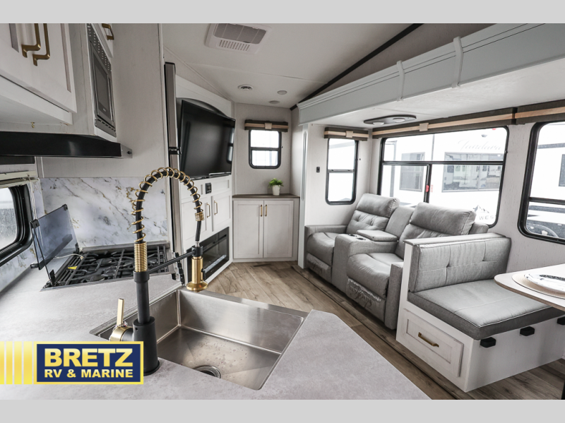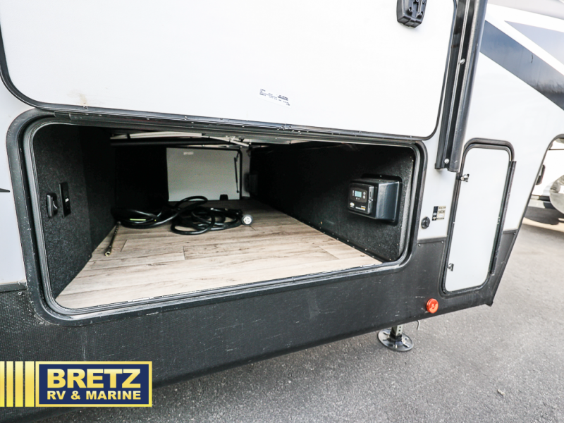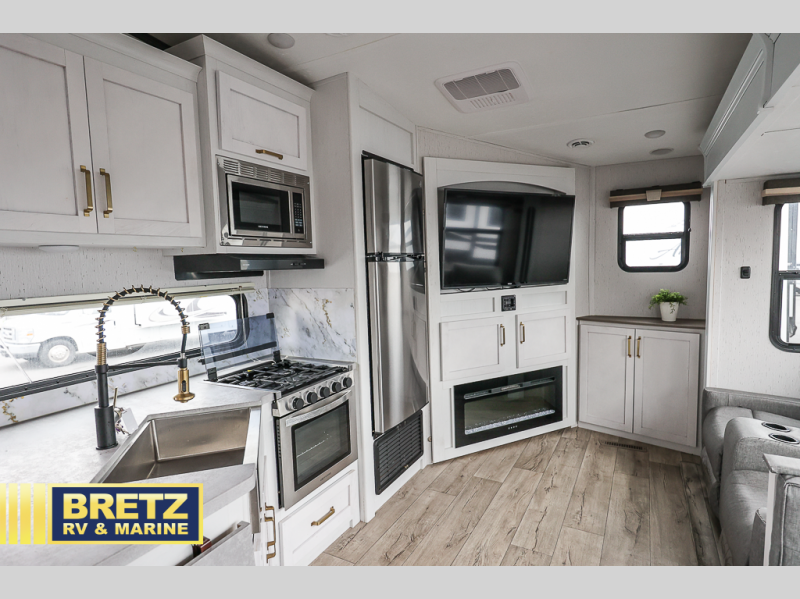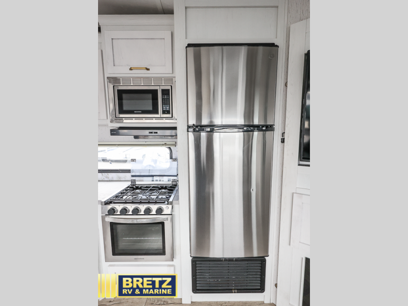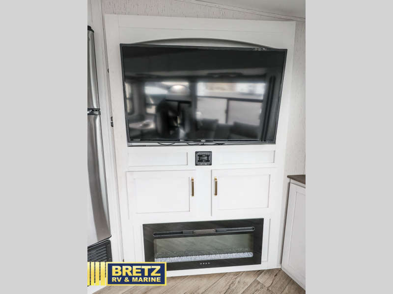 This fifth wheel is the perfect couple's fifth wheel! Inside the front private bedroom there is a queen bed for you to enjoy a good night's rest and a wardrobe slide to keep your clothes looking their best. You can freshen up each morning in the full bathroom with the shower and then head to the kitchen to fry up some eggs on the glass top three burner range with a 21" oven for cinnamon rolls to cook at the same time. You could even prepare breakfast outside with the outdoor kitchen. After a fun day at the beach, you can relax on the theater seating across from the entertainment center with a fireplace and 50" LED TV to watch your favorite movies!