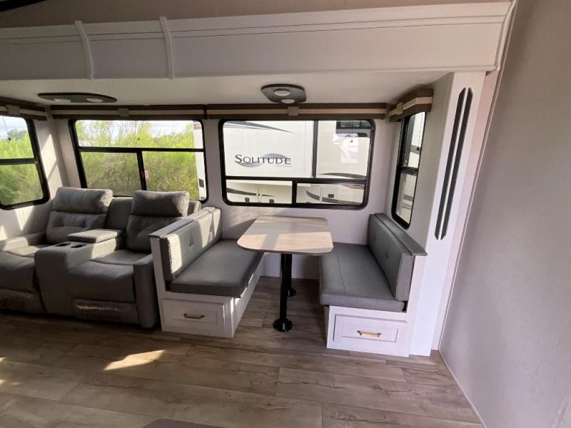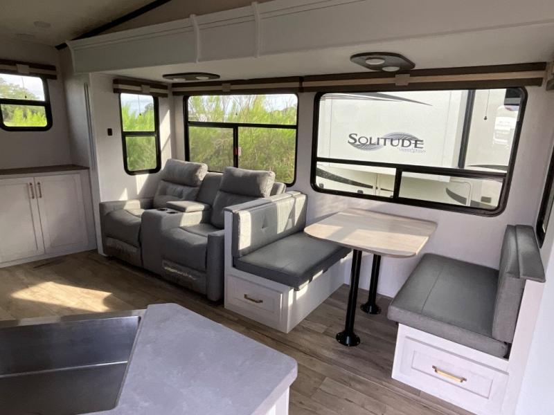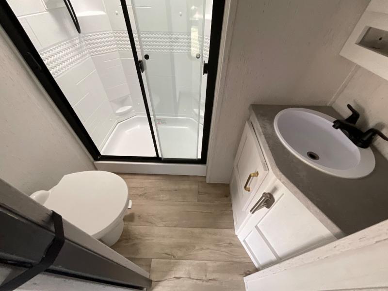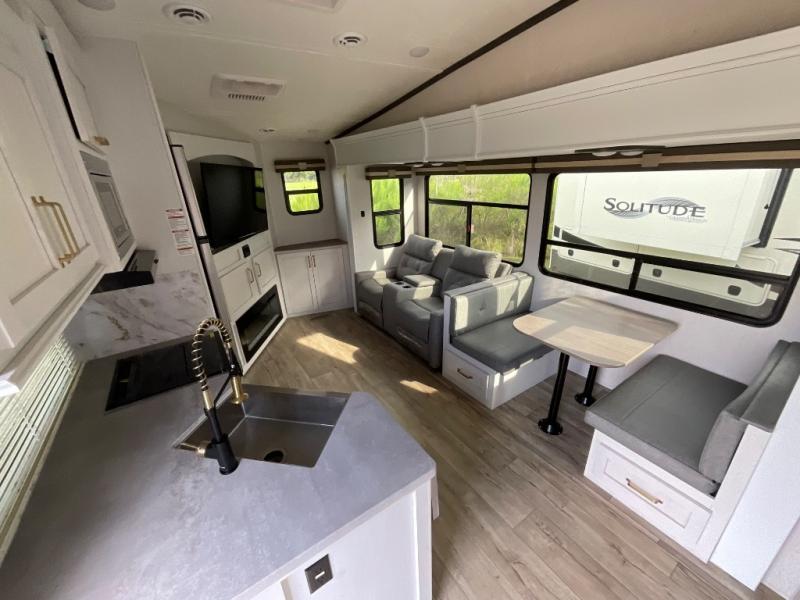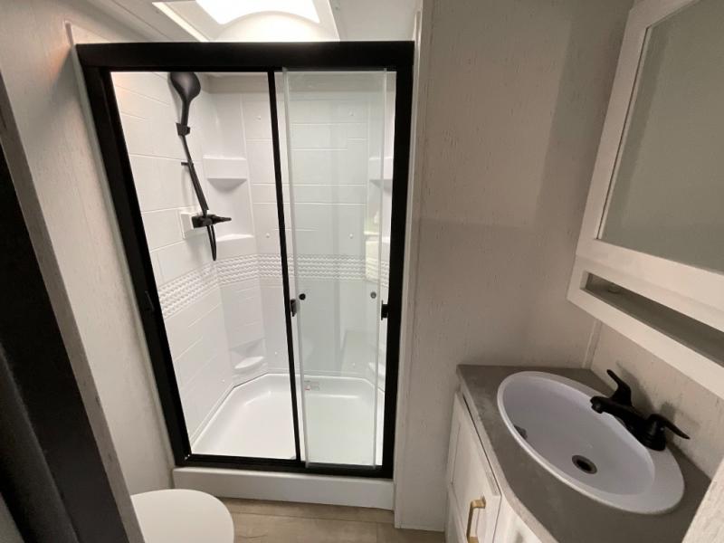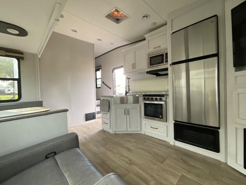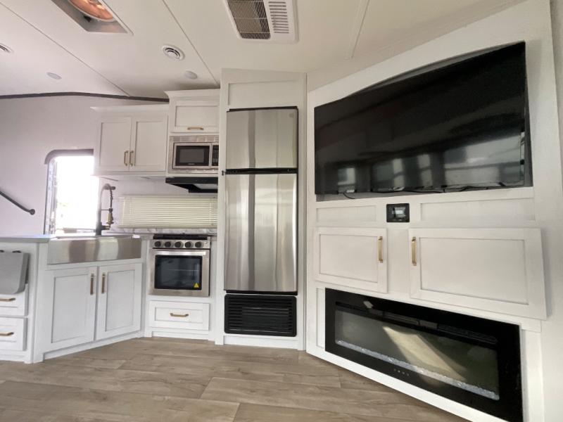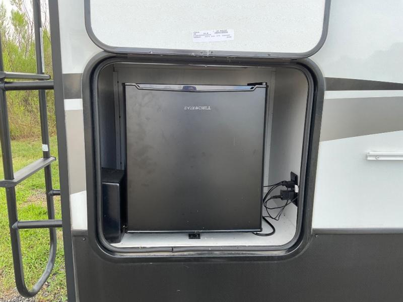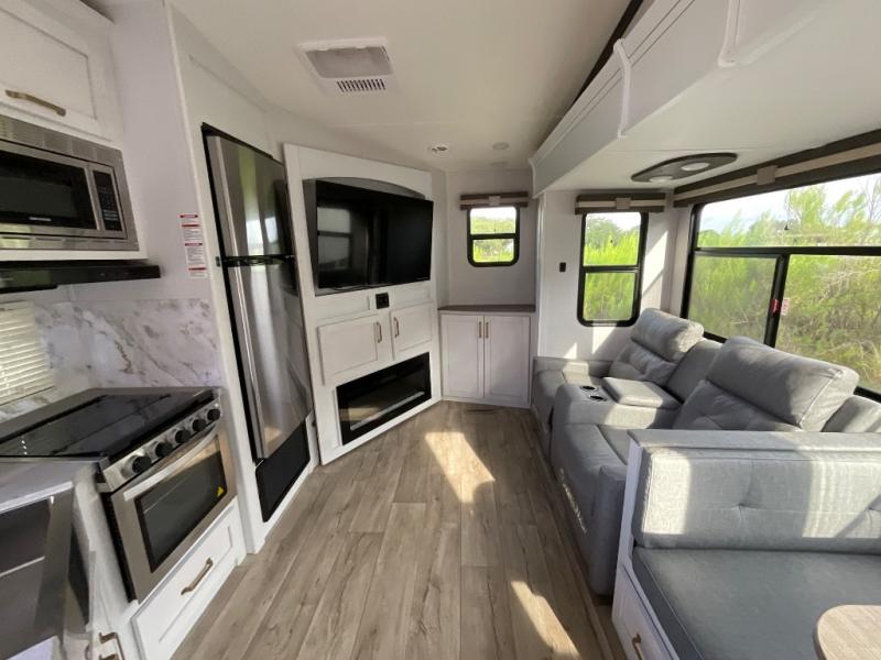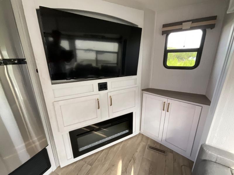 This fifth wheel is the perfect couple's fifth wheel! Inside the front private bedroom there is a queen bed for you to enjoy a good night's rest and a wardrobe slide to keep your clothes looking their best. You can freshen up each morning in the full bathroom with the shower and then head to the kitchen to fry up some eggs on the glass top three burner range with a 21" oven for cinnamon rolls to cook at the same time. You could even prepare breakfast outside with the outdoor kitchen. After a fun day at the beach, you can relax on the theater seating across from the entertainment center with a fireplace and 50" LED TV to watch your favorite movies!