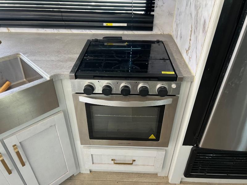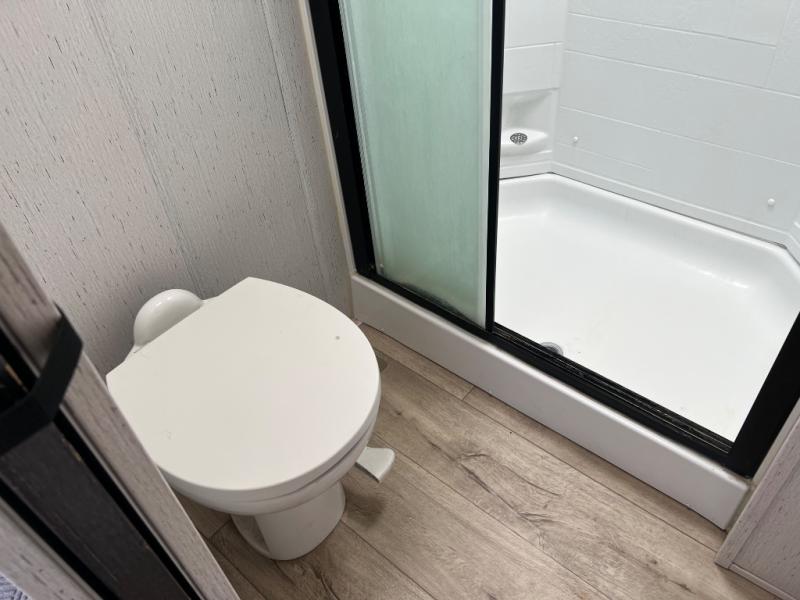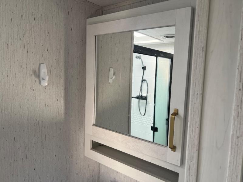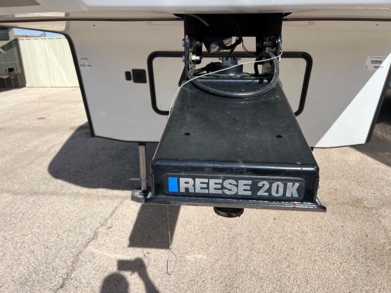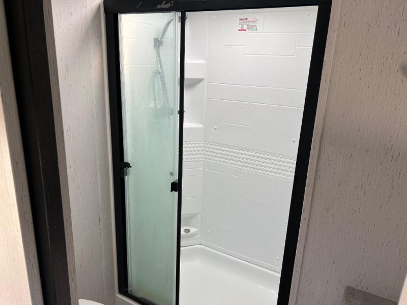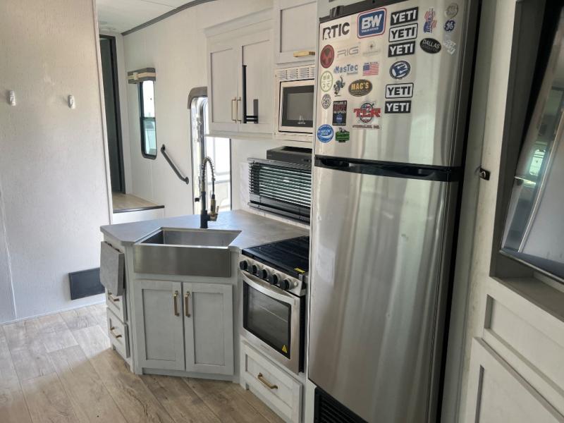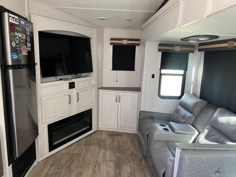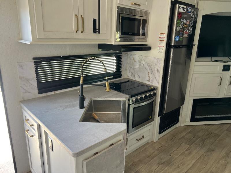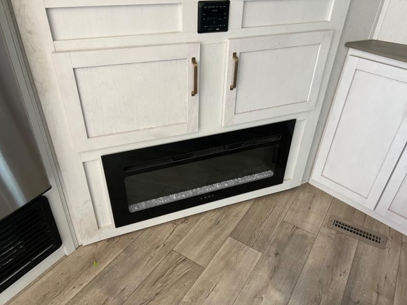 This fifth wheel is the perfect couple's fifth wheel! Inside the front private bedroom there is a queen bed for you to enjoy a good night's rest and a wardrobe slide to keep your clothes looking their best. You can freshen up each morning in the full bathroom with the shower and then head to the kitchen to fry up some eggs on the glass top three burner range with a 21" oven for cinnamon rolls to cook at the same time. You could even prepare breakfast outside with the outdoor kitchen. After a fun day at the beach, you can relax on the theater seating across from the entertainment center with a fireplace and 50" LED TV to watch your favorite movies!