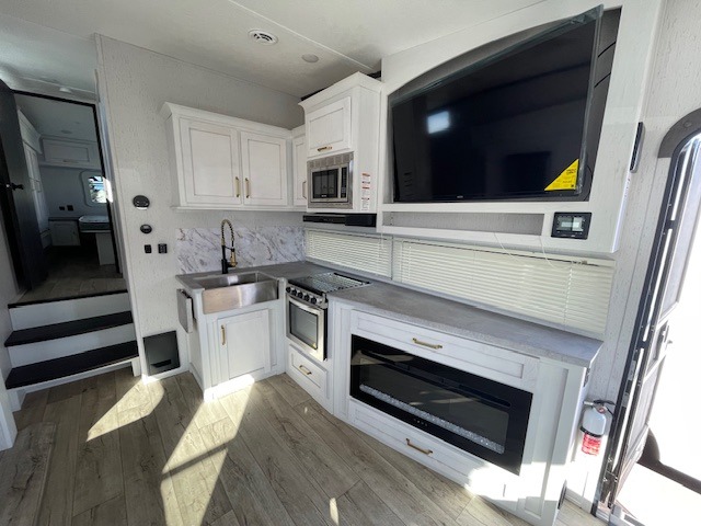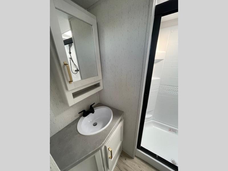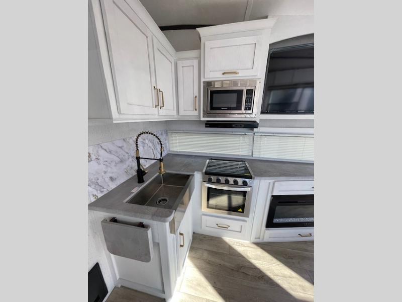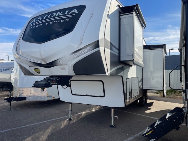 Enjoy traveling in any season with this Astoria fifth wheel featuring an enclosed and heated underbelly. You will adore the stylish fabric choices and upgraded kitchen featuring stainless steel appliances, a high rise faucet, a pull-out trash can, pantry, and coffee hutch with pop-up power station. Enter using the solid triple entry steps, then open things up with the SOLO ONE Control which you can also access through a mobile app on your phone. With the SOLO ONE Control you can conveniently control your slides, awning, and lighting, plus receive alerts on system status for low battery voltage and/or tank levels as well. You will appreciate the gas/electric DSI water heater when showering or doing dishes, and the queen bed will offer you comfort and tranquility at night. A U-shaped dinette along the rear wall is great for dining or entertaining since there is plenty of room for all of your guests. And, storage is also a plus both inside and out with a full pass-through storage compartment on the exterior for all of your camping gear.